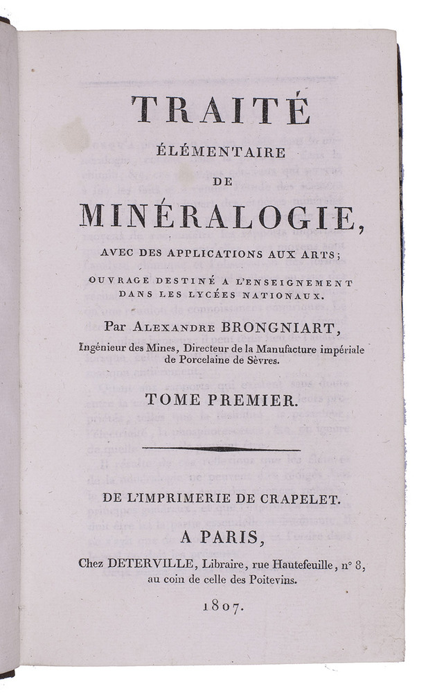 First edition of a work on mineralogy by the French geologist and mineralogist Alexandre Brongniart (1770-1847), intended as a textbook for the mineralogical courses given by Brongniart and René Just Haüy at the Faculté des Sciences and the Muséum d'Histoire Naturelle. "For this purpose, the author created a simple classification system based primarily on physical properties, but also influenced by Haüy's crystallographic theories. Brongniart insisted that studying how minerals occurred as well as their properties would lead to a better understanding of their origin" (Schuh). The engraved plates depict crystals and mining instruments and mechanisms.