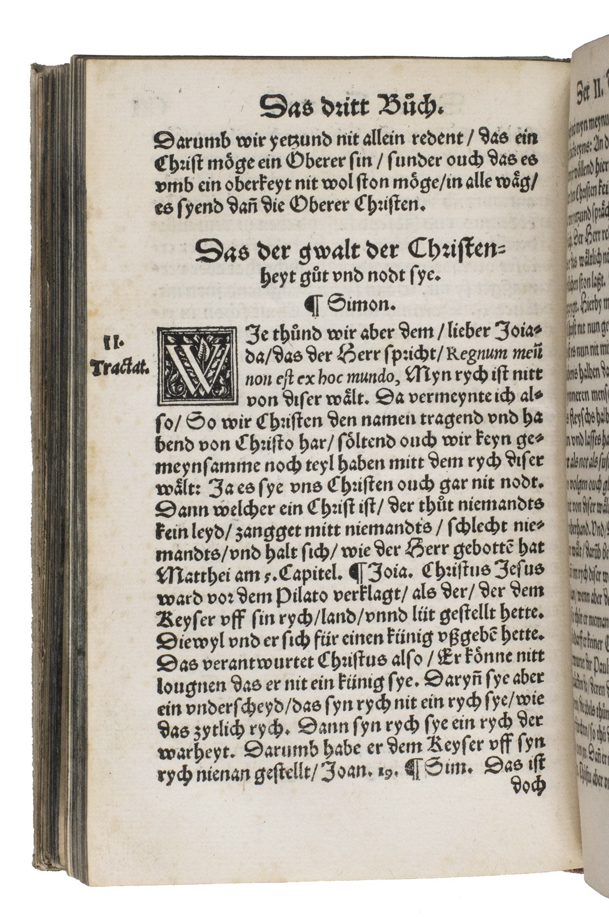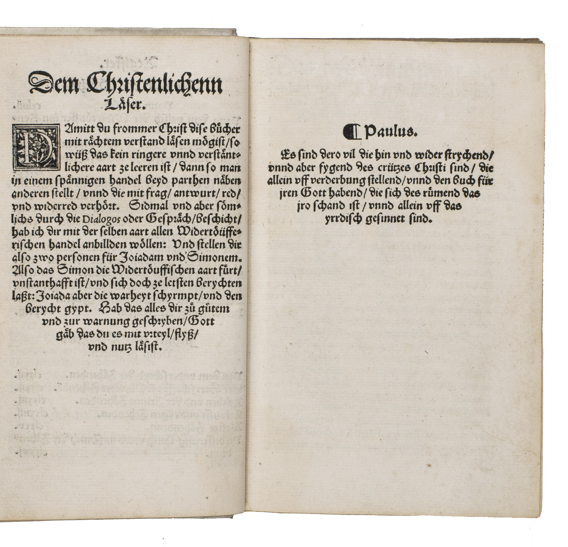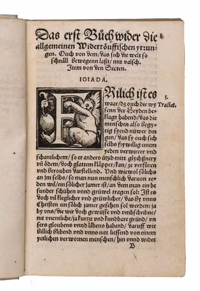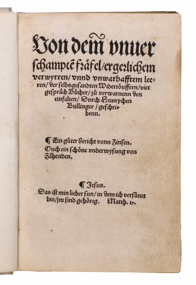 First edition of one of the most important and influential anti-Anabaptist works of the Swiss Reformation. Written and completed at Bremgarten in late 1530 and published in Zurich in 1531, this work marks Heinrich Bullingers (1504-1575) first major intervention in what would become a lifelong campaign against the Anabaptist movement. Cast deliberately in the popular dialogue form, the text stages a disputation between Simon, representing the Anabaptist position, and Jojada, the orthodox Reformed interlocutor, allowing Bullinger to present and systematically refute what he regarded as the movements most dangerous errors.
