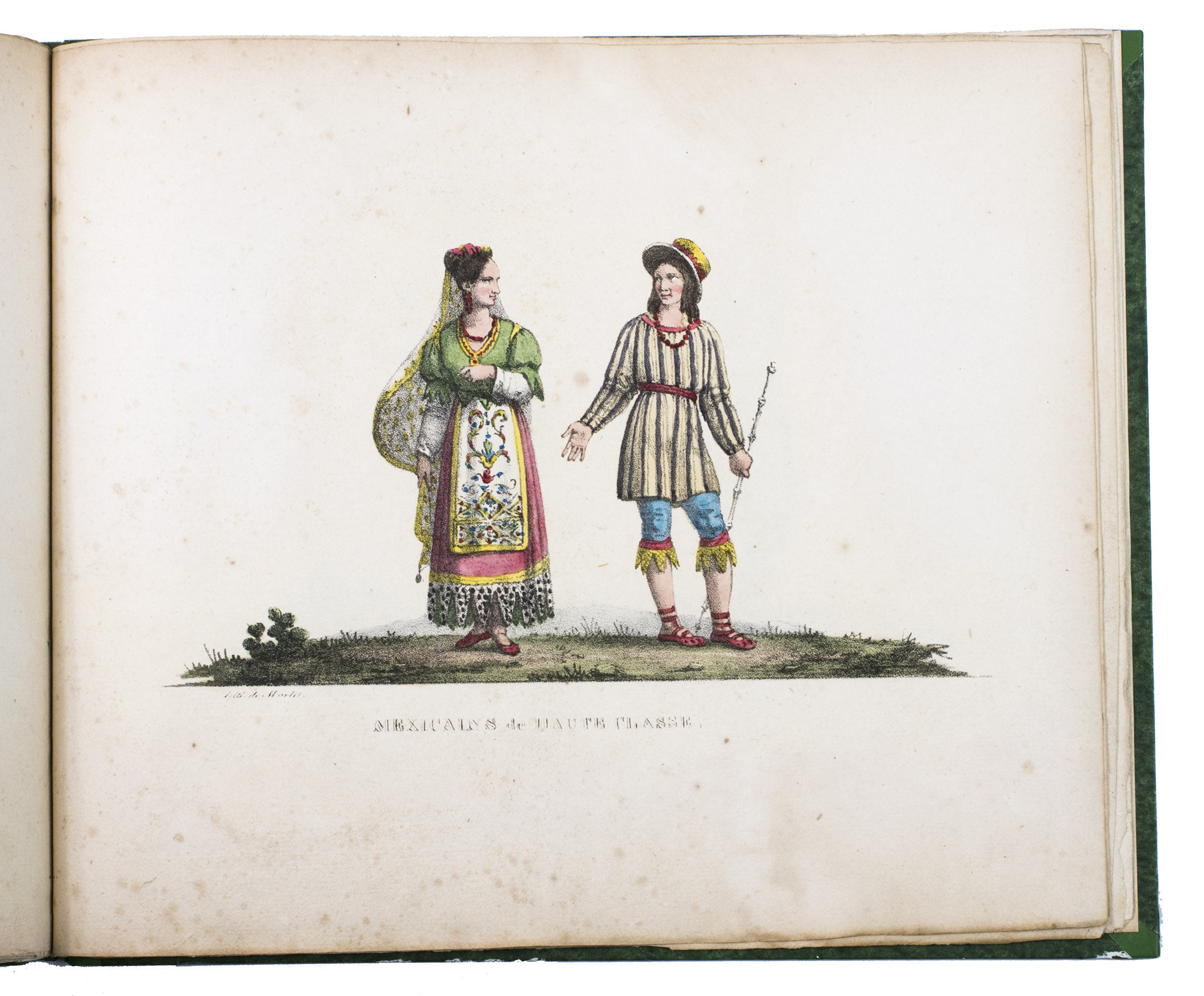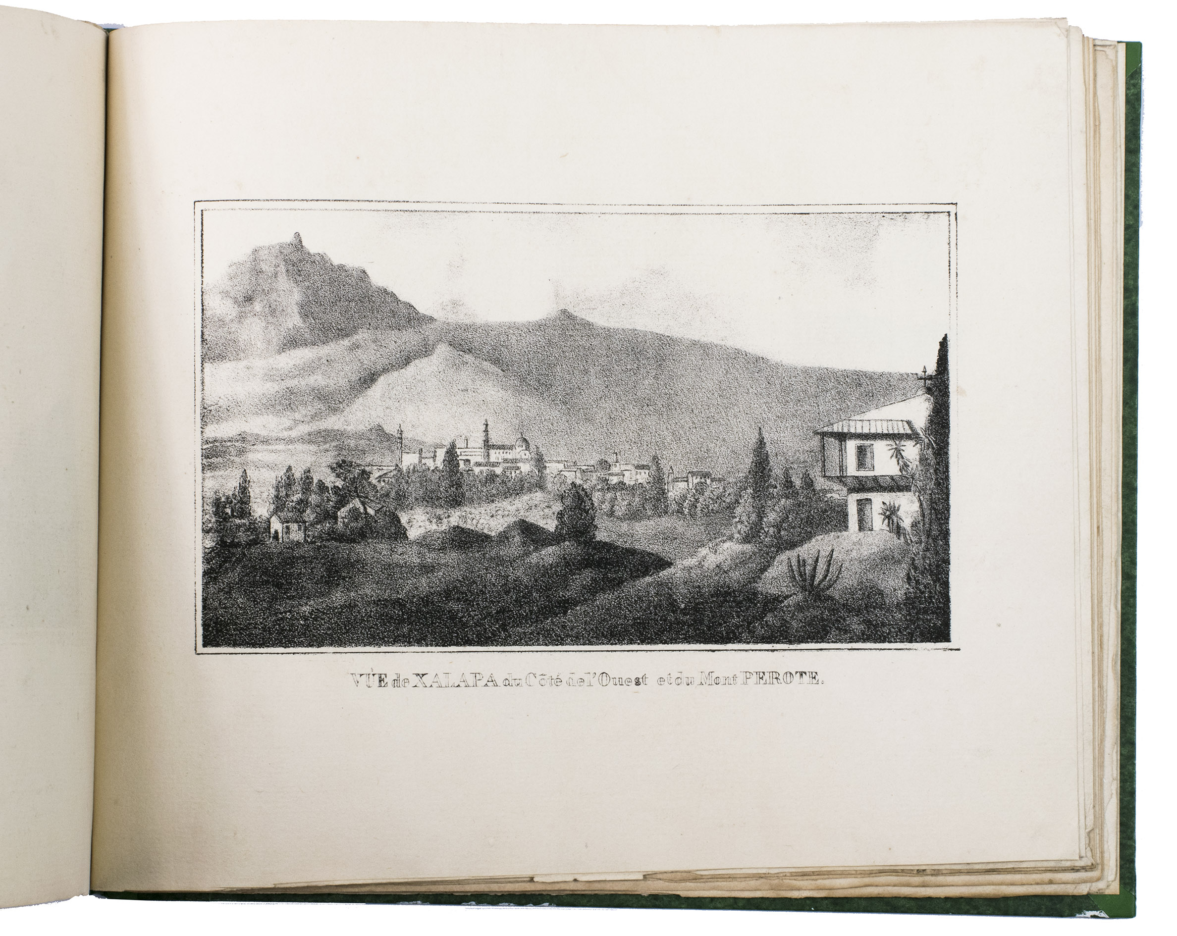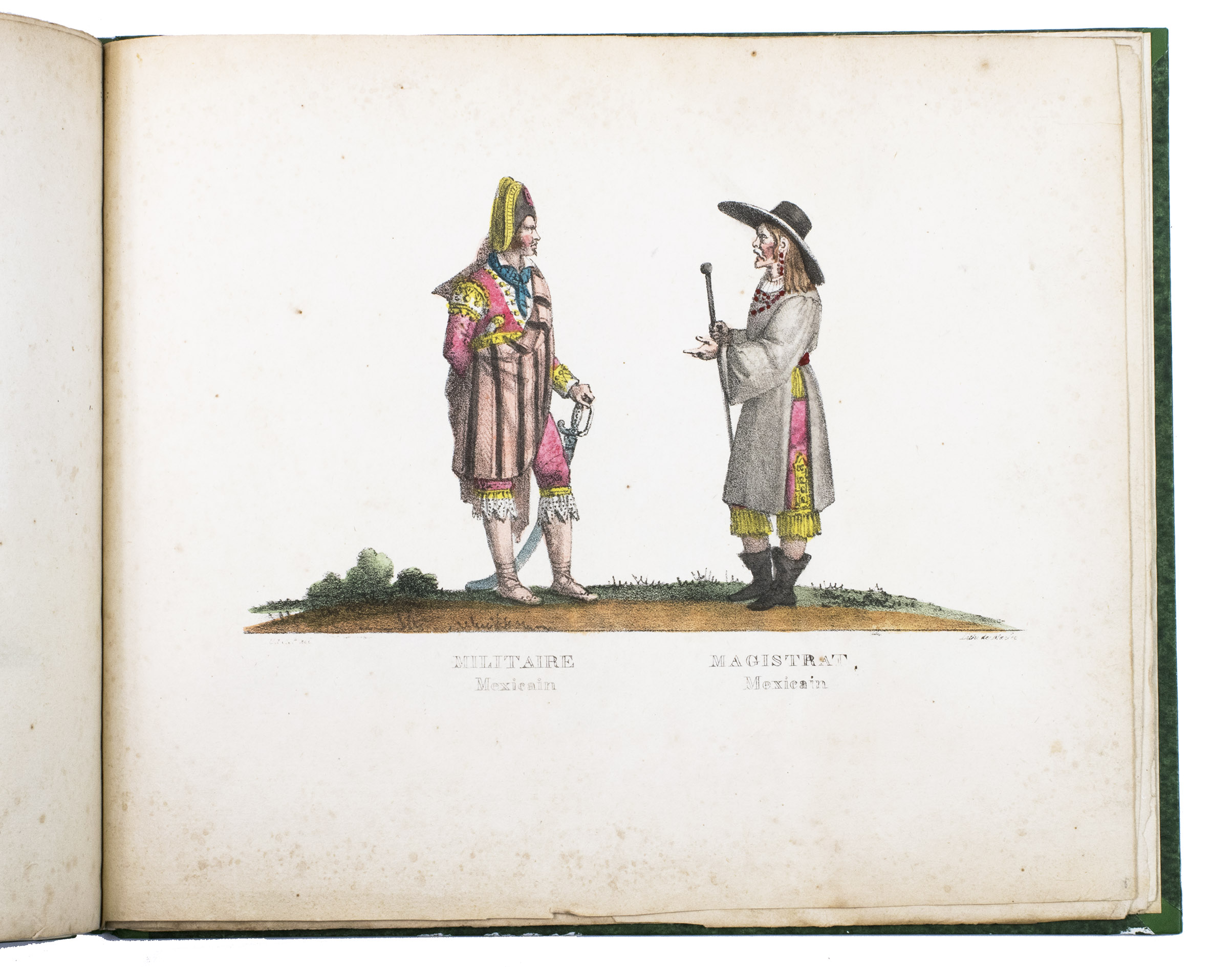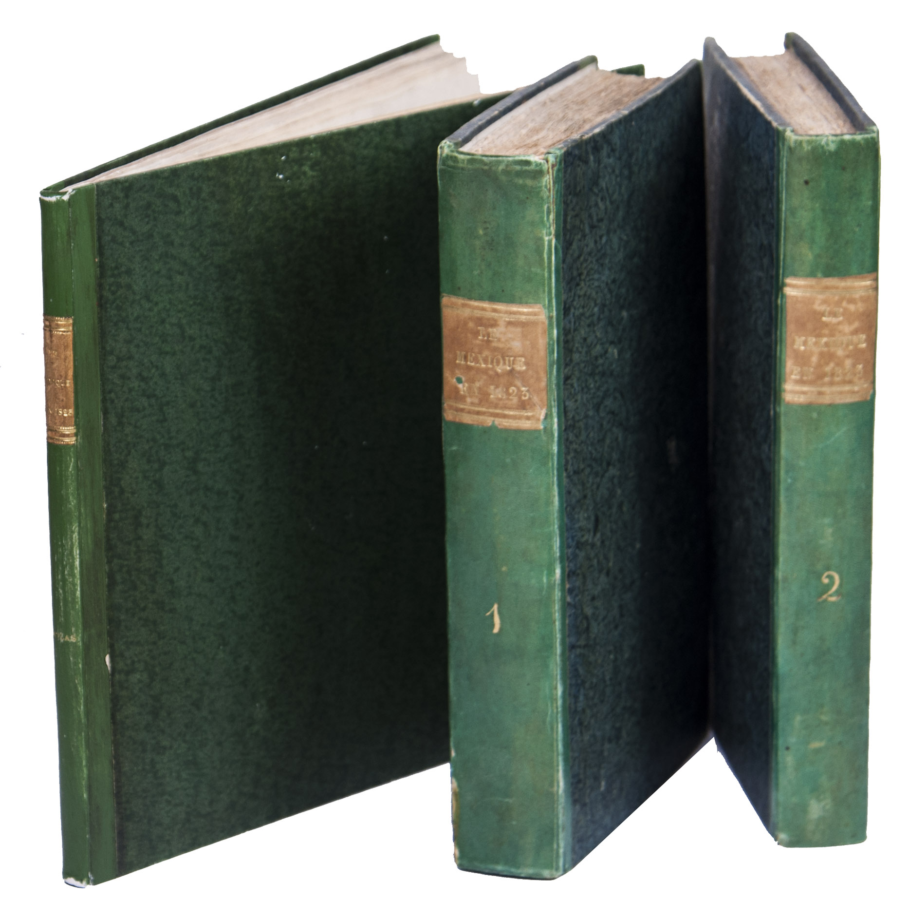 Paris, Alexis-Eymery, 1824. 3 volumes. 8vo (text) and oblong 4to (atlas). The atlas contains 2 large folding maps (44.2 x 32 and 32 x 35.5 cm), and 19 lithographed plates by Marlet, including 6 nicely coloured by hand and one folding (14 x 36.5 cm), depicting views, costumes and sculpture of Mexico. Contemporary half green painted vellum, green paste paper sides, with brown title labels lettered in gold on the spines. [4], III, LXXII, 364; [4], 370, [2]; 11 pp.