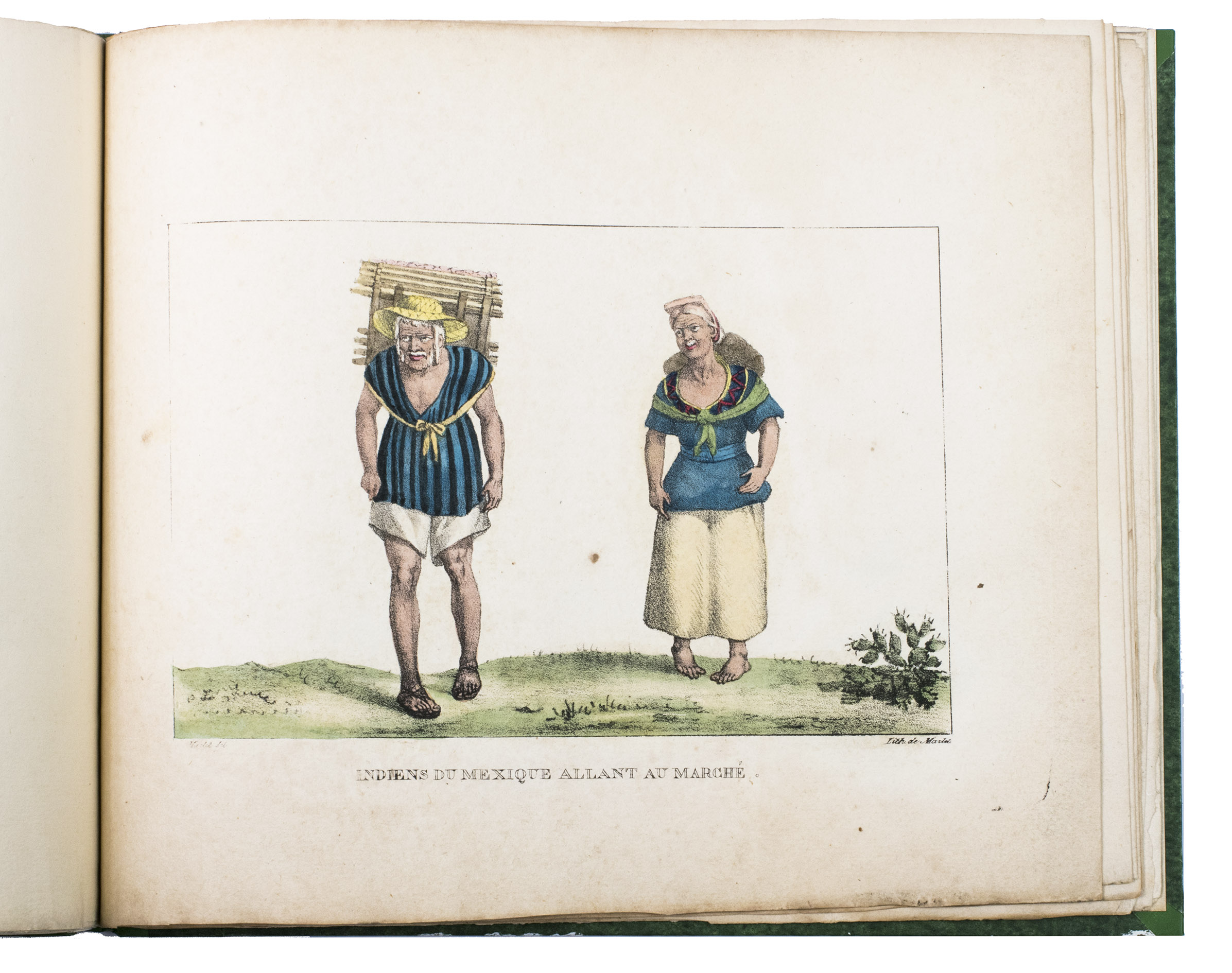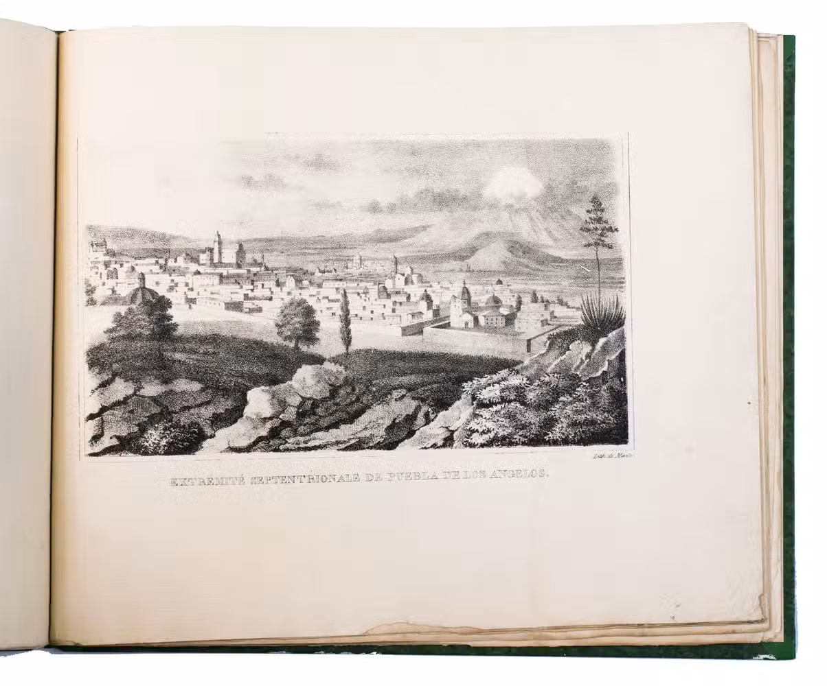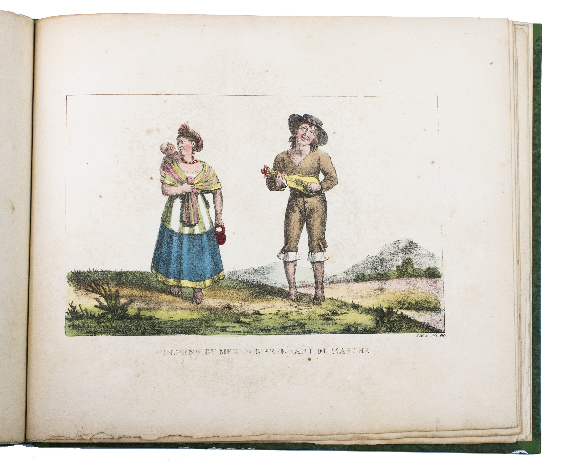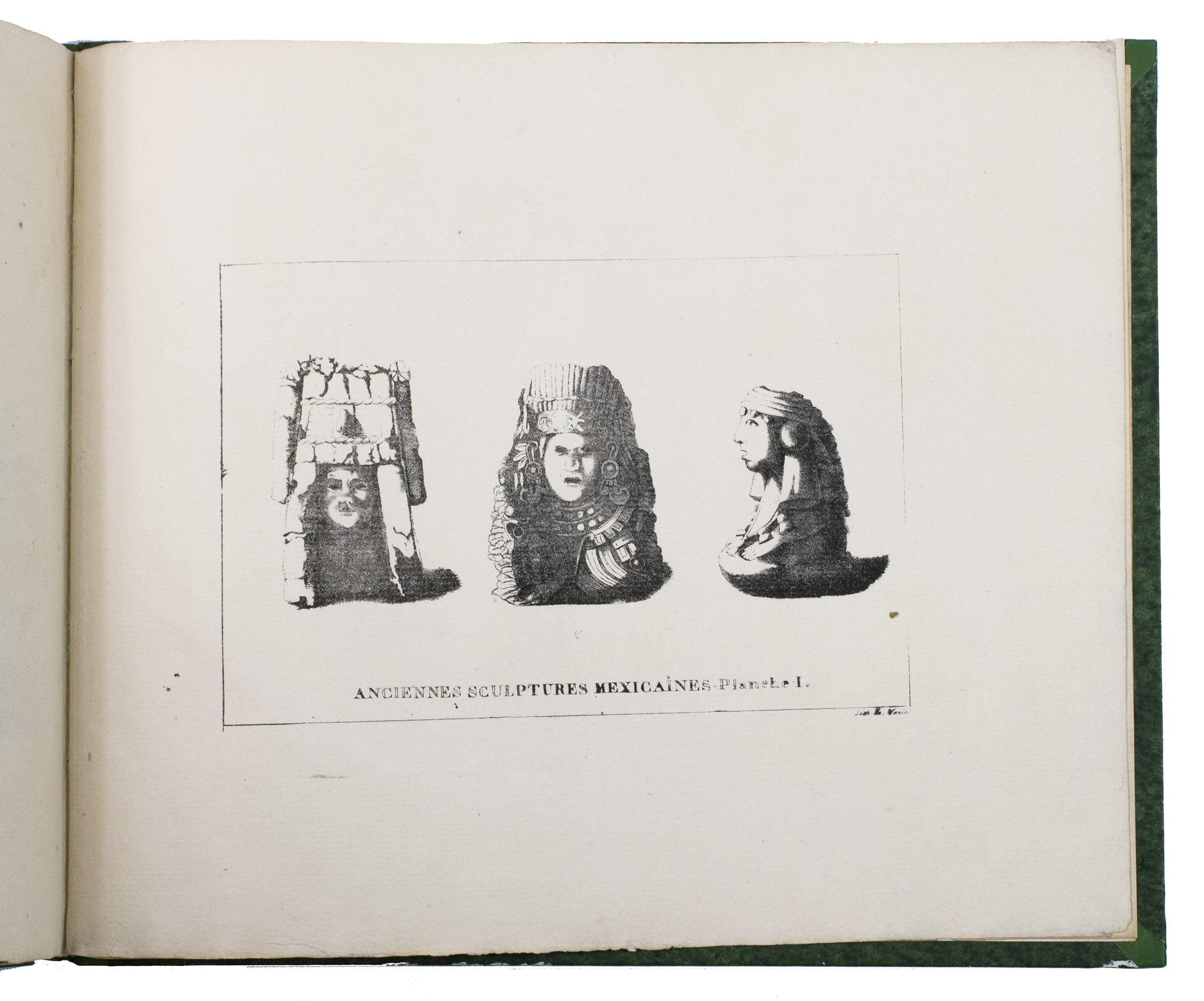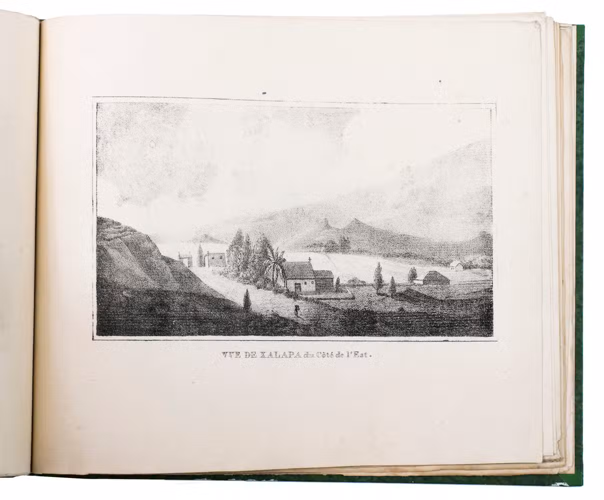 Paris, Alexis-Eymery, 1824. 3 volumes. 8vo (text) and oblong 4to (atlas). The atlas contains 2 large folding maps (44.2 x 32 and 32 x 35.5 cm), and 19 lithographed plates by Marlet, including 6 nicely coloured by hand and one folding (14 x 36.5 cm), depicting views, costumes and sculpture of Mexico. Contemporary half green painted vellum, green paste paper sides, with brown title labels lettered in gold on the spines. [4], III, LXXII, 364; [4], 370, [2]; 11 pp.