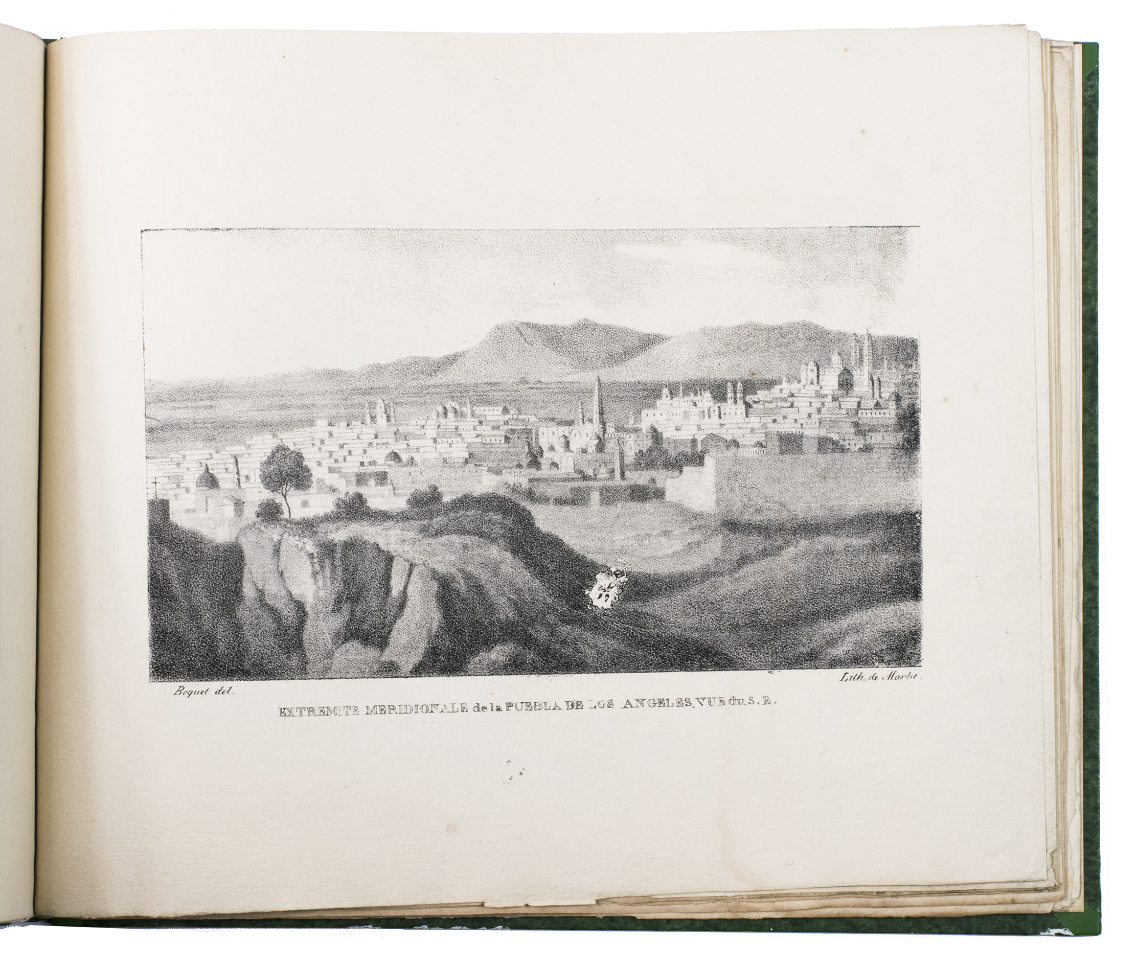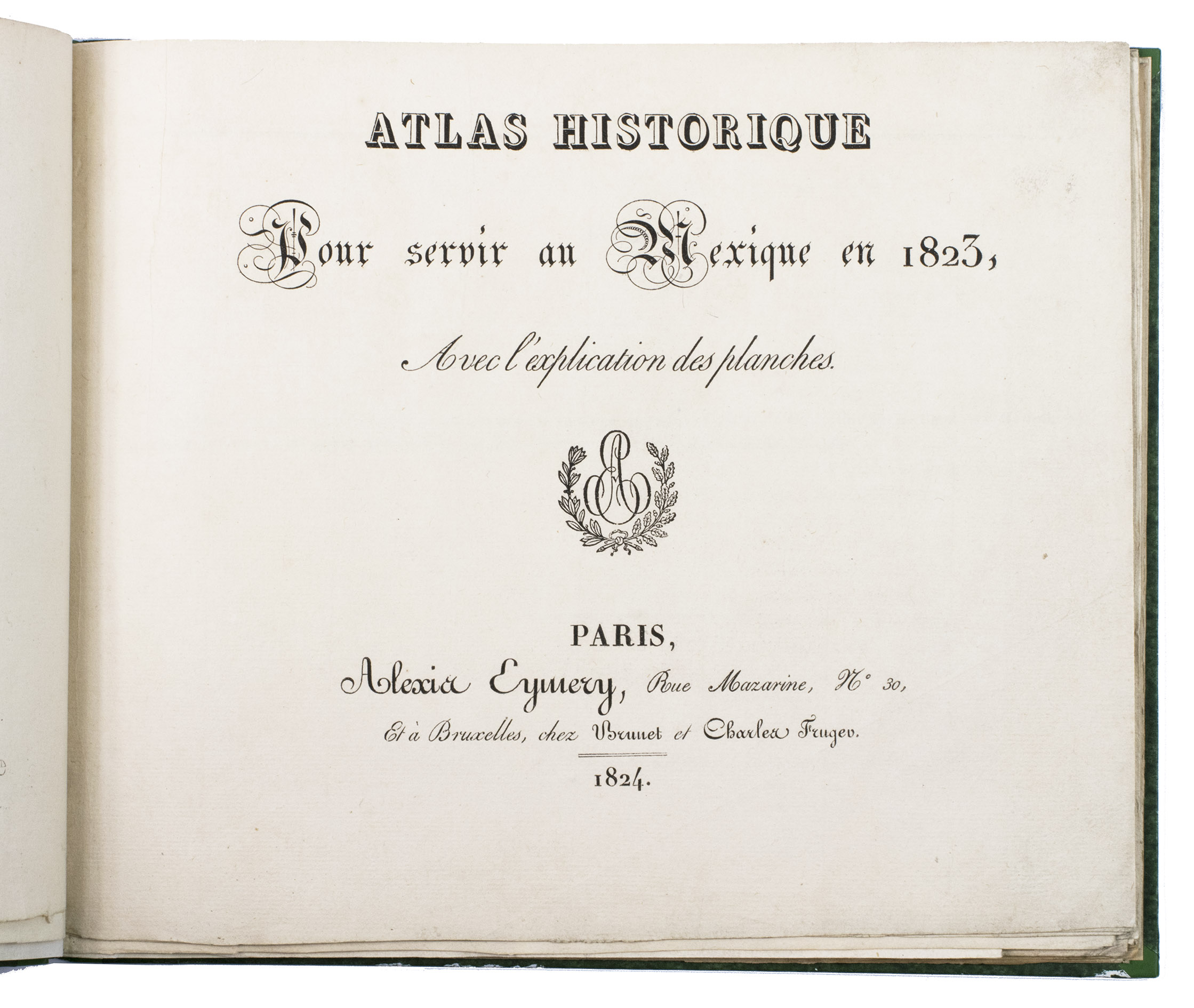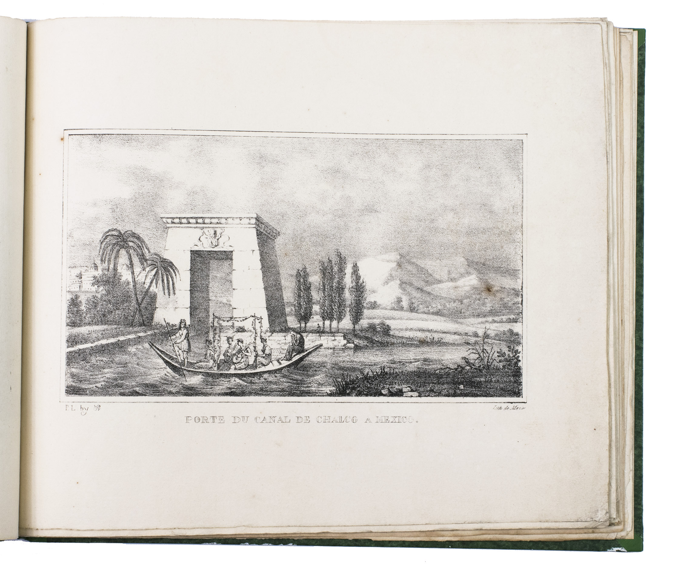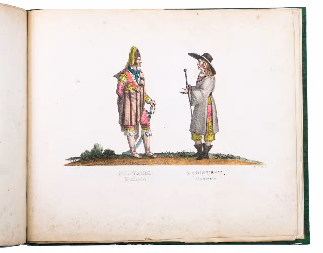 Paris, Alexis-Eymery, 1824. 3 volumes. 8vo (text) and oblong 4to (atlas). The atlas contains 2 large folding maps (44.2 x 32 and 32 x 35.5 cm), and 19 lithographed plates by Marlet, including 6 nicely coloured by hand and one folding (14 x 36.5 cm), depicting views, costumes and sculpture of Mexico. Contemporary half green painted vellum, green paste paper sides, with brown title labels lettered in gold on the spines. [4], III, LXXII, 364; [4], 370, [2]; 11 pp.