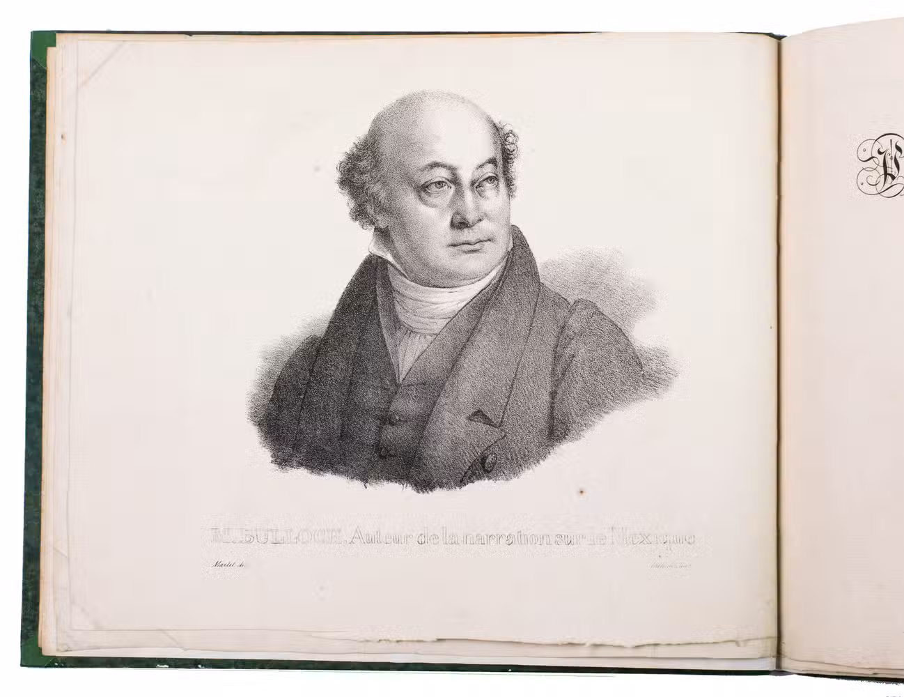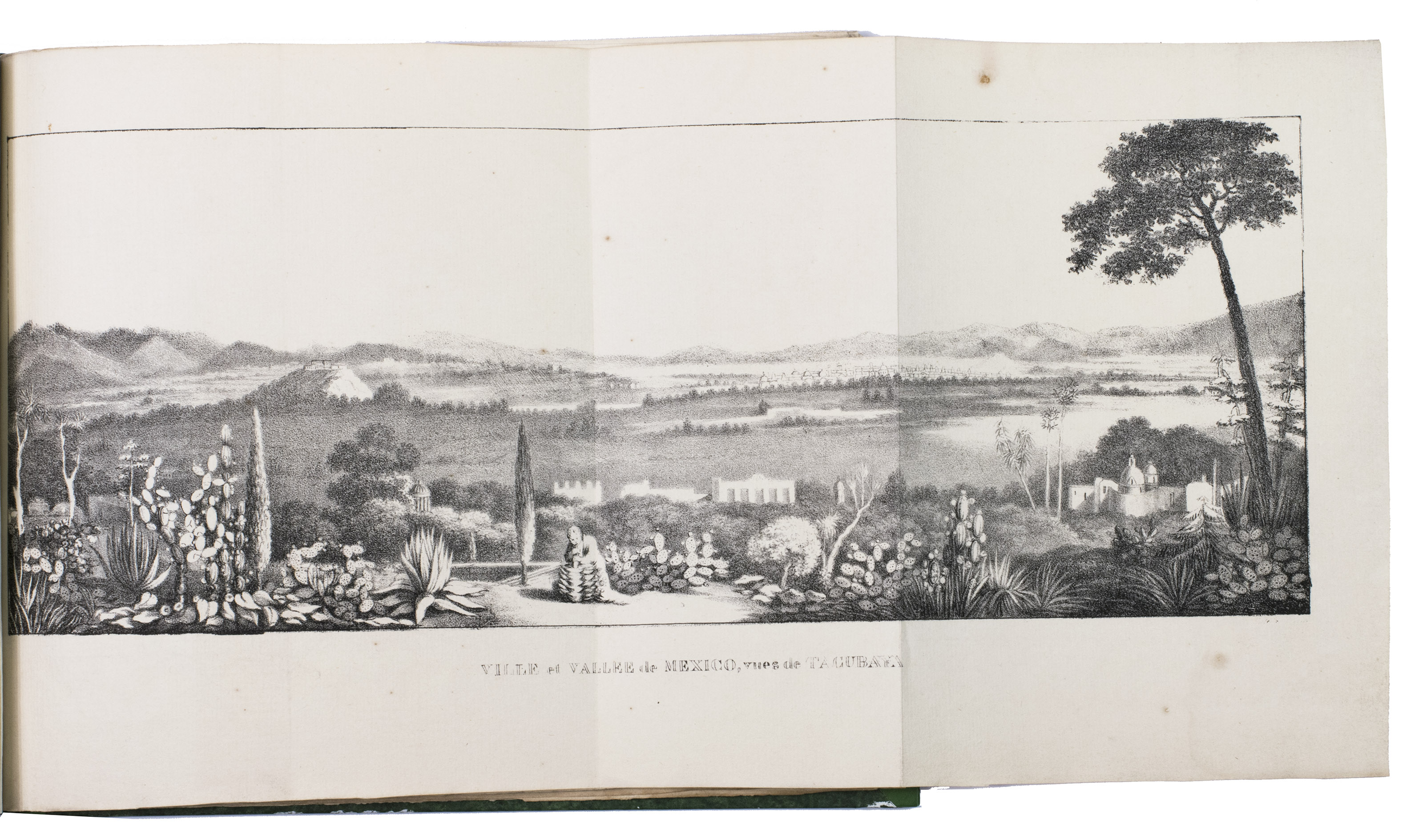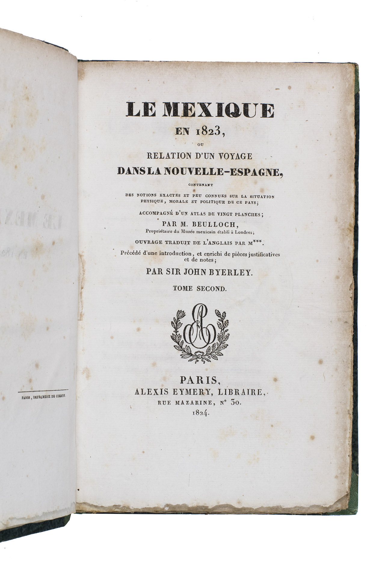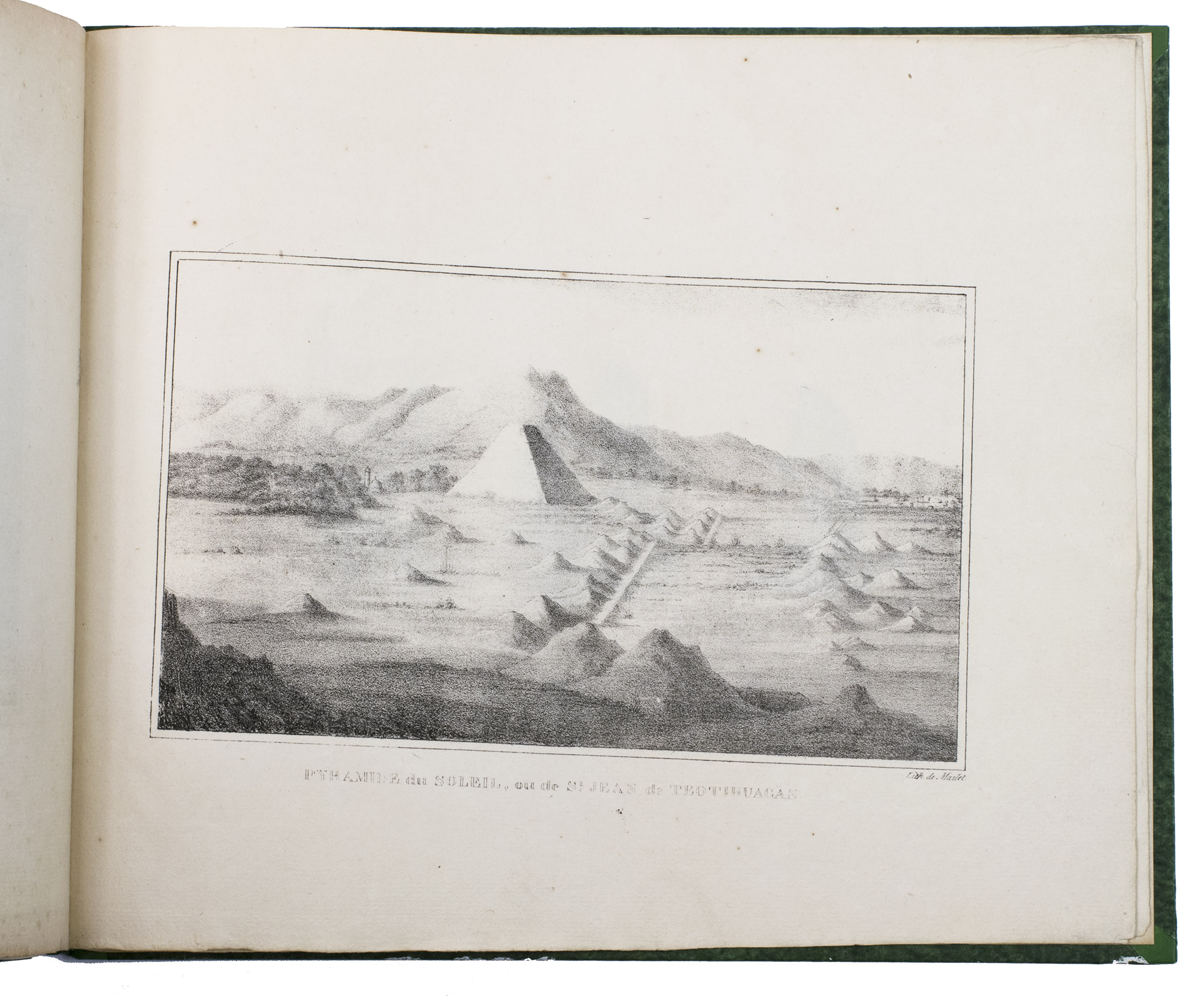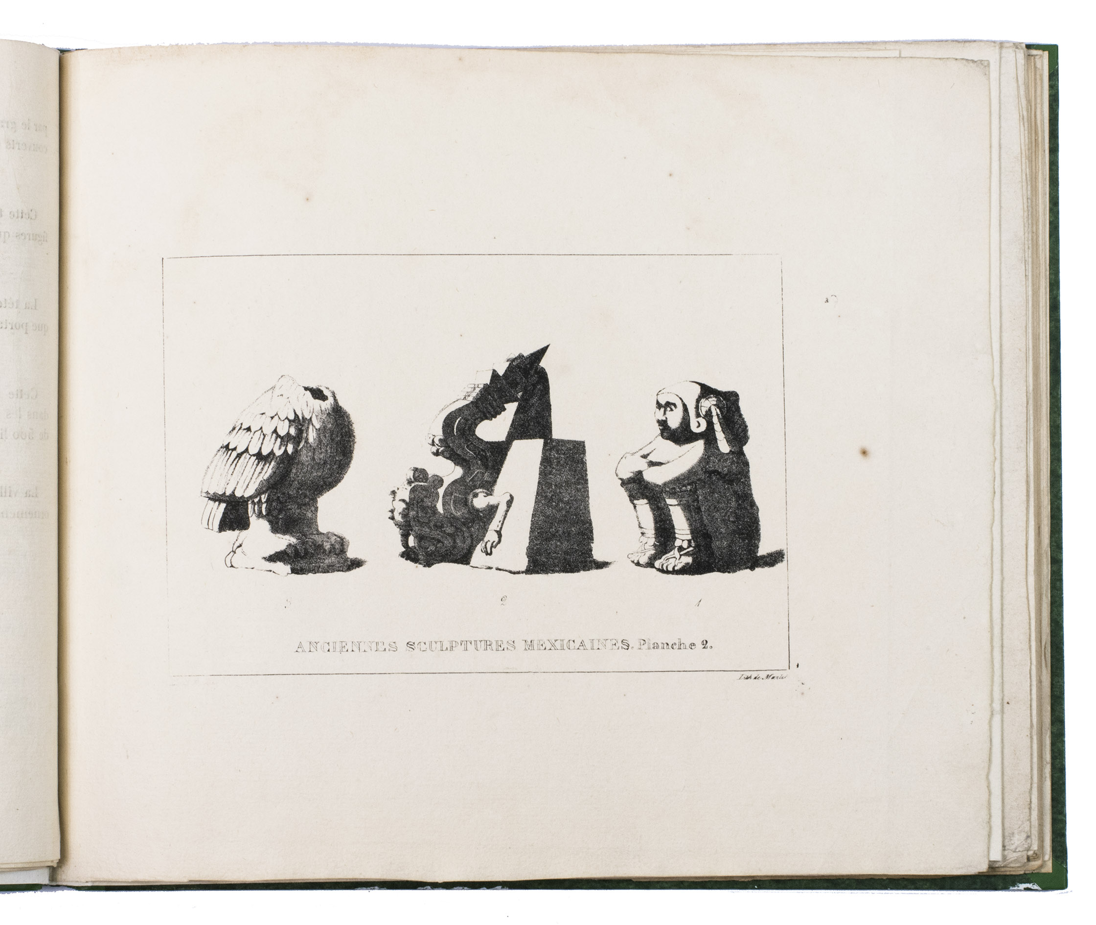 Paris, Alexis-Eymery, 1824. 3 volumes. 8vo (text) and oblong 4to (atlas). The atlas contains 2 large folding maps (44.2 x 32 and 32 x 35.5 cm), and 19 lithographed plates by Marlet, including 6 nicely coloured by hand and one folding (14 x 36.5 cm), depicting views, costumes and sculpture of Mexico. Contemporary half green painted vellum, green paste paper sides, with brown title labels lettered in gold on the spines. [4], III, LXXII, 364; [4], 370, [2]; 11 pp.