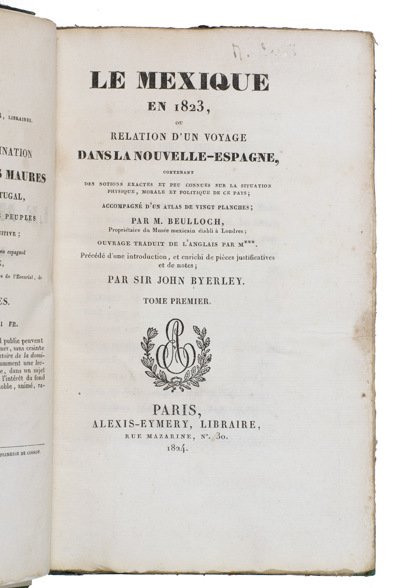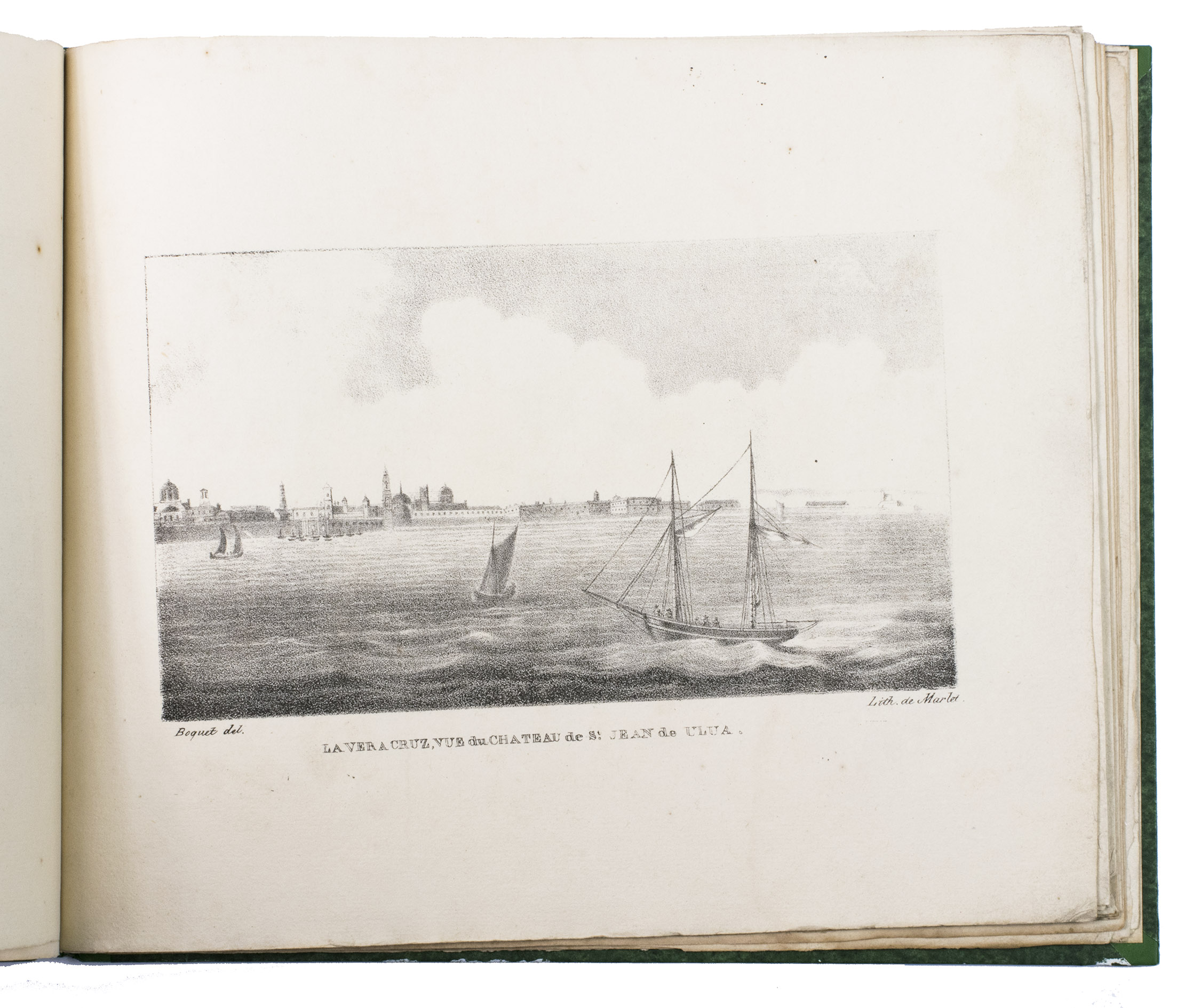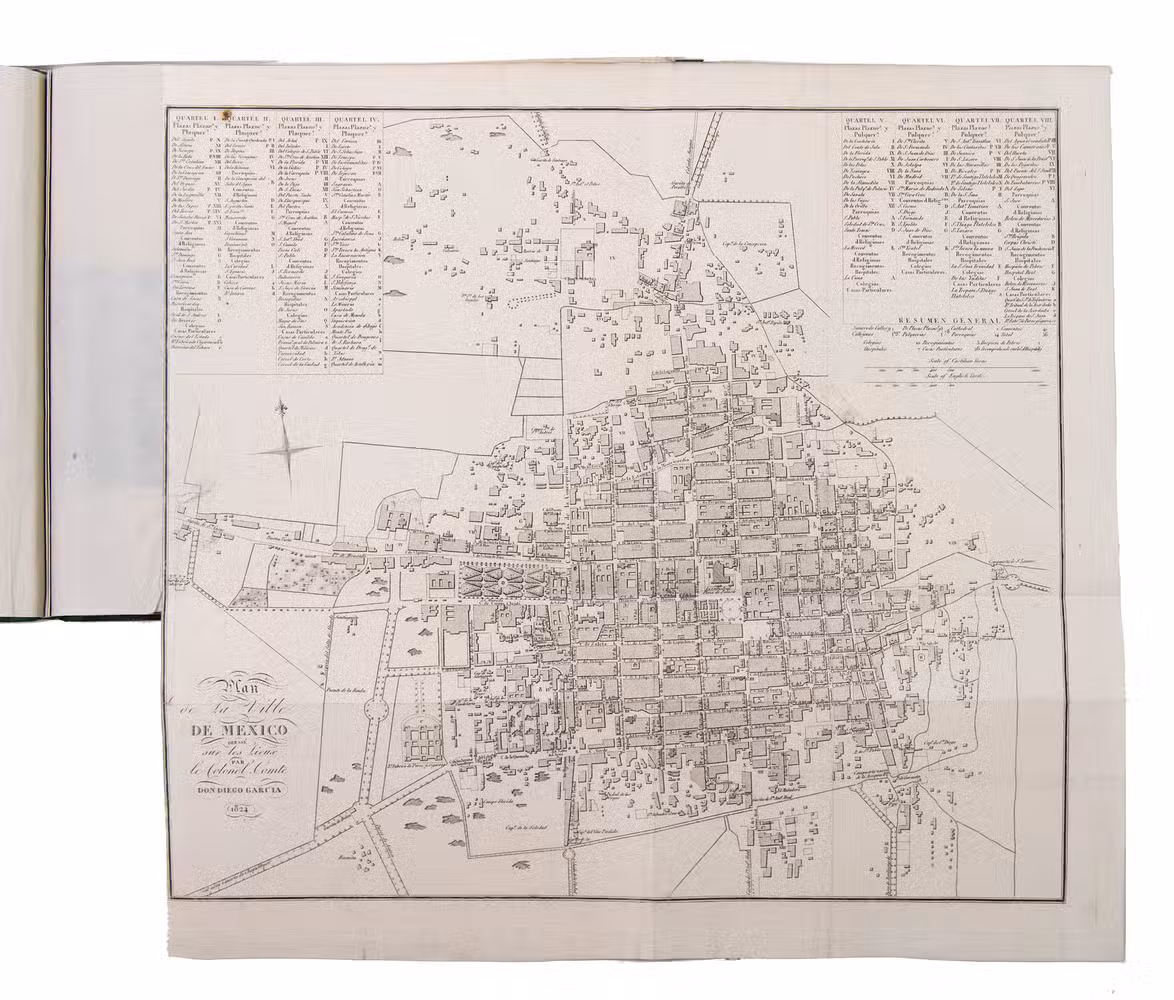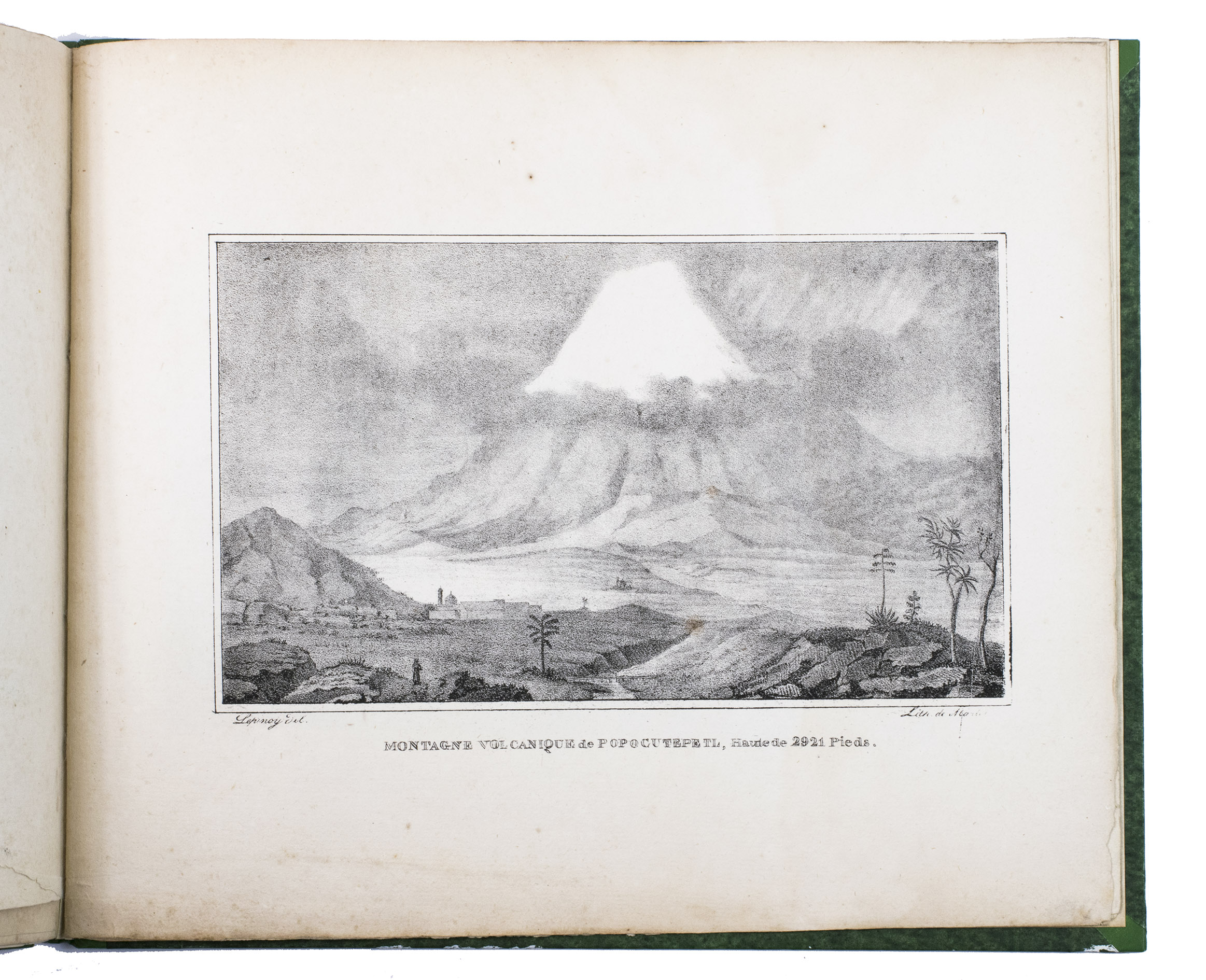 Paris, Alexis-Eymery, 1824. 3 volumes. 8vo (text) and oblong 4to (atlas). The atlas contains 2 large folding maps (44.2 x 32 and 32 x 35.5 cm), and 19 lithographed plates by Marlet, including 6 nicely coloured by hand and one folding (14 x 36.5 cm), depicting views, costumes and sculpture of Mexico. Contemporary half green painted vellum, green paste paper sides, with brown title labels lettered in gold on the spines. [4], III, LXXII, 364; [4], 370, [2]; 11 pp.