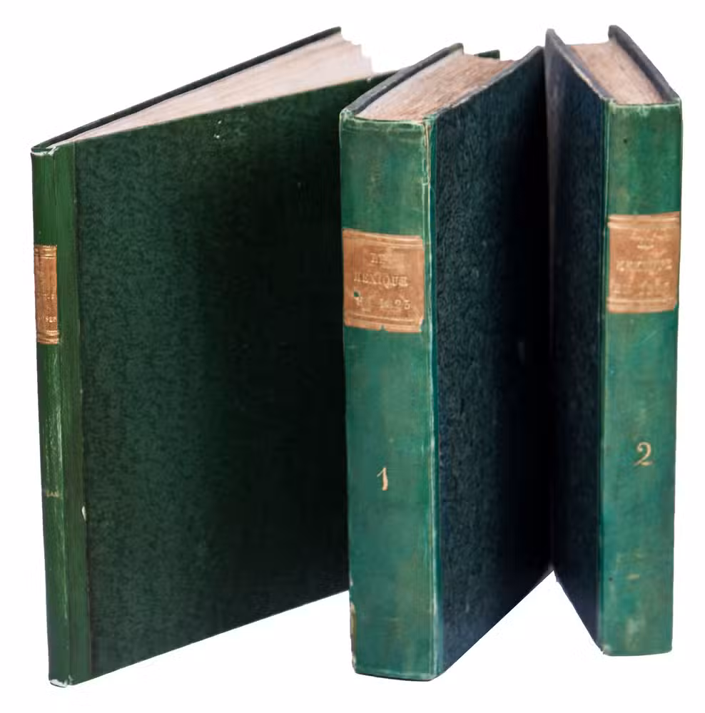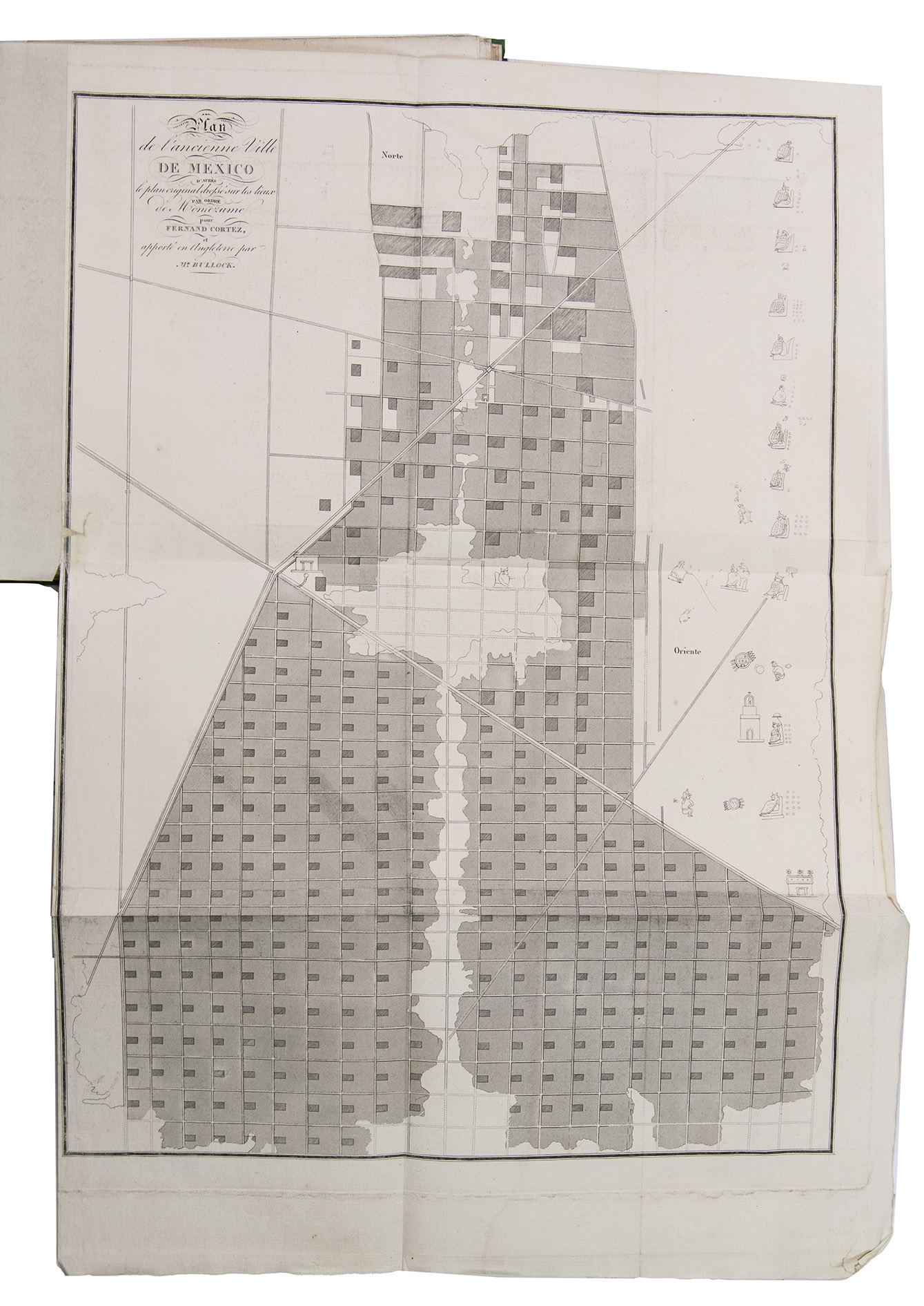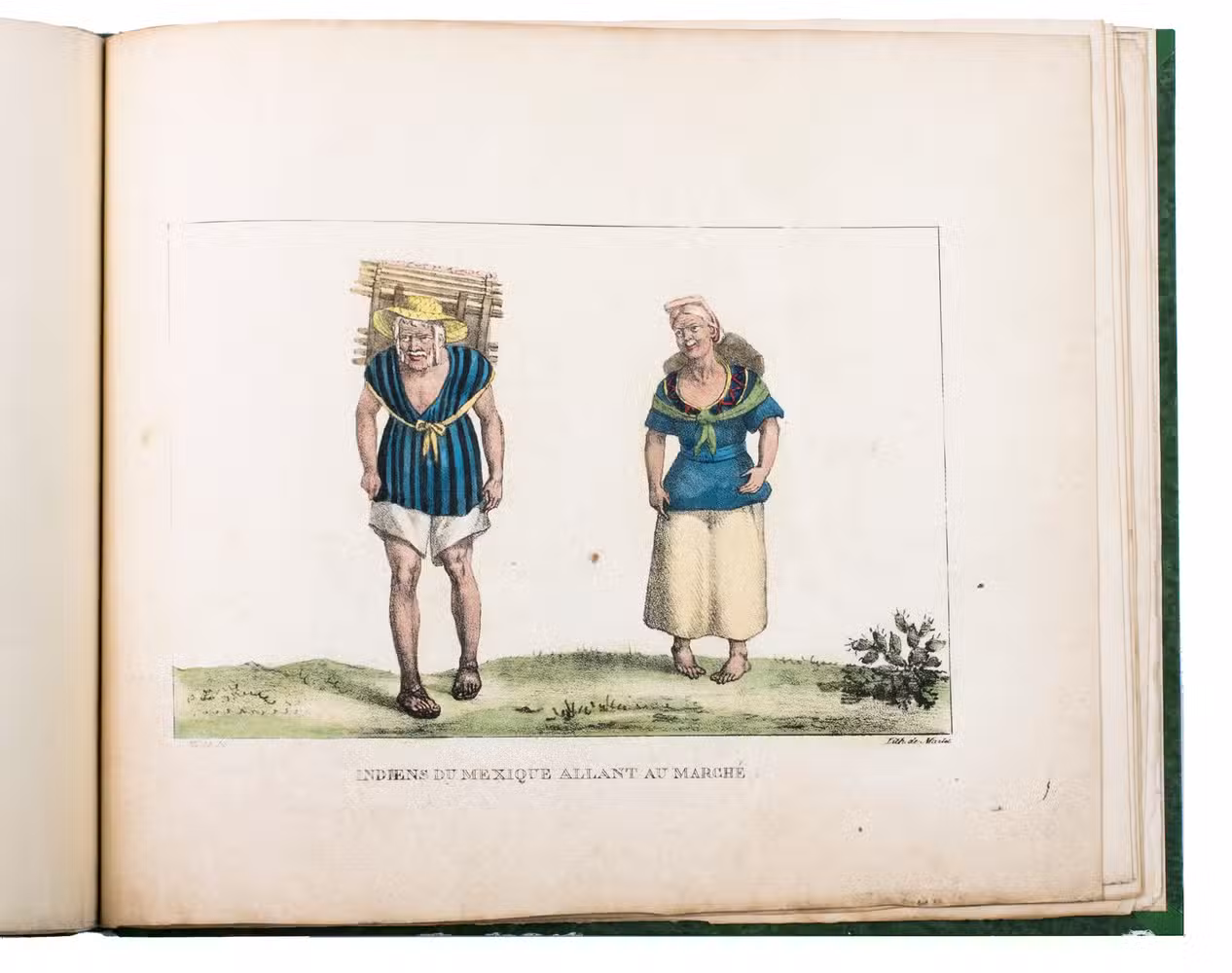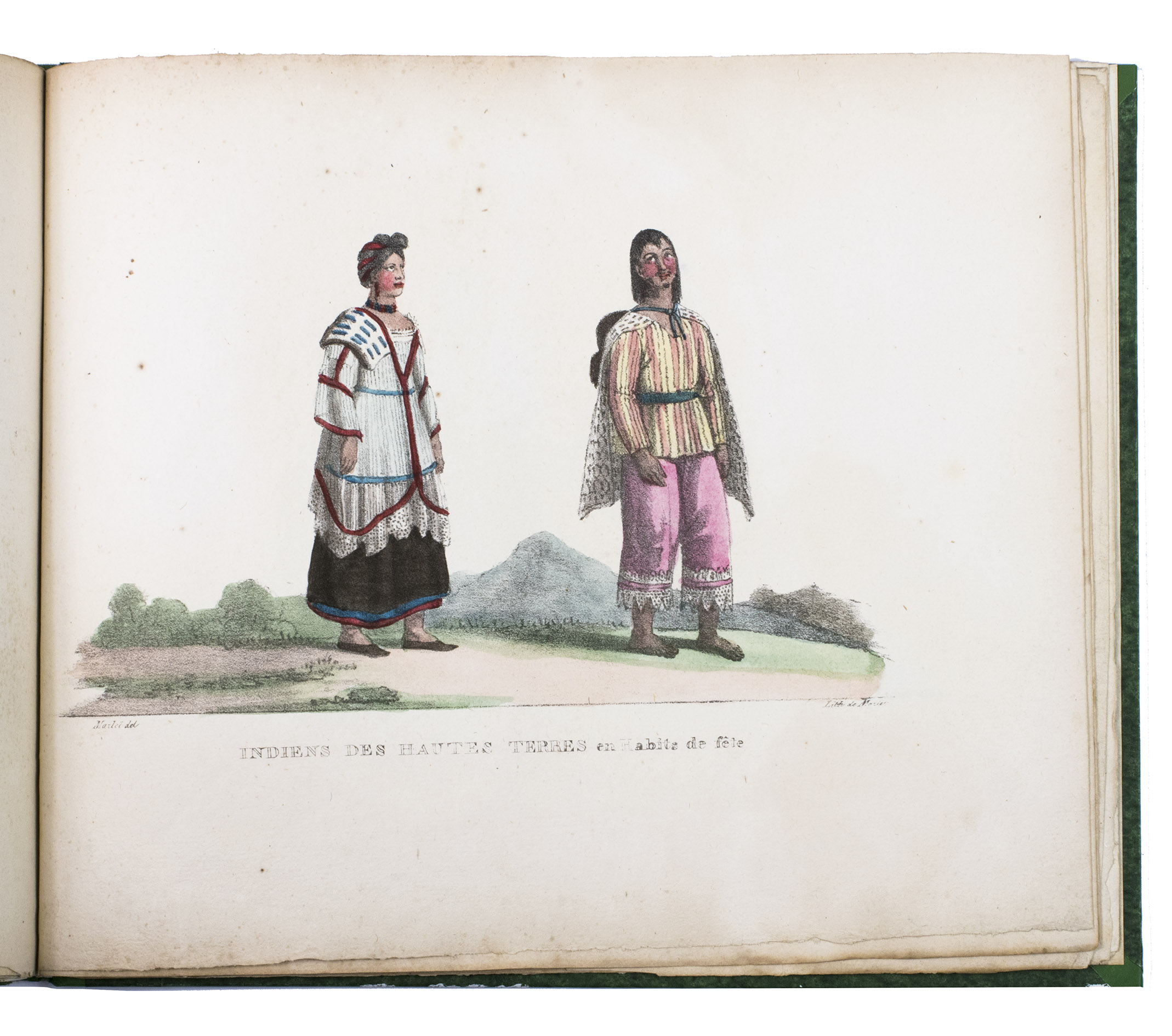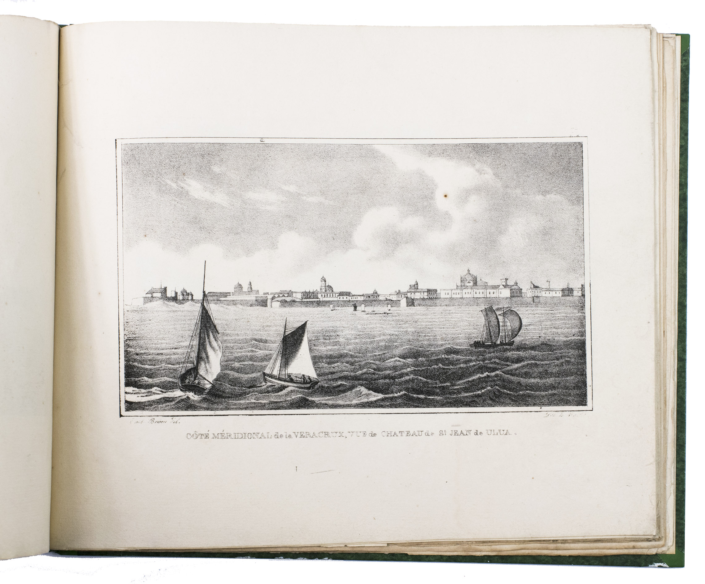 Paris, Alexis-Eymery, 1824. 3 volumes. 8vo (text) and oblong 4to (atlas). The atlas contains 2 large folding maps (44.2 x 32 and 32 x 35.5 cm), and 19 lithographed plates by Marlet, including 6 nicely coloured by hand and one folding (14 x 36.5 cm), depicting views, costumes and sculpture of Mexico. Contemporary half green painted vellum, green paste paper sides, with brown title labels lettered in gold on the spines. [4], III, LXXII, 364; [4], 370, [2]; 11 pp.