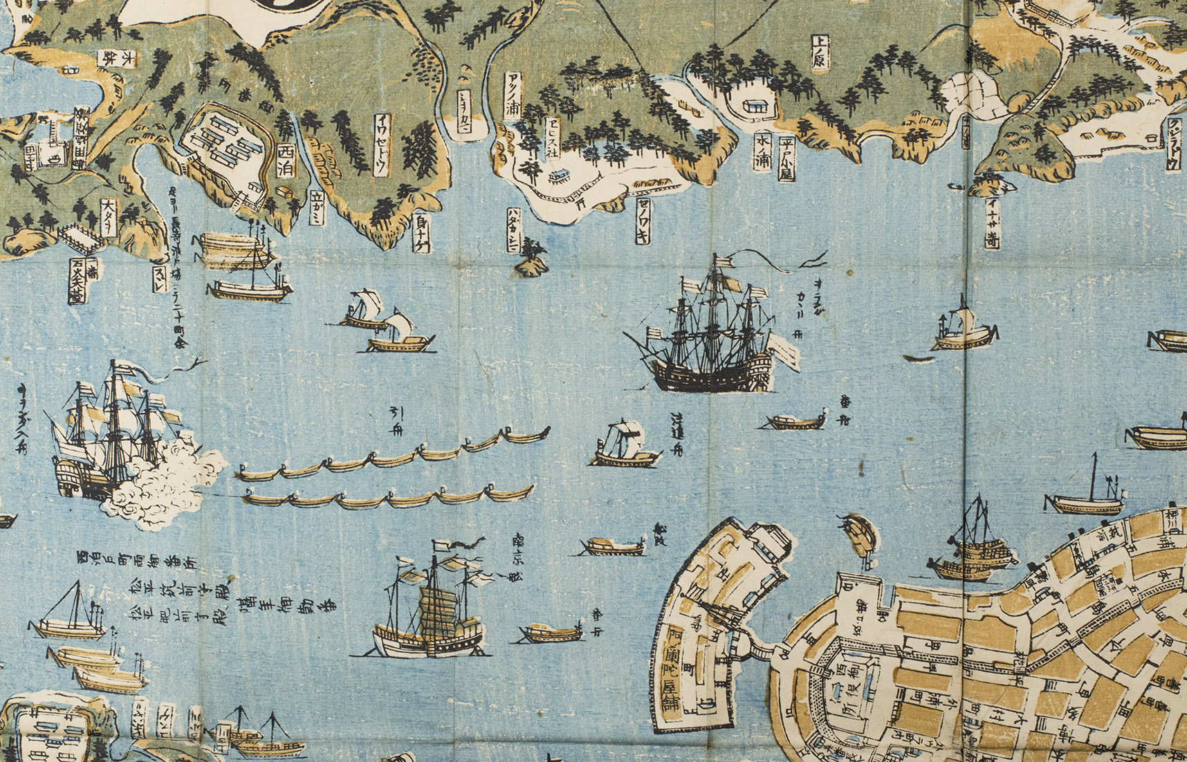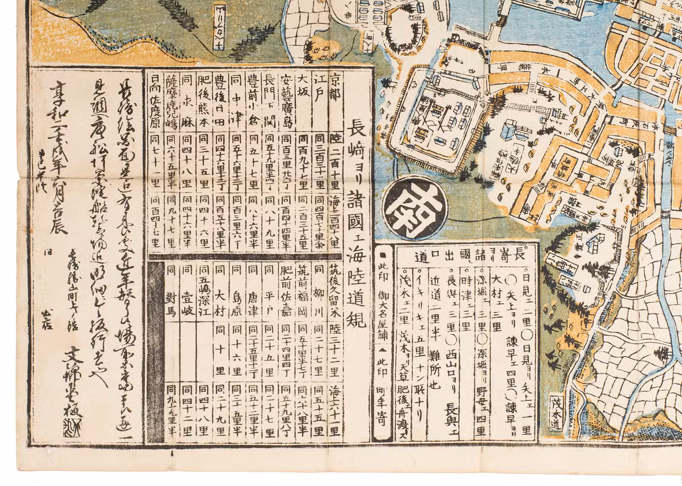 Fine and rare large woodcut map, printed in three colours, of the harbour of Nagasaki, with mountainous landscape in the background and Chinese junks and two Dutch vessels standing out in the harbour, one of the Dutch ships being towed by Japanese oared craft to the Dutch trading post on the artificial island Deshima, left of the centre of the map. The names of the streets, temples and government offices at Nagasaki are all indicated. The two inserts with Japanese characters give the distances between Nagasaki and neighbouring domains as well as distances (by land and by sea) between Nagasaki and important cities throughout Japan.