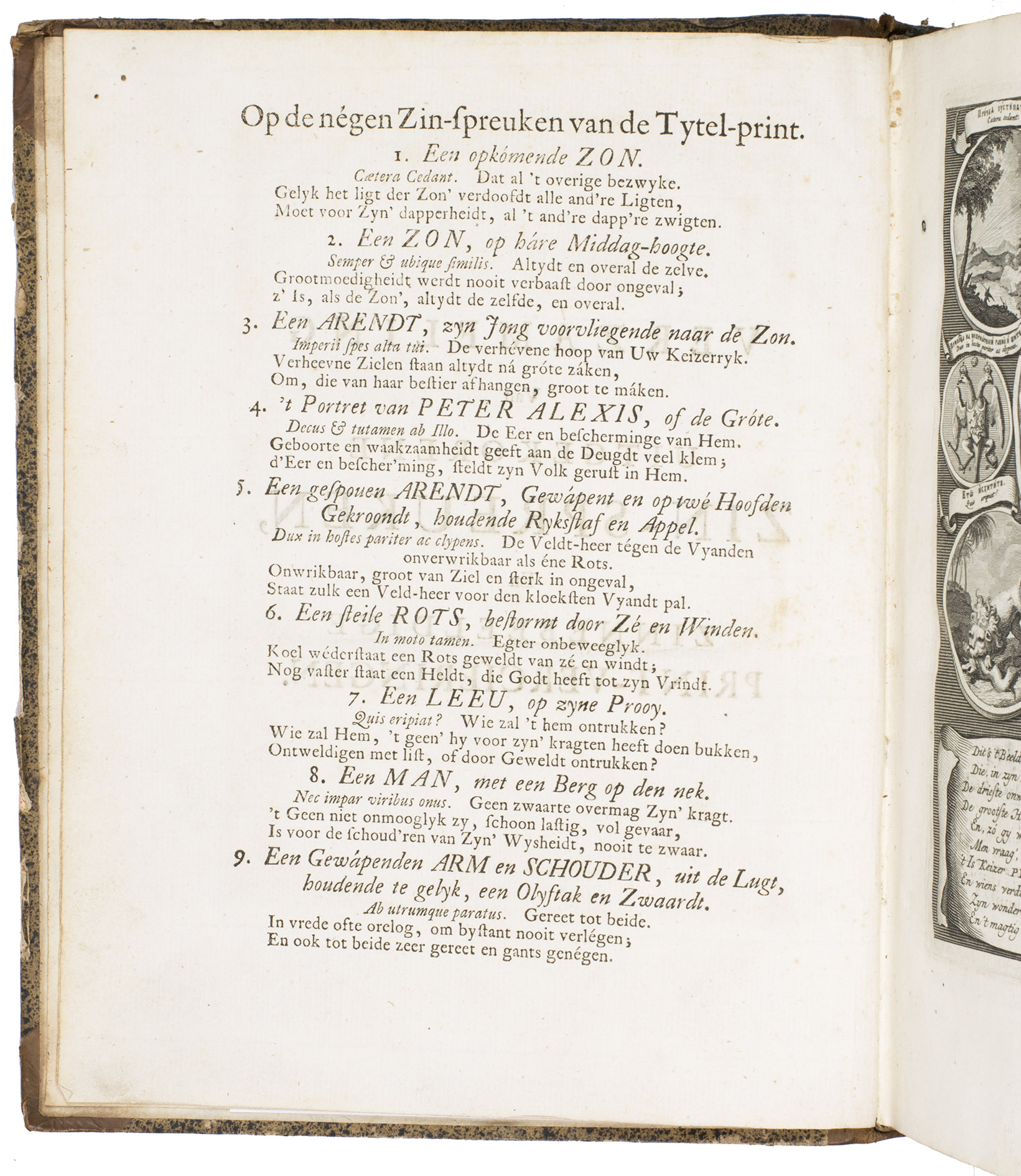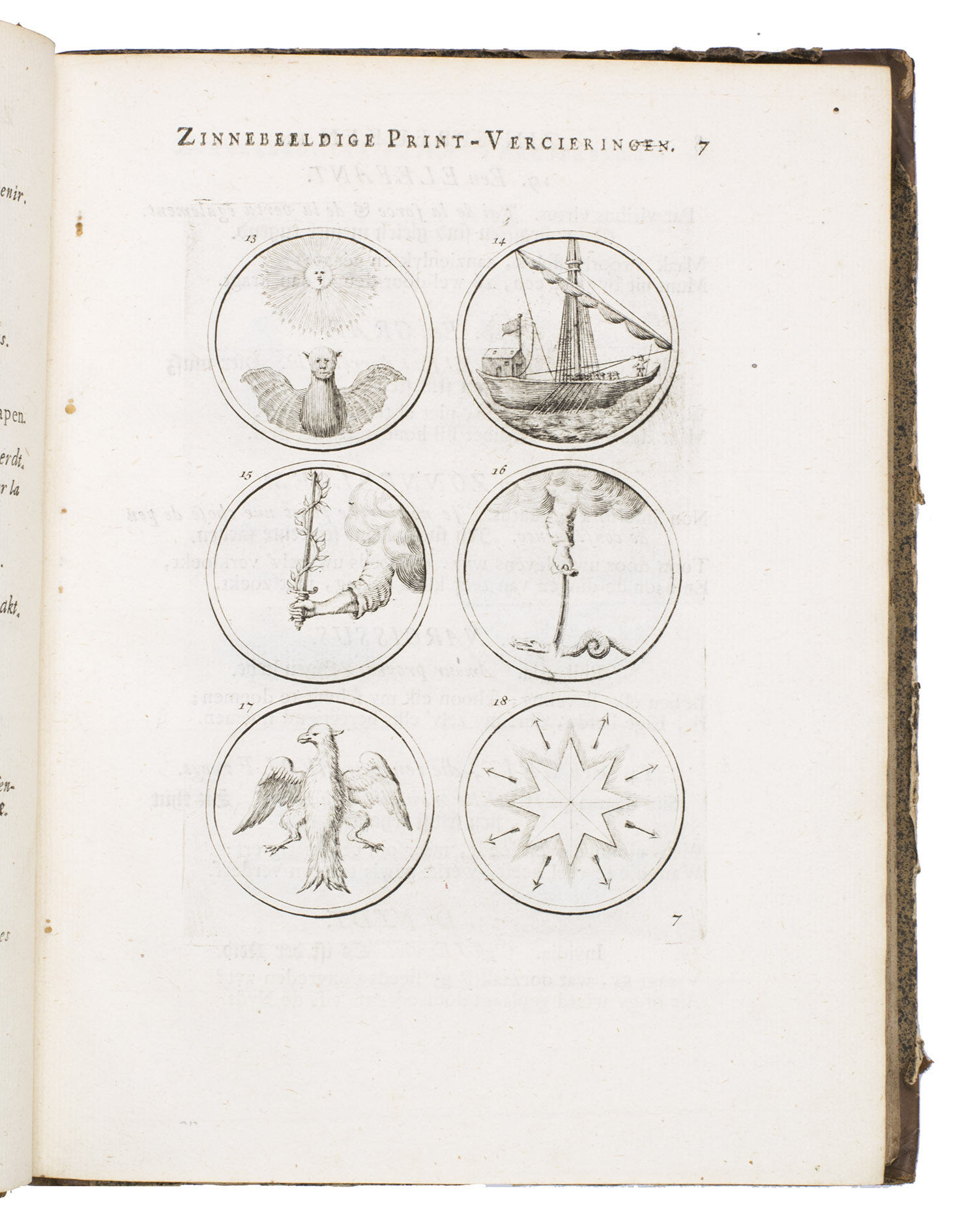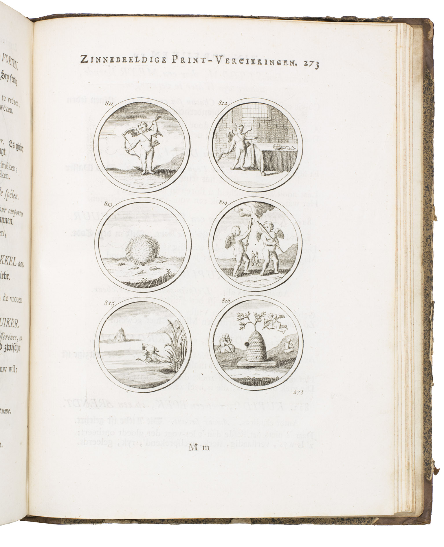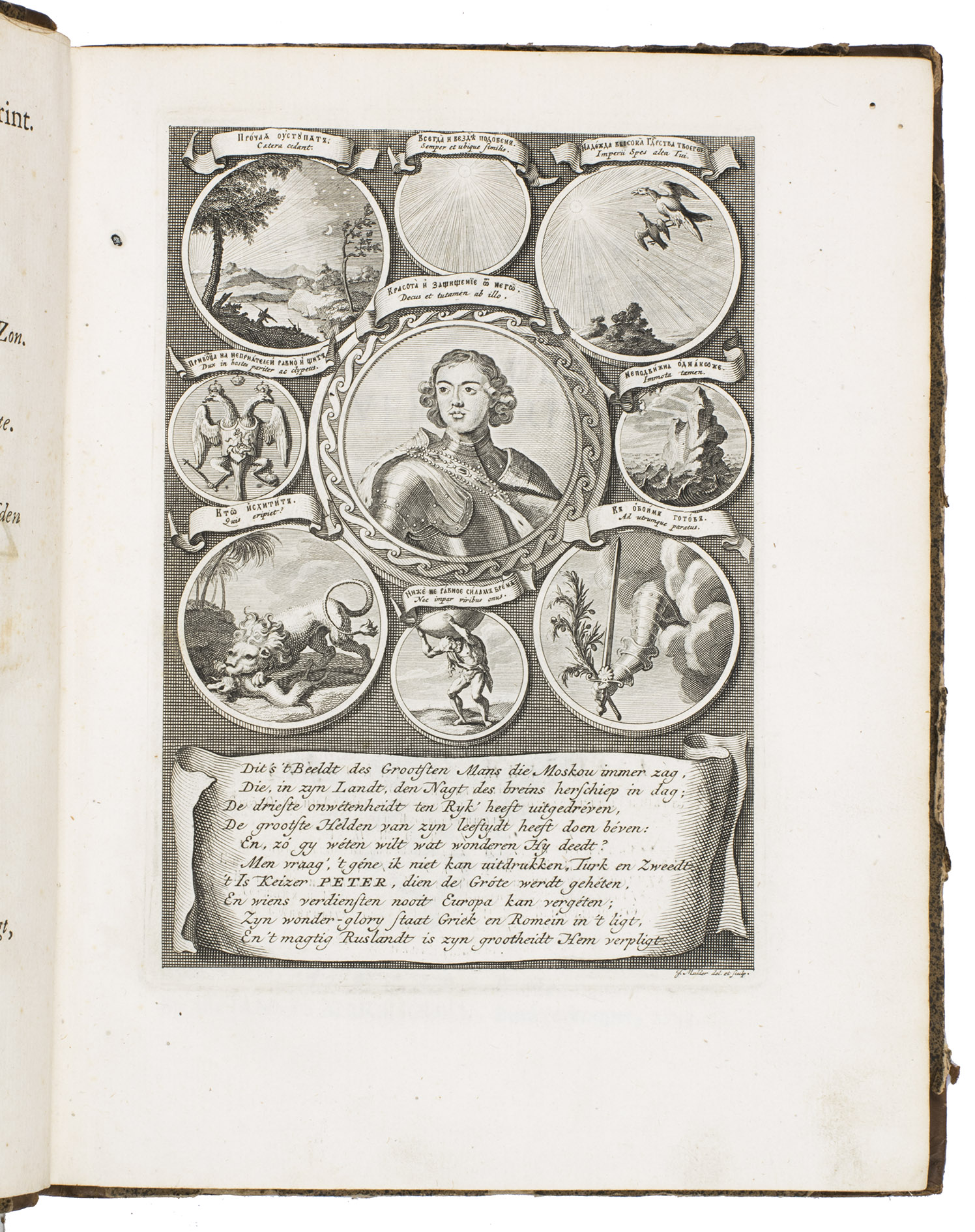 First and only edition of Van den Burg's revised edition of the first Russian emblem book. The original emblem book was published in the Netherlands in 1705 as Symbola et Emblemata, with captions in Russian, German, Dutch, etc. It was published as part of a deal by Tsar Peter the Great granting the Dutch merchant Jan Tesing the right to print books in Holland for sale in Russia. The emblems were copied from Daniel de la Feuille's Devises et emblems anciennes et modernes and Devises et emblems d'amour, themselves based on the classic emblem books by Camerarius, Heinsius, Saavedra, Cats and Vaenius. The first genuinely Russian edition was published in 1788. This edition by the Dutch poet Hermanus van den Burg (1682-1752), uses the original plates and replaces most of the captions, including the Russian, by new two-line verses in Dutch.