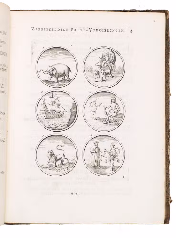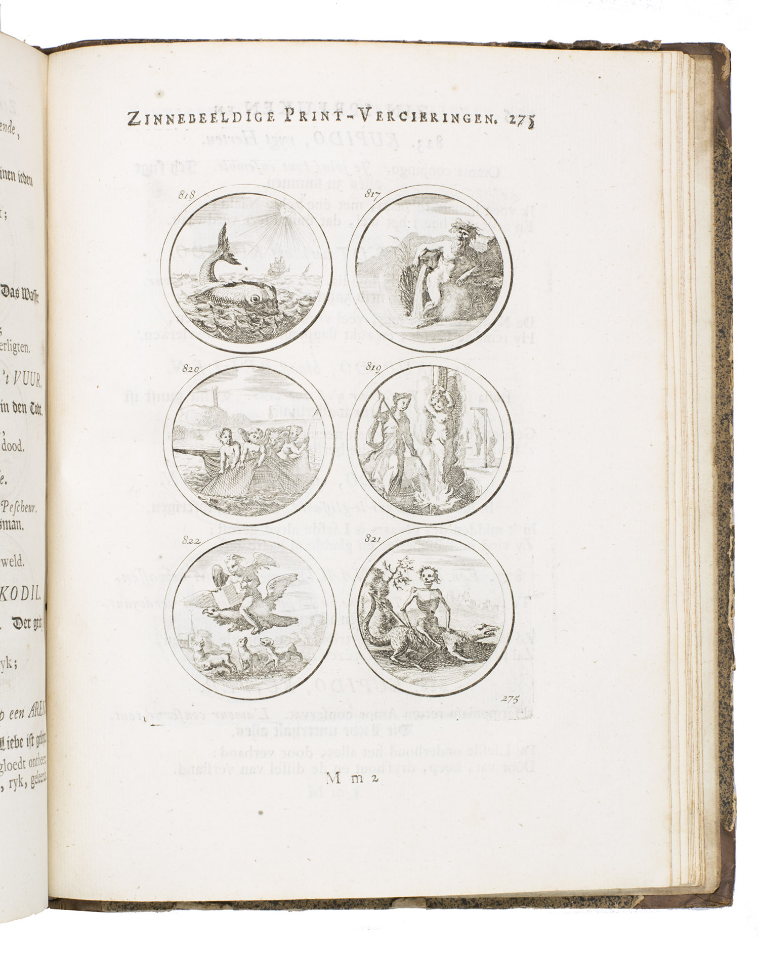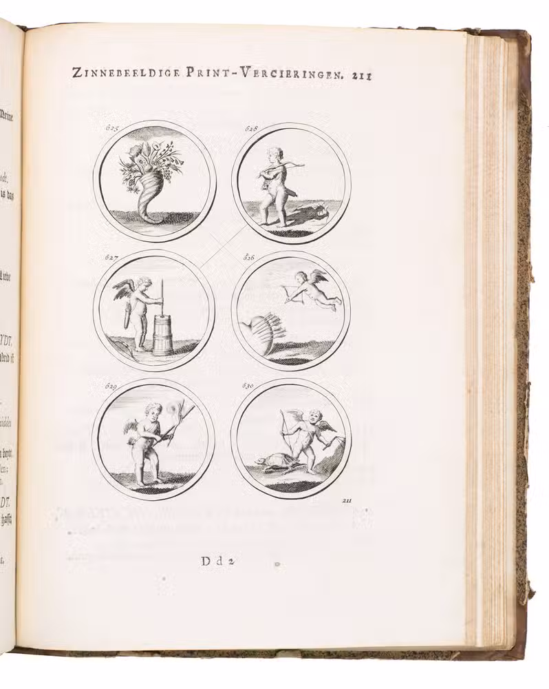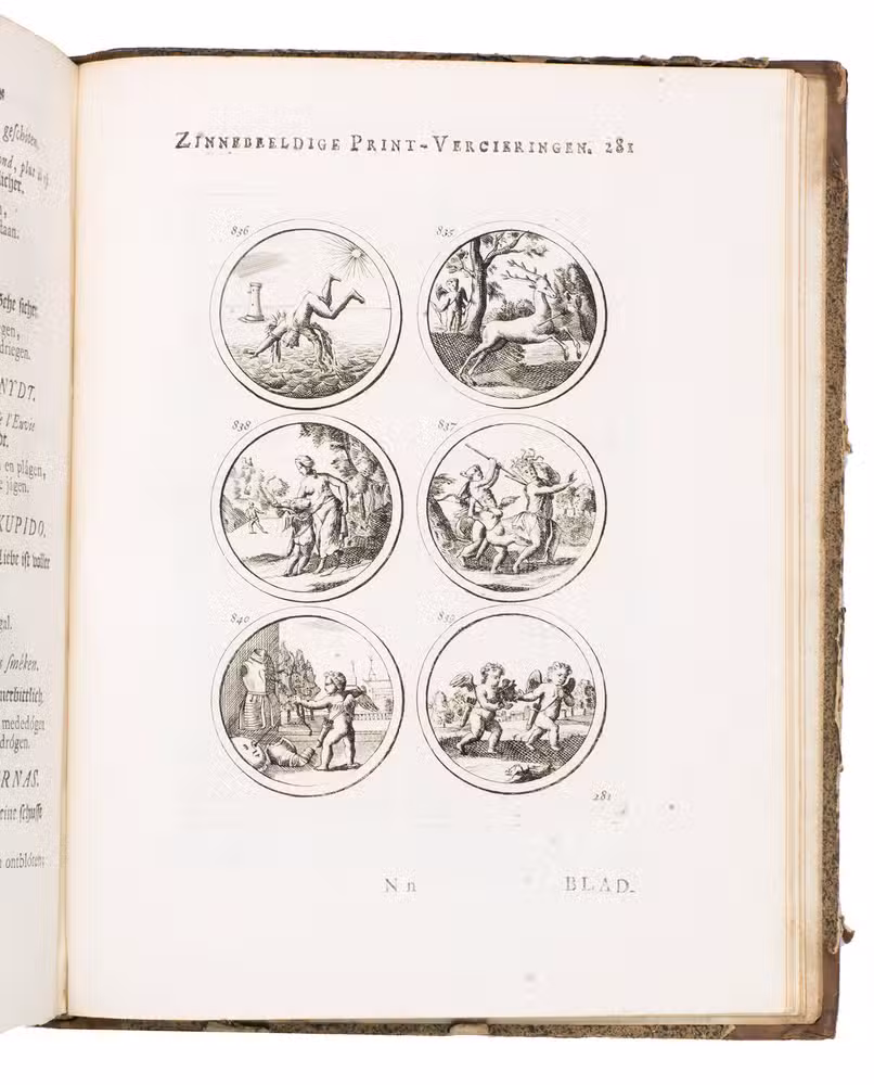 First and only edition of Van den Burg's revised edition of the first Russian emblem book. The original emblem book was published in the Netherlands in 1705 as Symbola et Emblemata, with captions in Russian, German, Dutch, etc. It was published as part of a deal by Tsar Peter the Great granting the Dutch merchant Jan Tesing the right to print books in Holland for sale in Russia. The emblems were copied from Daniel de la Feuille's Devises et emblems anciennes et modernes and Devises et emblems d'amour, themselves based on the classic emblem books by Camerarius, Heinsius, Saavedra, Cats and Vaenius. The first genuinely Russian edition was published in 1788. This edition by the Dutch poet Hermanus van den Burg (1682-1752), uses the original plates and replaces most of the captions, including the Russian, by new two-line verses in Dutch.
