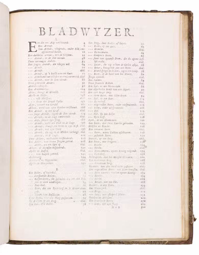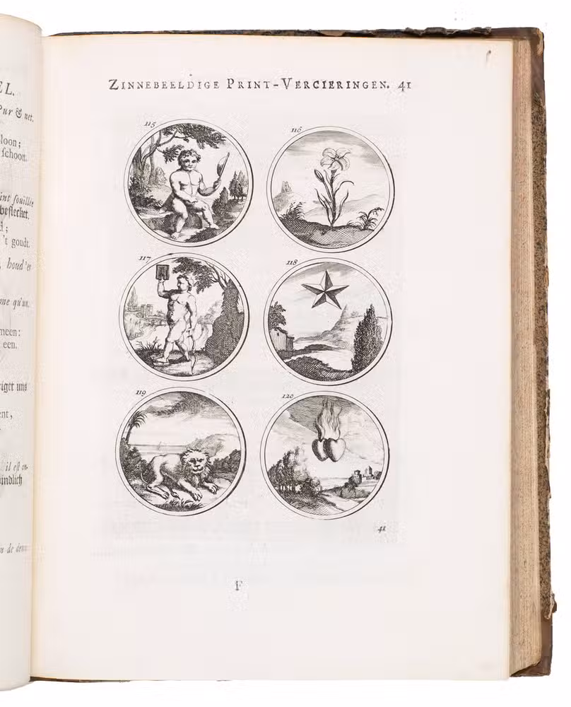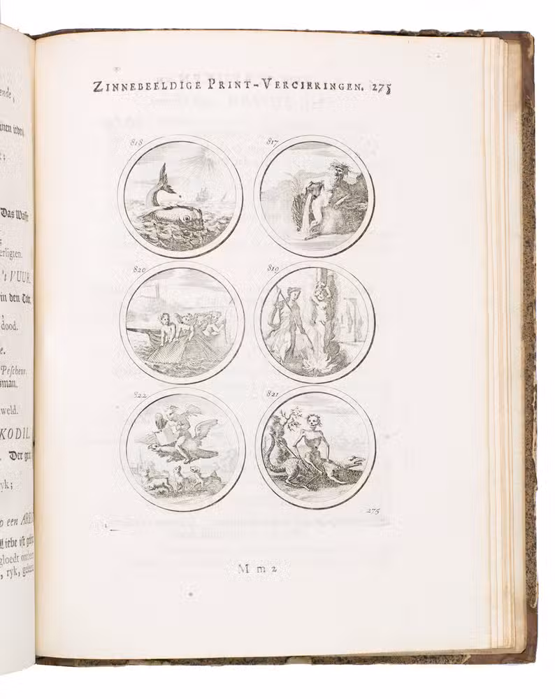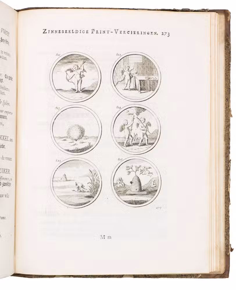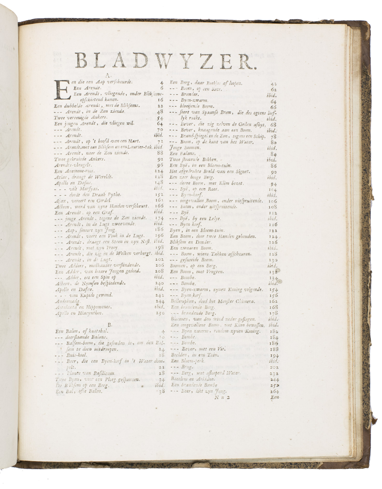 First and only edition of Van den Burg's revised edition of the first Russian emblem book. The original emblem book was published in the Netherlands in 1705 as Symbola et Emblemata, with captions in Russian, German, Dutch, etc. It was published as part of a deal by Tsar Peter the Great granting the Dutch merchant Jan Tesing the right to print books in Holland for sale in Russia. The emblems were copied from Daniel de la Feuille's Devises et emblems anciennes et modernes and Devises et emblems d'amour, themselves based on the classic emblem books by Camerarius, Heinsius, Saavedra, Cats and Vaenius. The first genuinely Russian edition was published in 1788. This edition by the Dutch poet Hermanus van den Burg (1682-1752), uses the original plates and replaces most of the captions, including the Russian, by new two-line verses in Dutch.