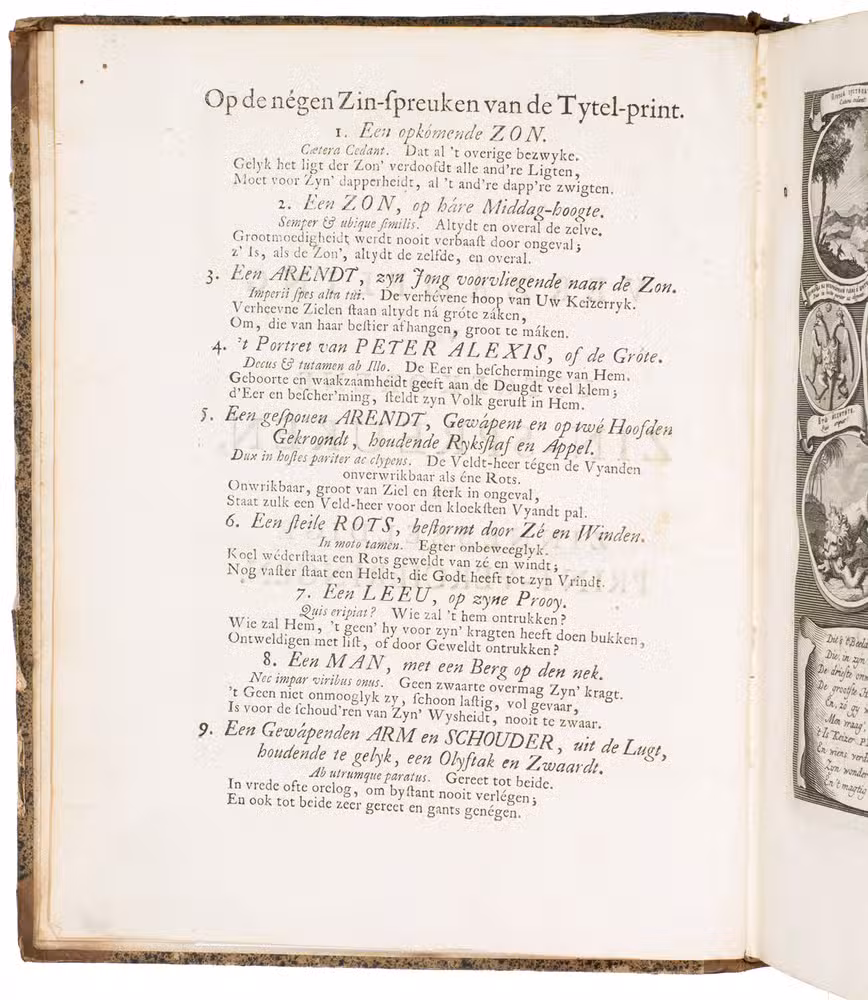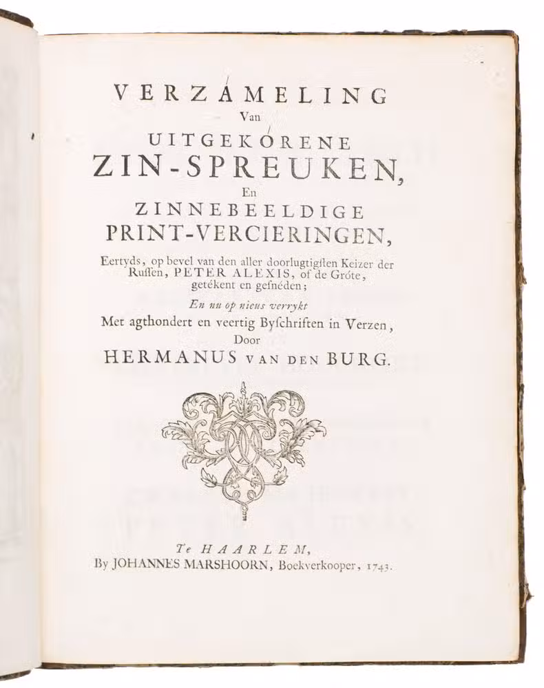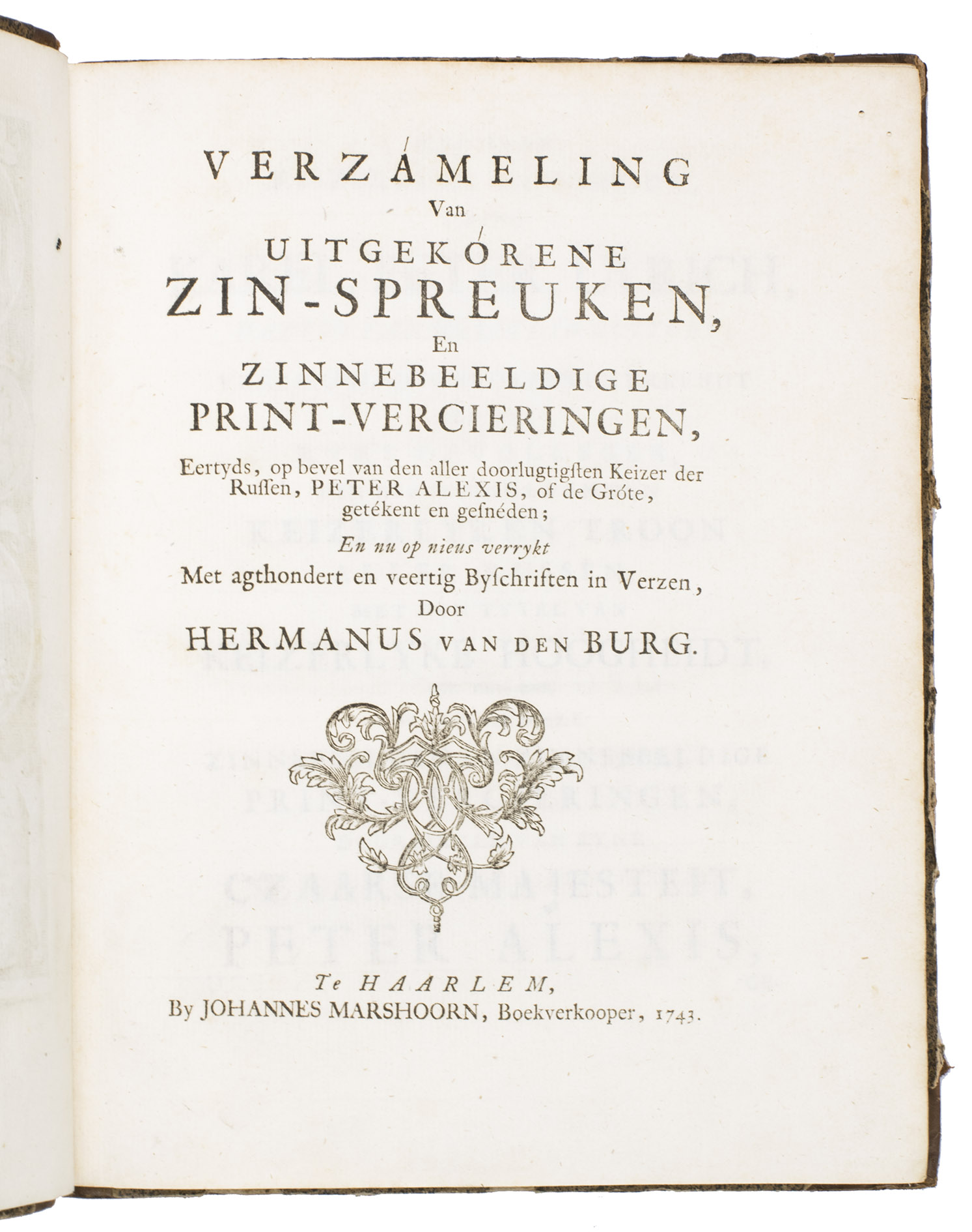 Verzámeling van uitgekórene zin-spreuken, en zinnebeeldige print-vercieringen, eertyds, op bevel van den aller doorlugtigsten Keizer der Russen, Peter Alexis, of de Gróte, getékent en gesnéden ...