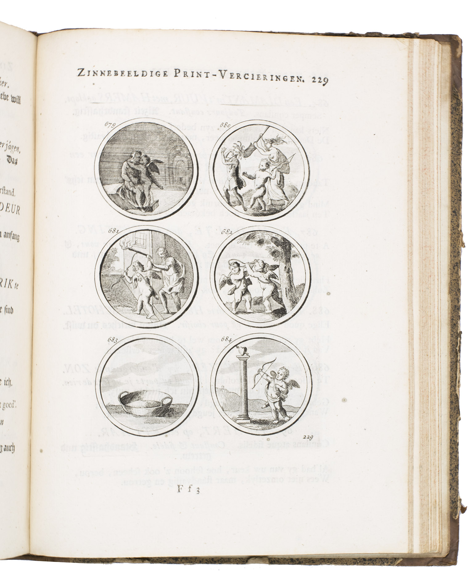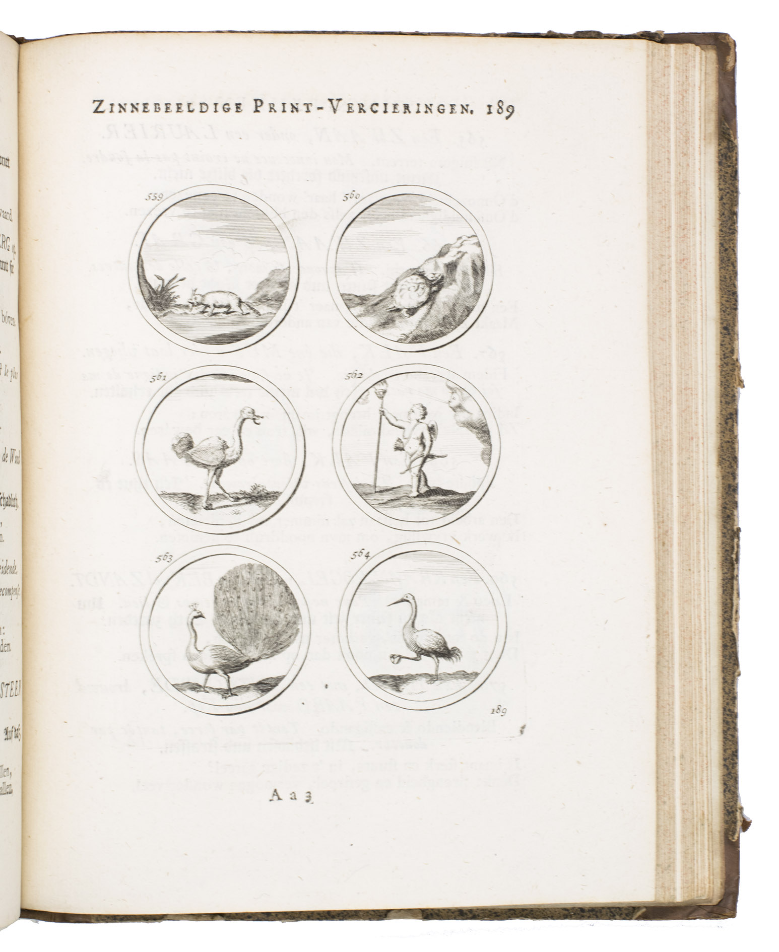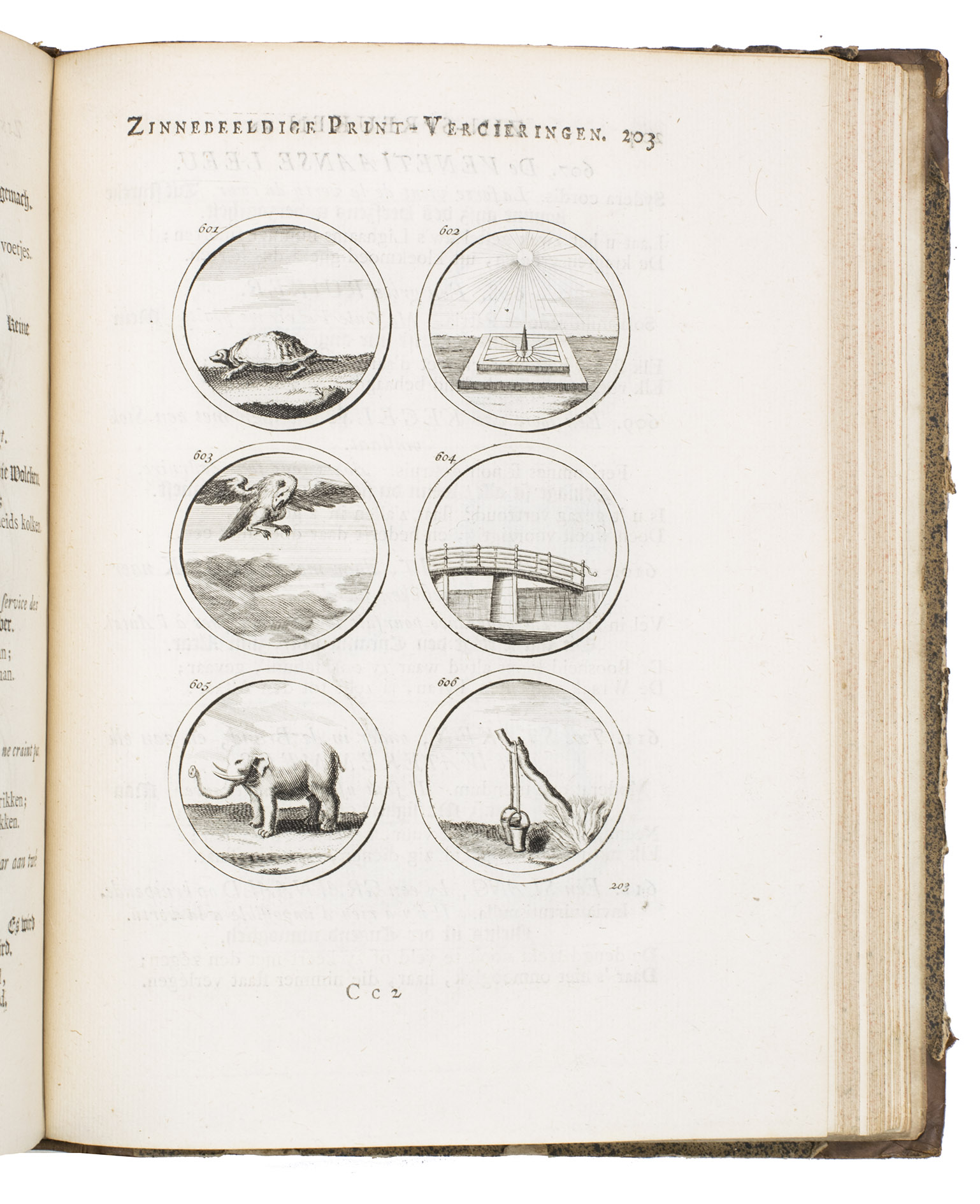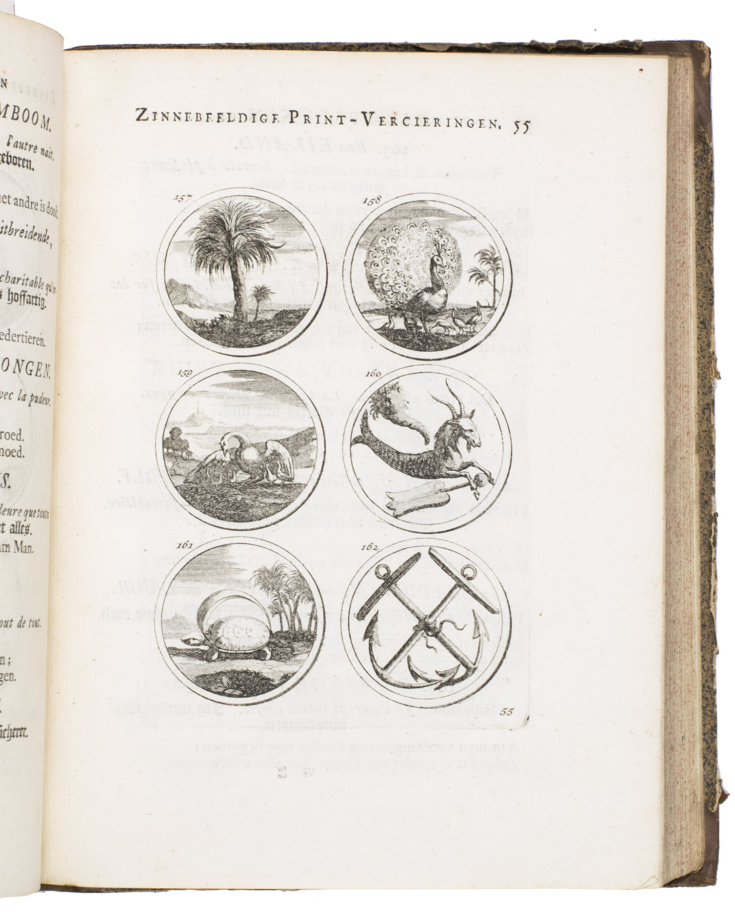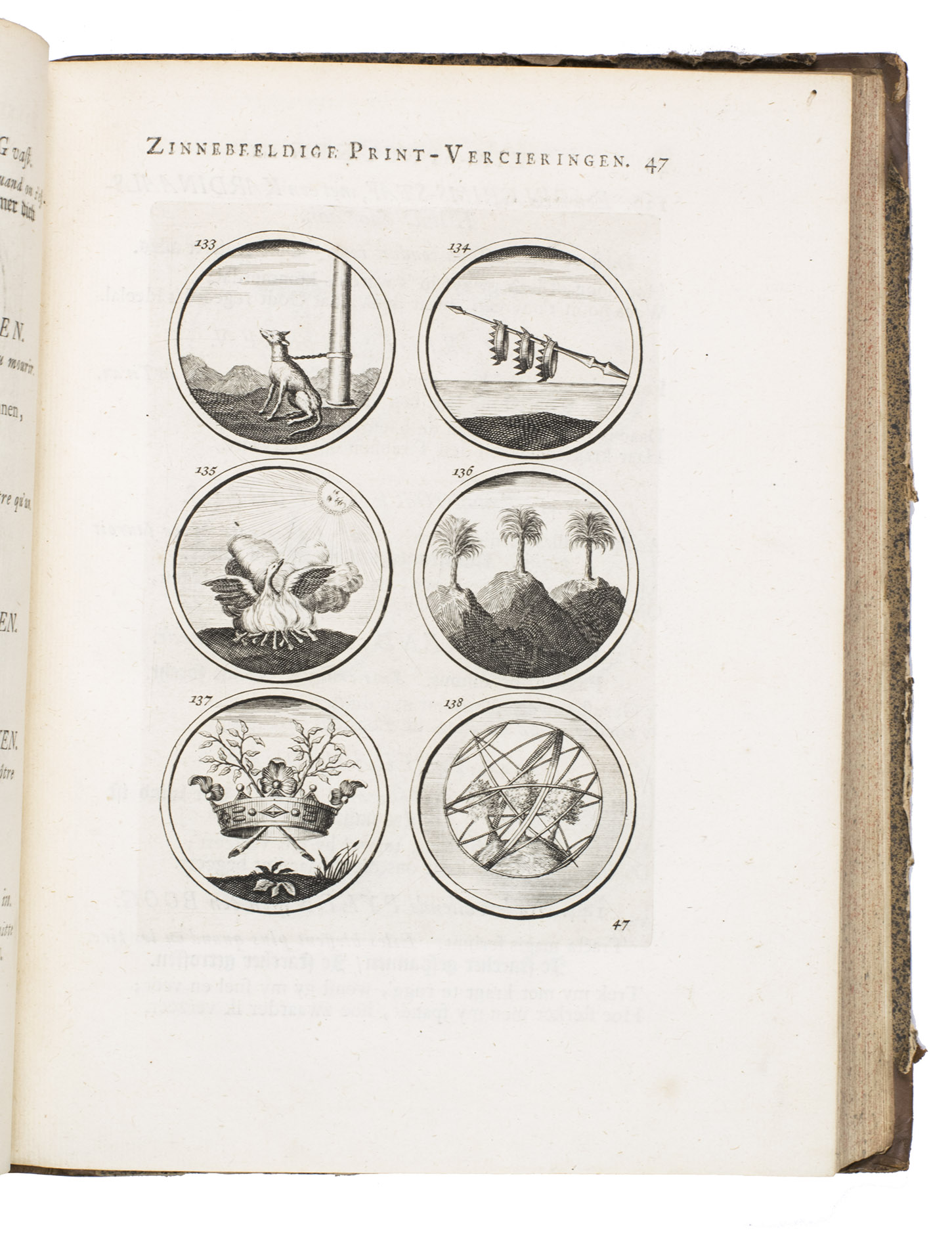 Haarlem, Johannes Marshoorn, 1743. 4to. With engraved frontispiece, with Tsar Peter the Great's medallion portrait surrounded by 8 emblems, and 840 emblems on 140 engraved plates, the facing pages to the left with captions in Dutch, short proverbial phrases in Latin, French and German, and two-line verses in Dutch by Van den Burg. Contemporary half calf. [8], 281, [1 blank], [10] pp.