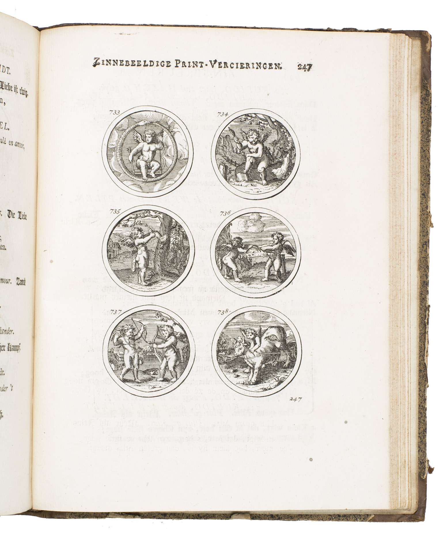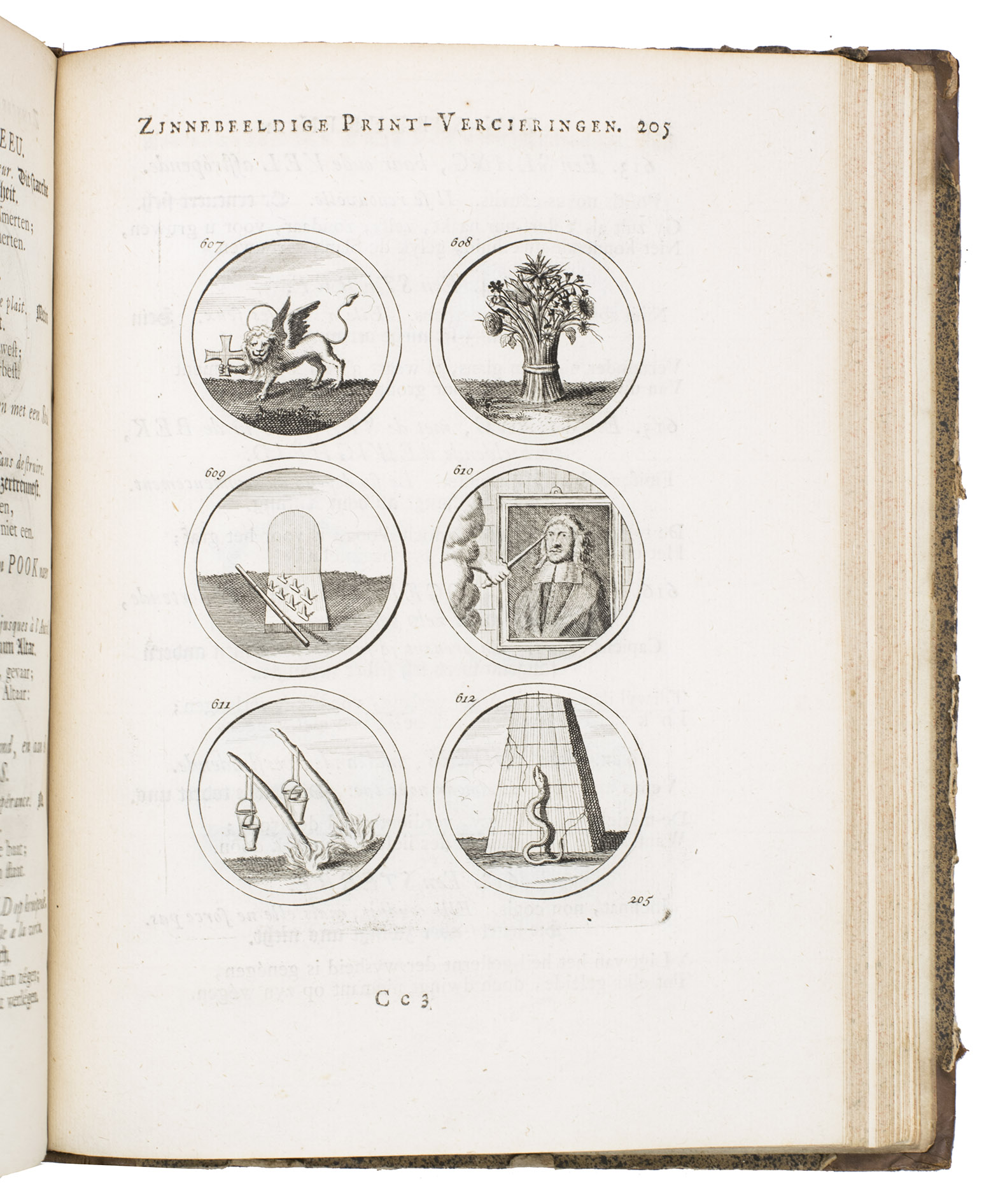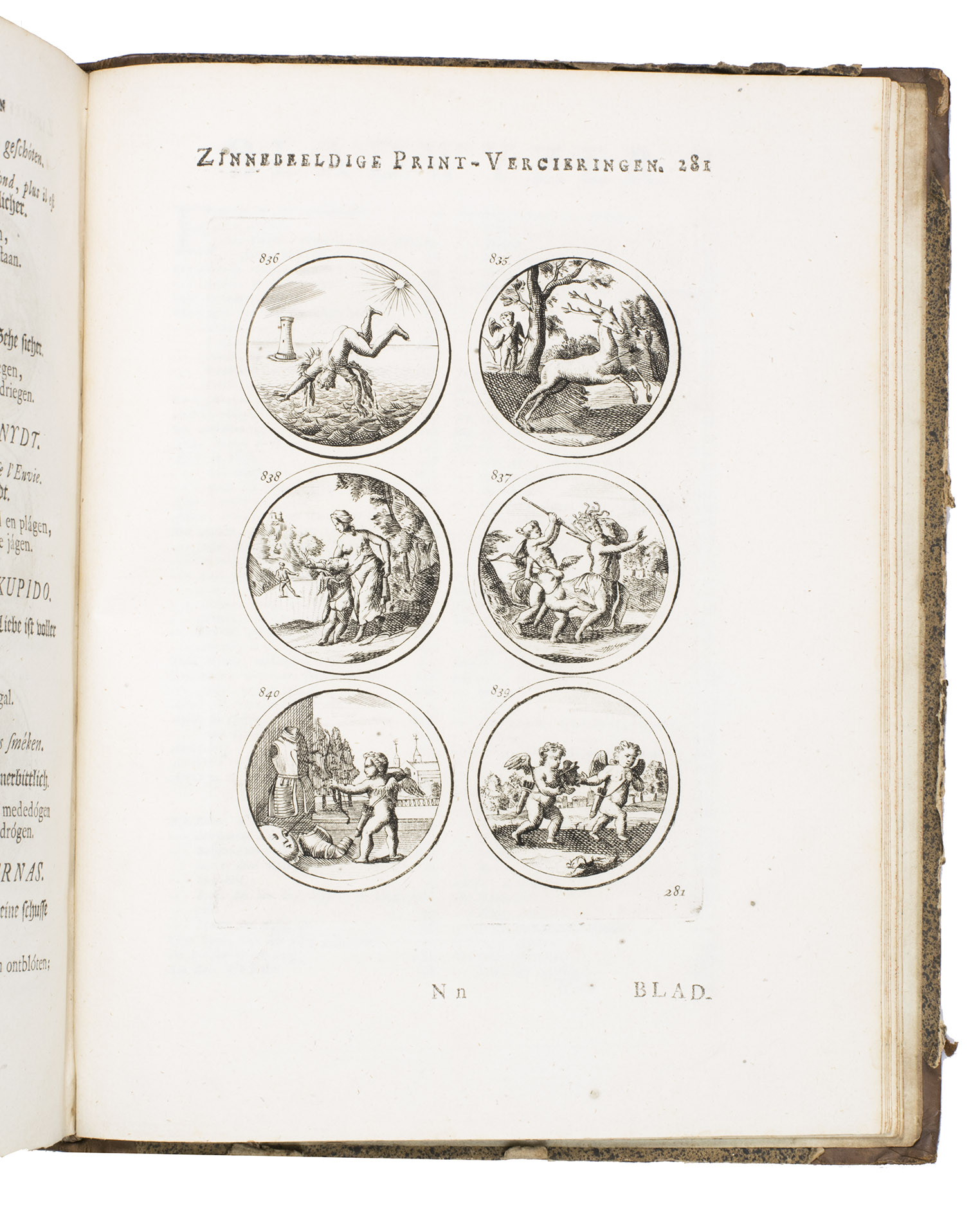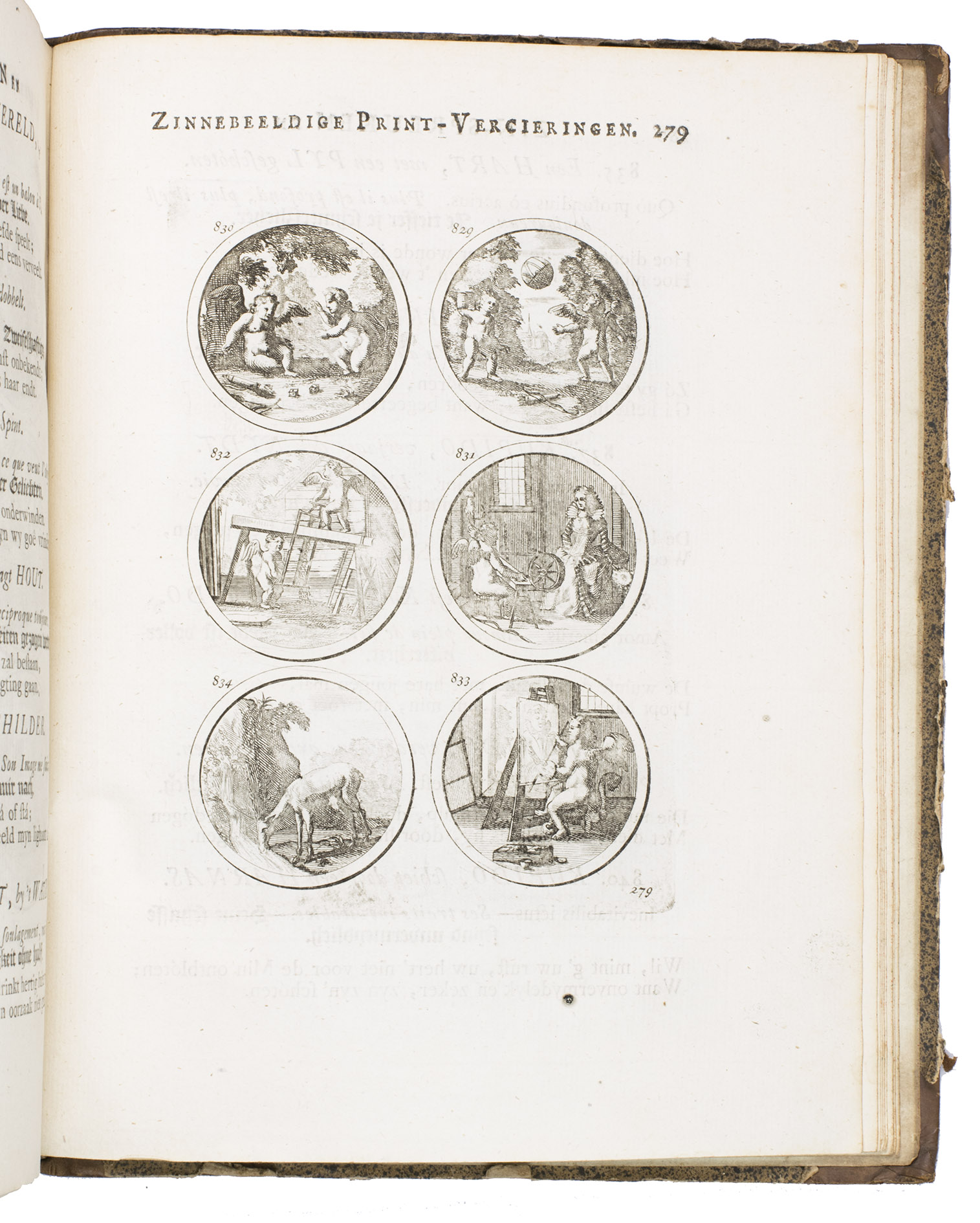 Haarlem, Johannes Marshoorn, 1743. 4to. With engraved frontispiece, with Tsar Peter the Great's medallion portrait surrounded by 8 emblems, and 840 emblems on 140 engraved plates, the facing pages to the left with captions in Dutch, short proverbial phrases in Latin, French and German, and two-line verses in Dutch by Van den Burg. Contemporary half calf. [8], 281, [1 blank], [10] pp.