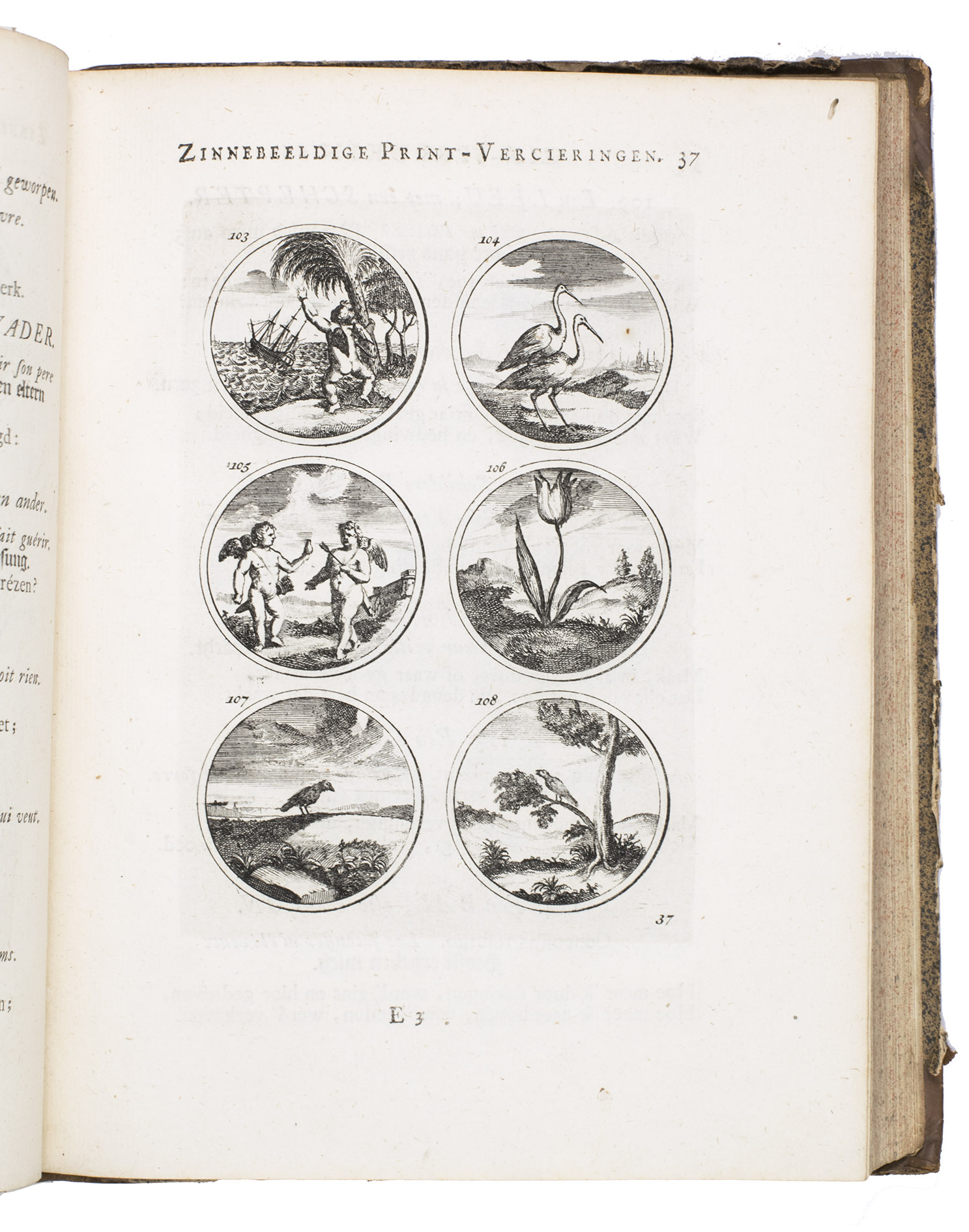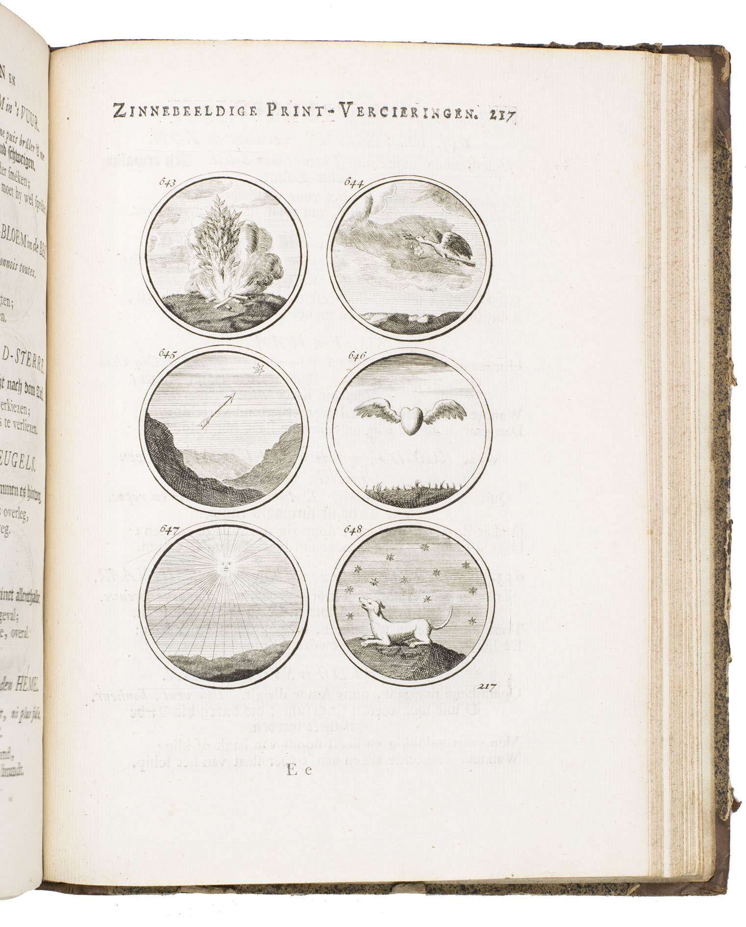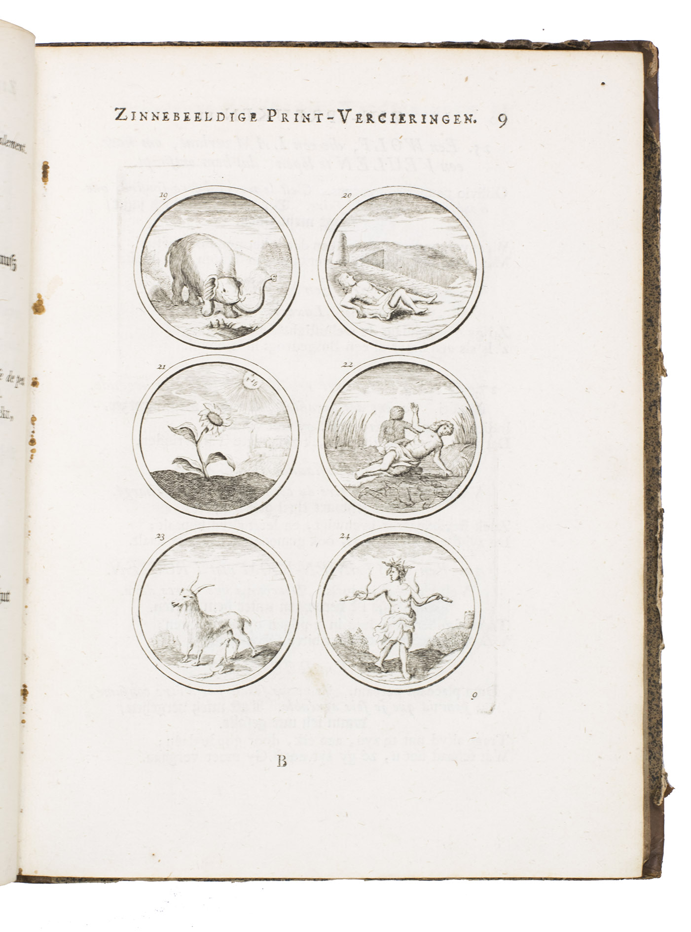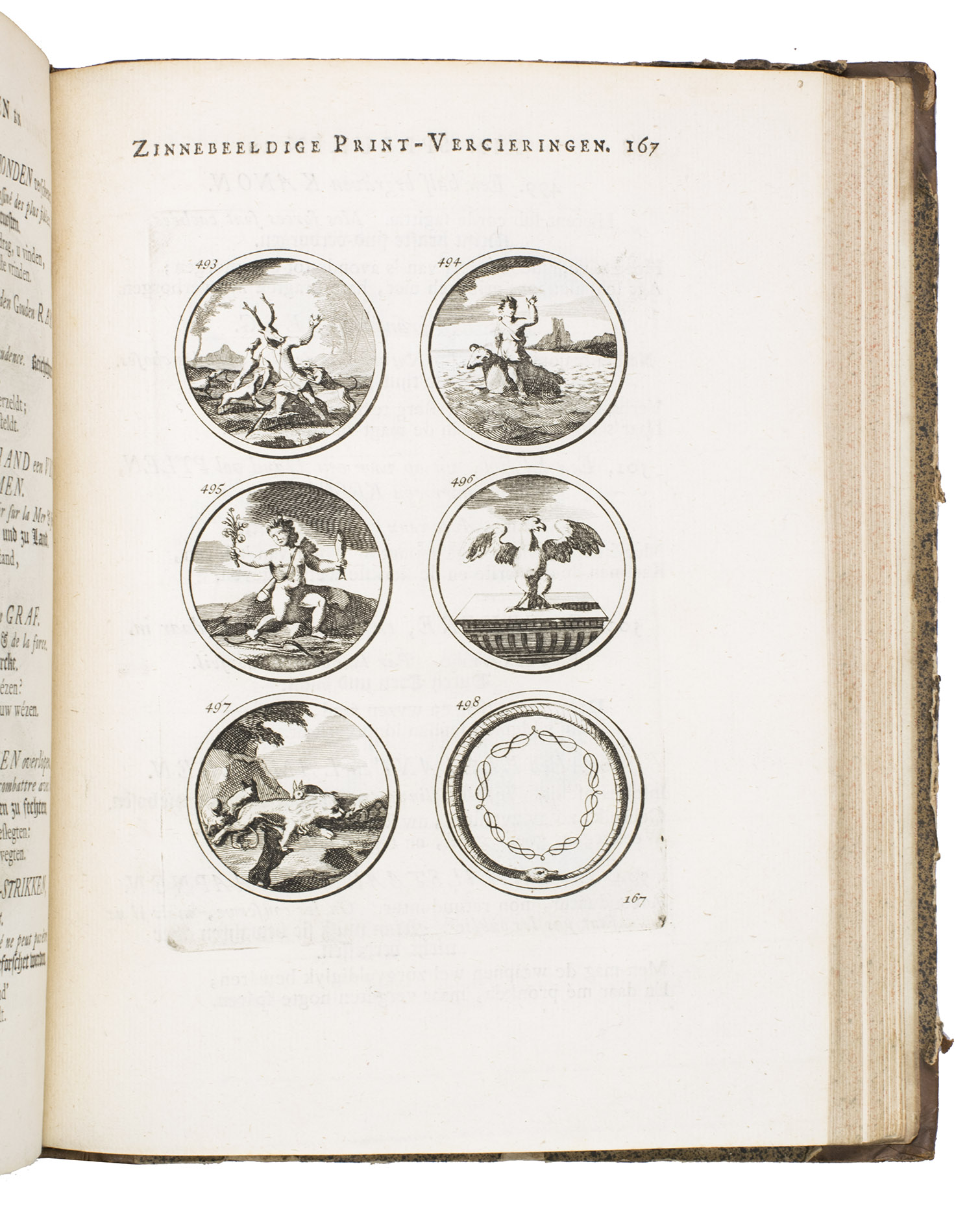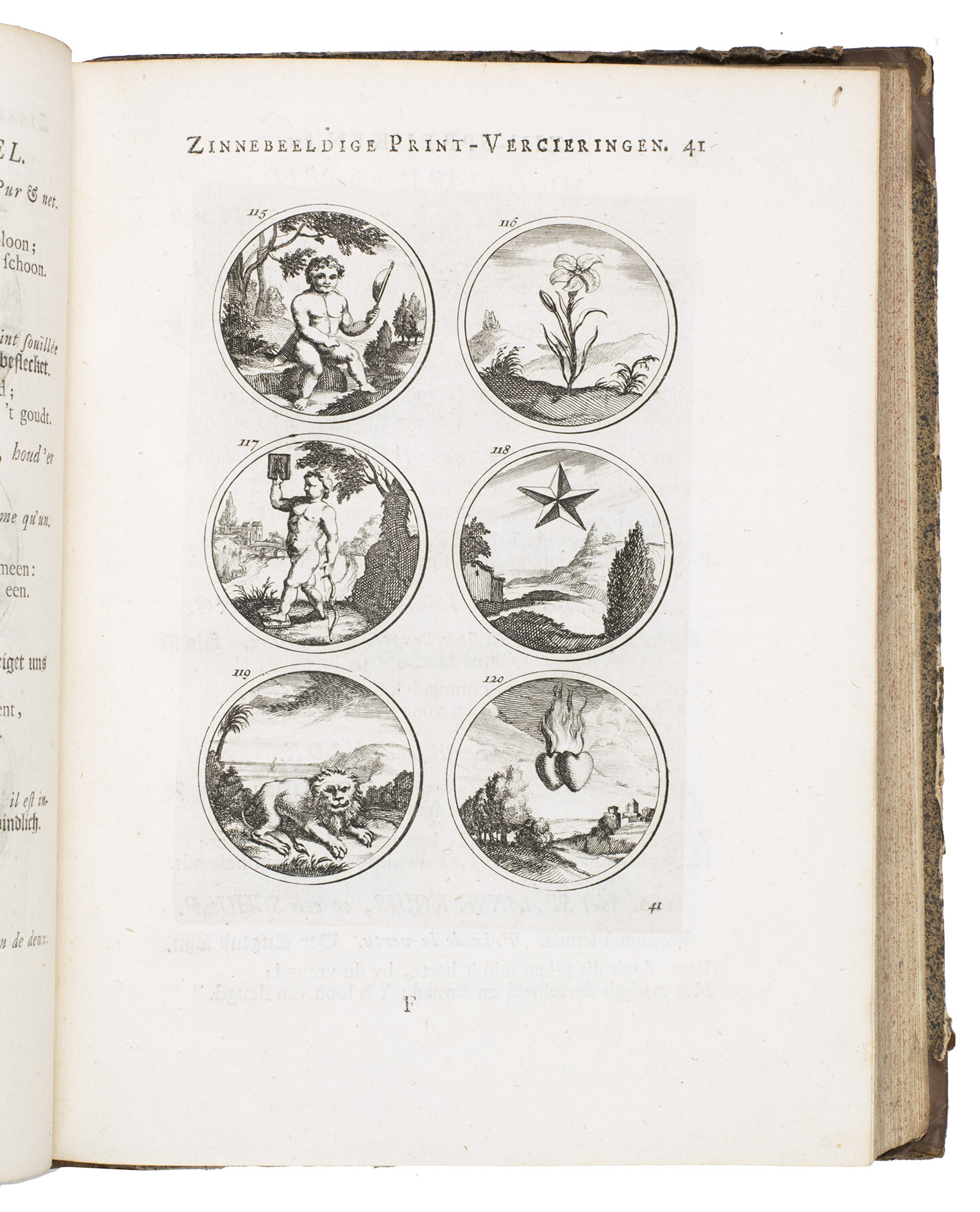 Haarlem, Johannes Marshoorn, 1743. 4to. With engraved frontispiece, with Tsar Peter the Great's medallion portrait surrounded by 8 emblems, and 840 emblems on 140 engraved plates, the facing pages to the left with captions in Dutch, short proverbial phrases in Latin, French and German, and two-line verses in Dutch by Van den Burg. Contemporary half calf. [8], 281, [1 blank], [10] pp.