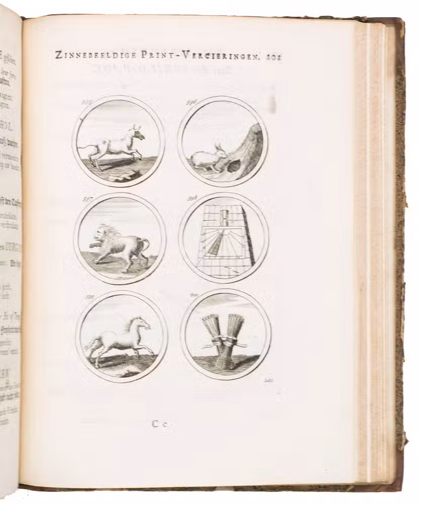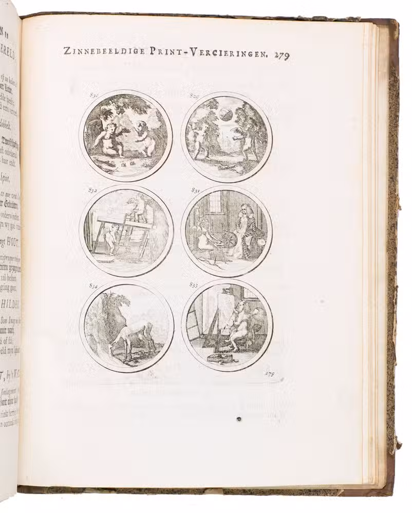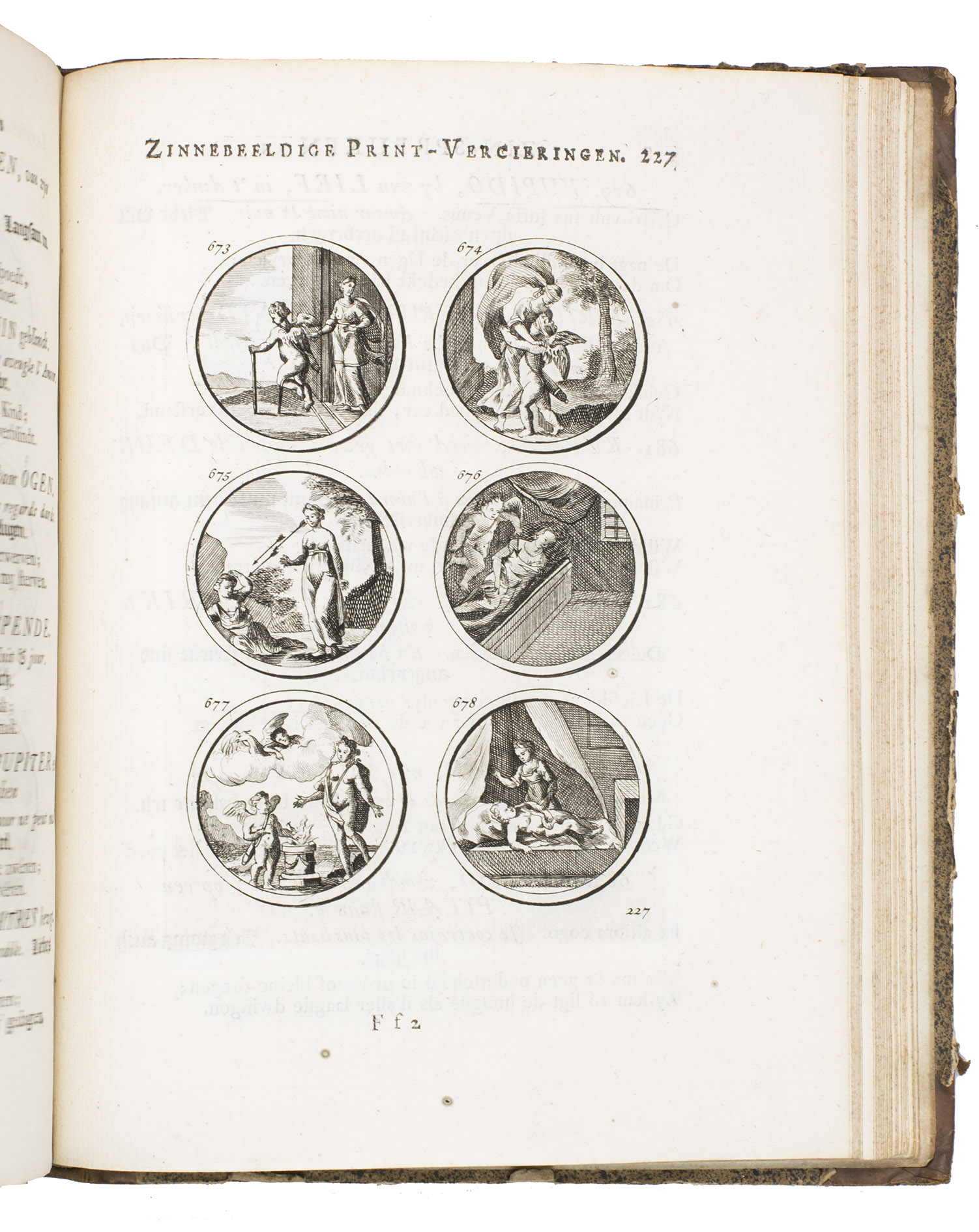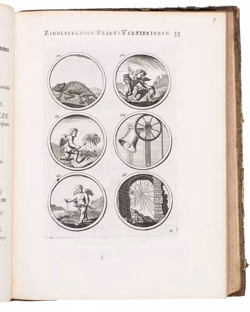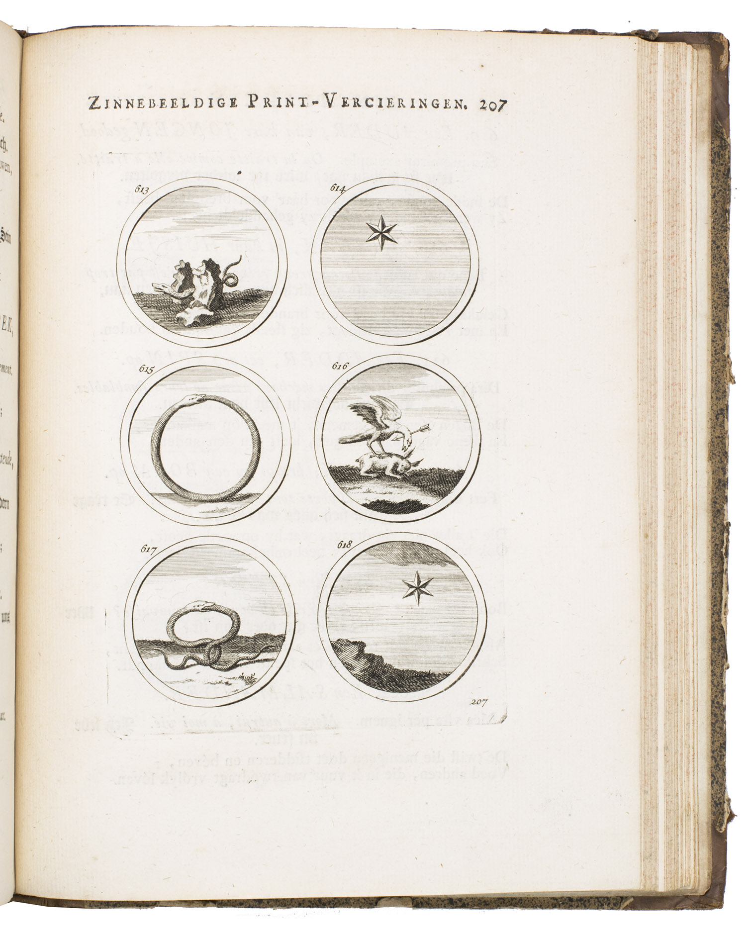 Haarlem, Johannes Marshoorn, 1743. 4to. With engraved frontispiece, with Tsar Peter the Great's medallion portrait surrounded by 8 emblems, and 840 emblems on 140 engraved plates, the facing pages to the left with captions in Dutch, short proverbial phrases in Latin, French and German, and two-line verses in Dutch by Van den Burg. Contemporary half calf. [8], 281, [1 blank], [10] pp.