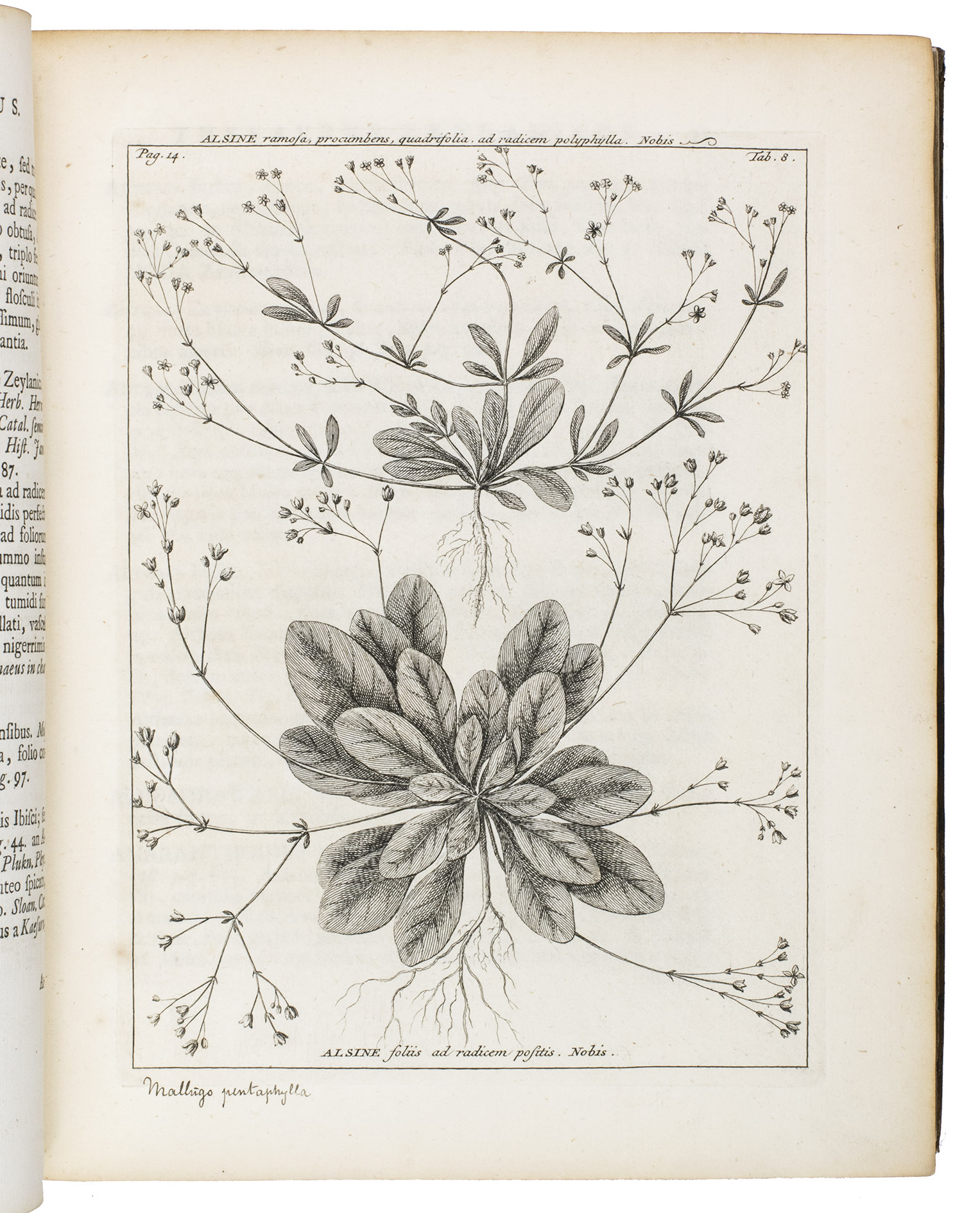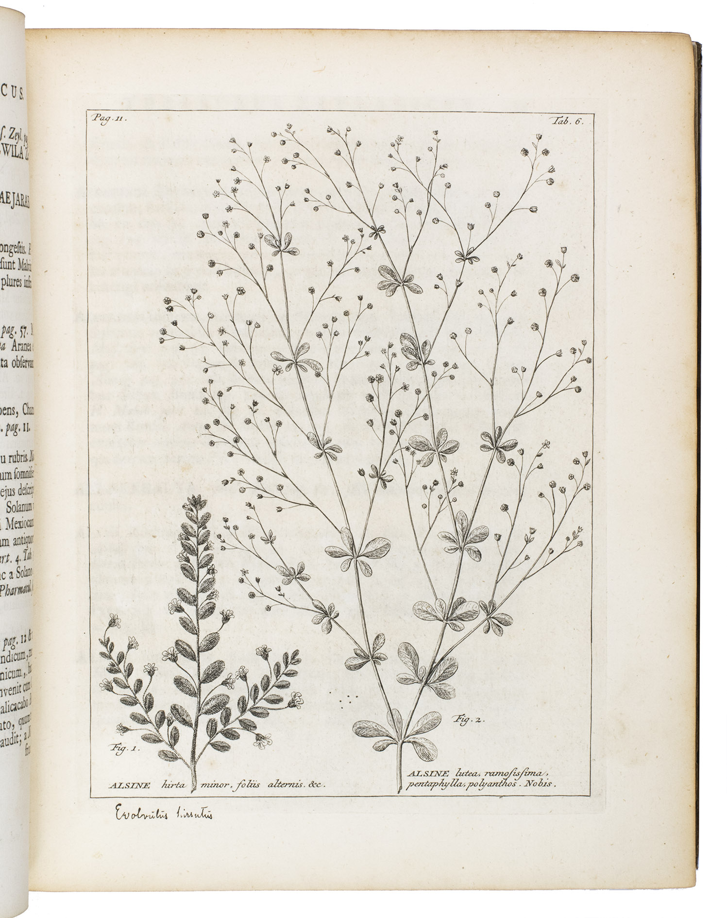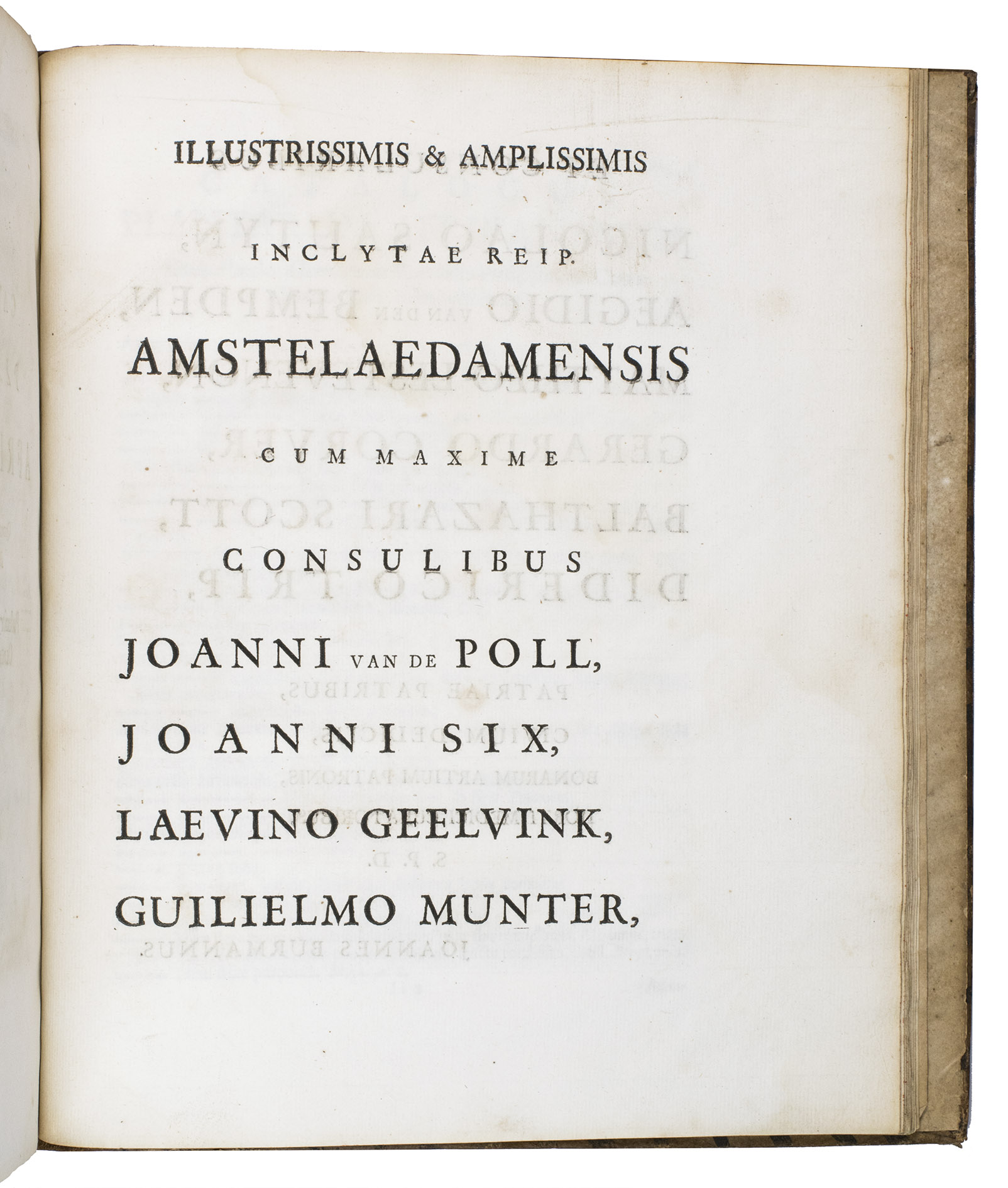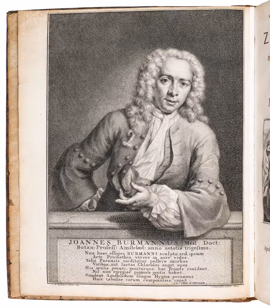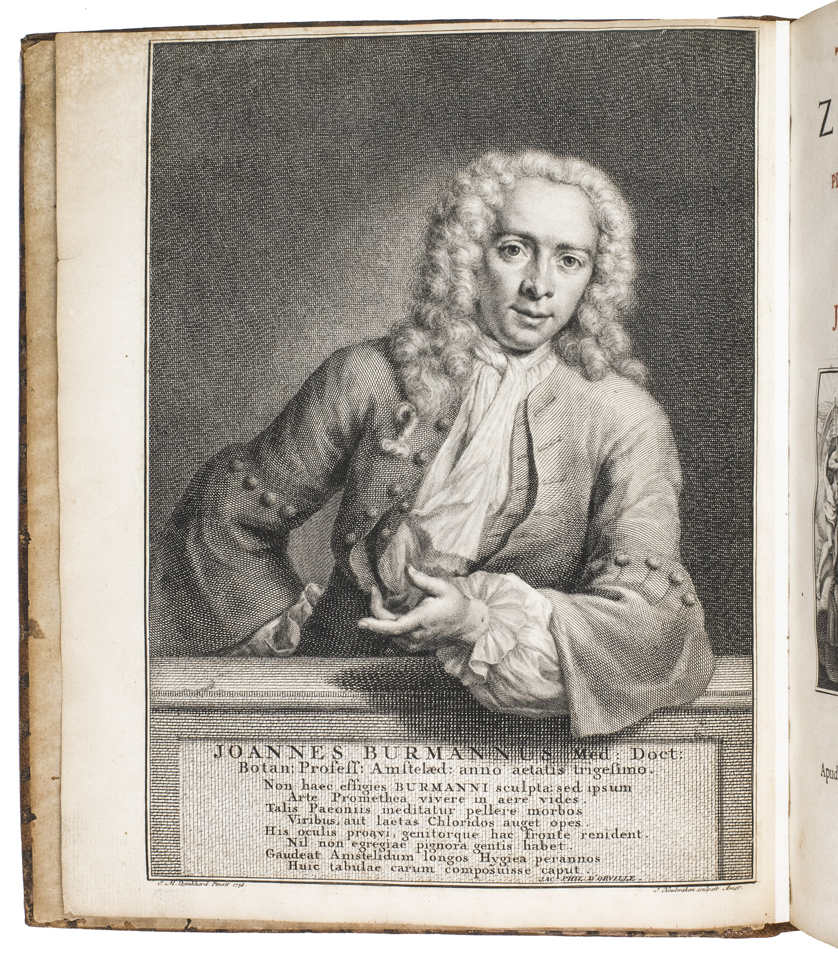 Johannes Burmann (1707-1779) was physician and professor of botany in Amsterdam. He was well acquainted with Carl Linnaeus, who named the genus Burmannia and the family Burmanniaceae after him. Burman wrote 8 works, primarily on plants in Ceylon, Amboina, and the Cape of Good Hope. The present one is his first. The reference works usually refer to the plates as engravings, but they are most likely finely etched. Two different plates are numbered "18", so that many descriptions mistakenly report 110 rather than 111 plates. The dedication on *2 can appear in either of 2 different states, depending on how widely the names are spaced. Sometimes the "consulibus" are on the recto and the "consularibus" on the verso, but here the "consularibus" already start on the recto.