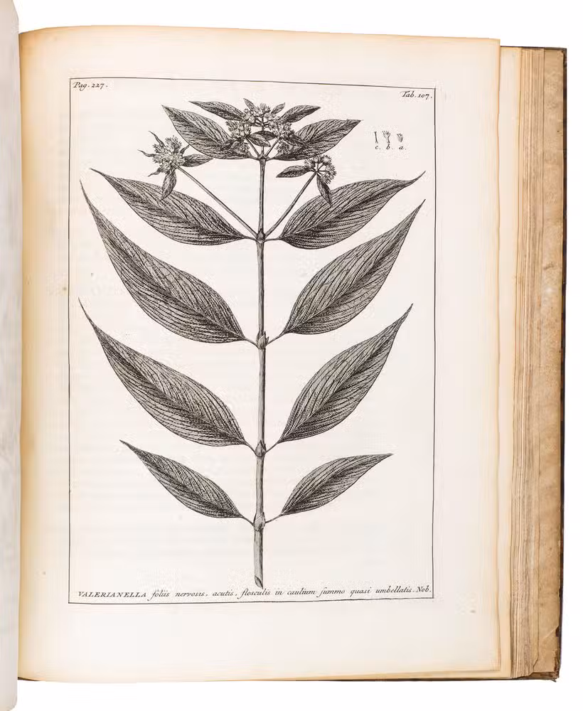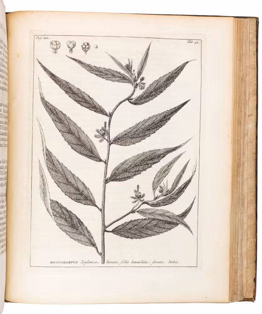 The work describes hundreds of different plants in alphabetical order, including, for example, the Malabar nut, amaranth, cinnamon, and different types of jasmine. As stated in the preface, the work was based on collections of plants made in Ceylon by Paul Hermann (1640-1695), a professor of botany in Leiden, and Johannes Hartog (1663-1722), master gardener at the Cape of Good Hope. Burman frequently makes use of other sources for the present work, but the many plates that are marked "nobis" were made after his own discoveries. The second part of the work, titled Catalogi duo plantarum Africanorum, is a catalogue of plants in South Africa, which was also based on the famous botanical collection of Hermann.