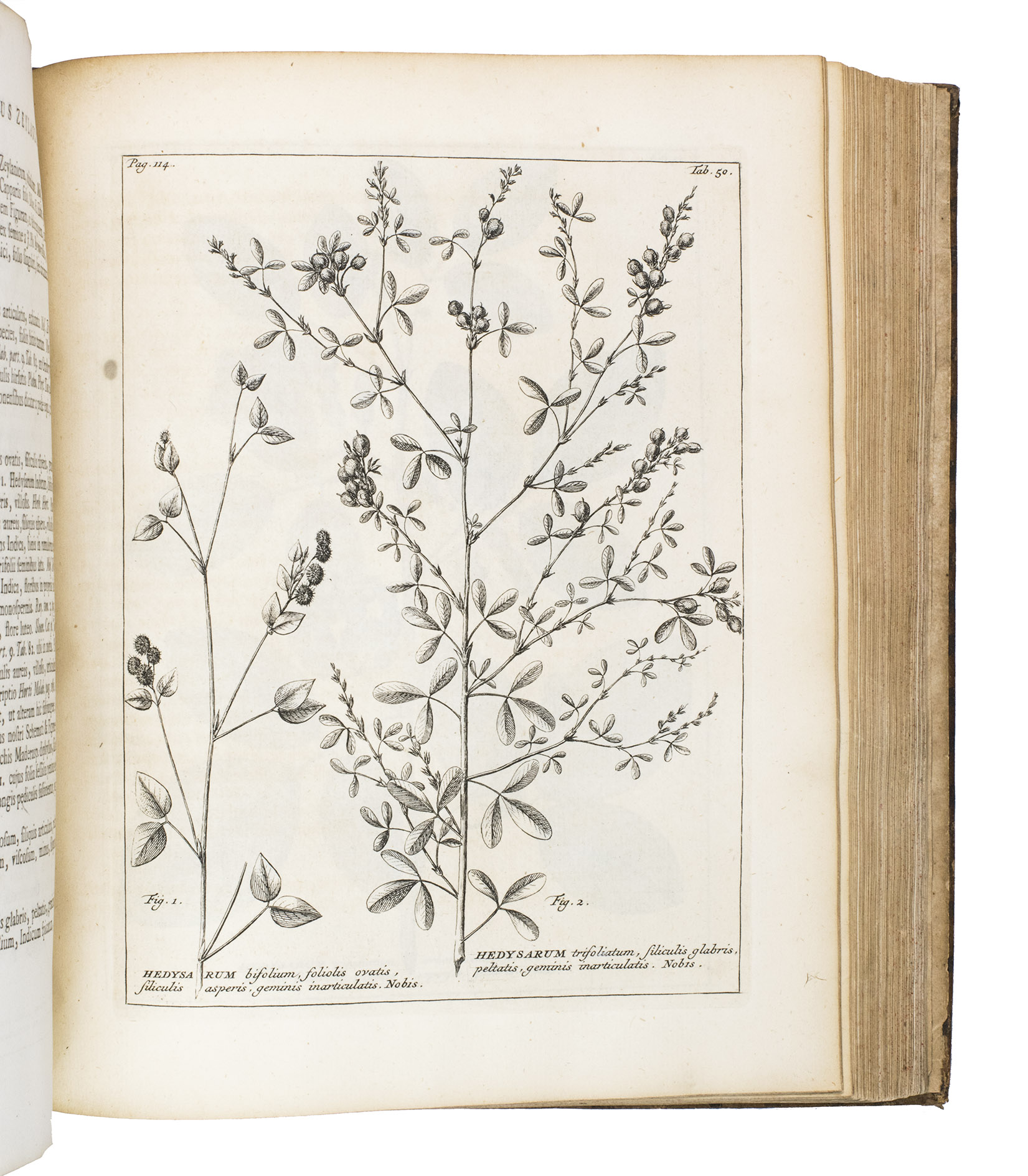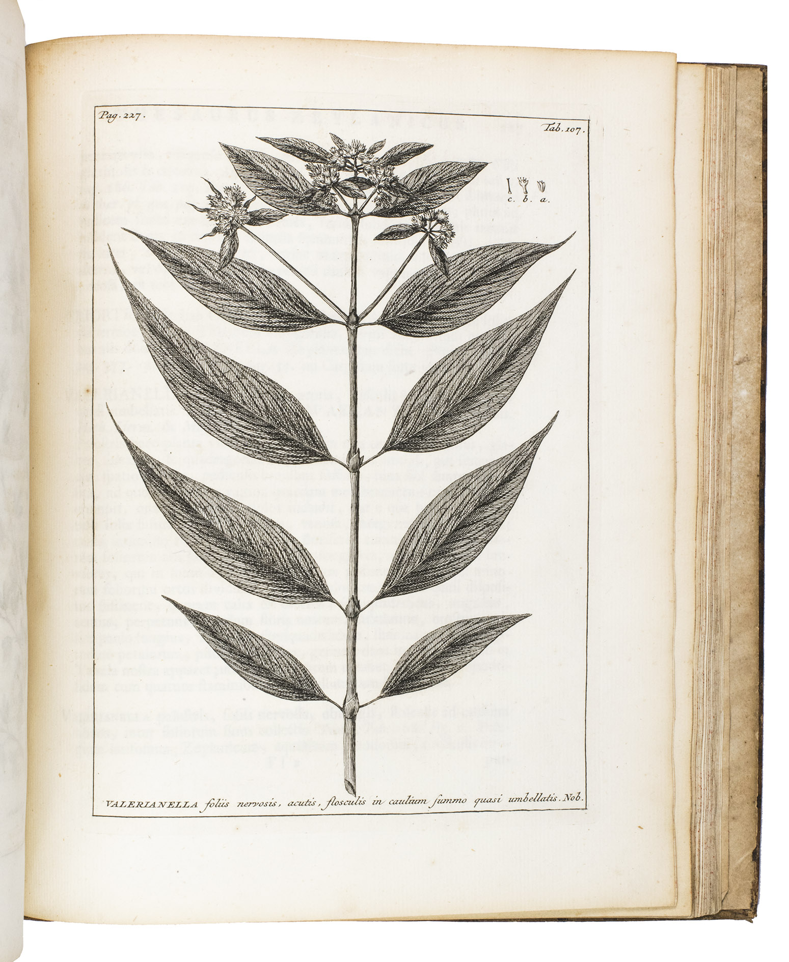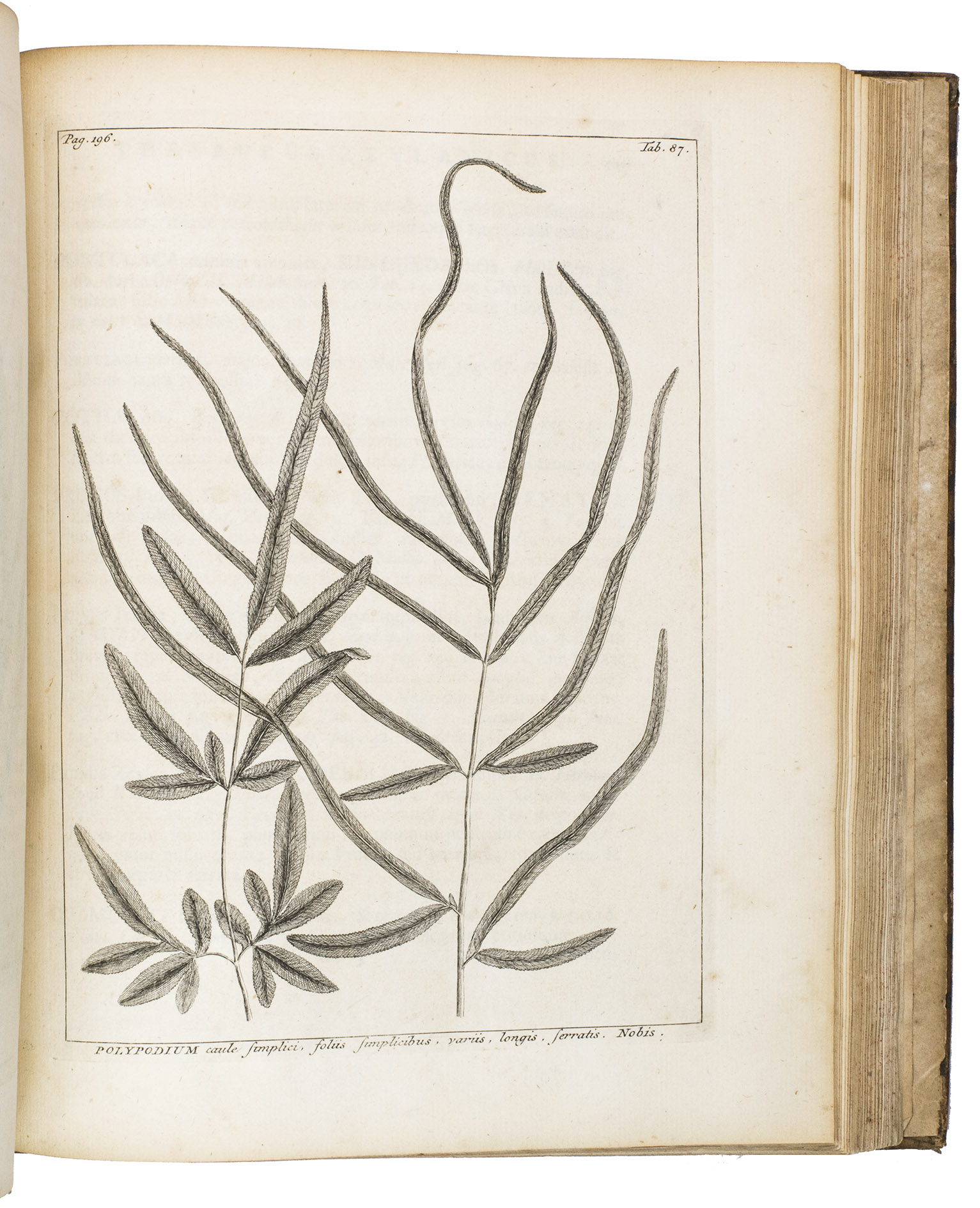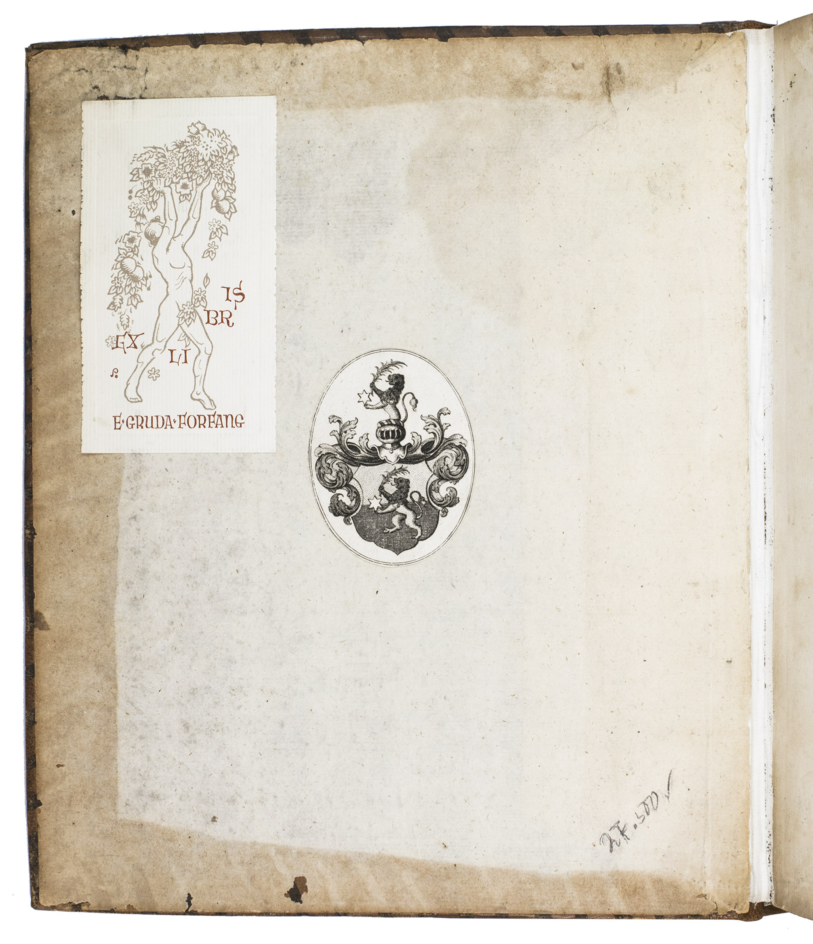 With the bookplate of E. Gruda Forfang, and an oval armorial bookplate mounted on the front pastedown. The work has been rebacked, with the original spine laid down, the leather been rubbed, affecting the gold-tooling on the spine. The hinges have been reinforced with white bookcloth, lacking the front free flyleaf, plates 47-49 have been bound in the wrong order, as usual, the head margin has been cut somewhat short, but without affecting the text of plates, later annotations (the Latin name of the depicted plant) in the lower margins of some of the plates, a very faint water stain in the outer margin of some of the leaves in the second half of the work. Otherwise in good condition. Hunt 501; Nissen BBI 303; Pritzel 1388; Stafleu & Cowan 928; STCN 180651501 (18 copies).