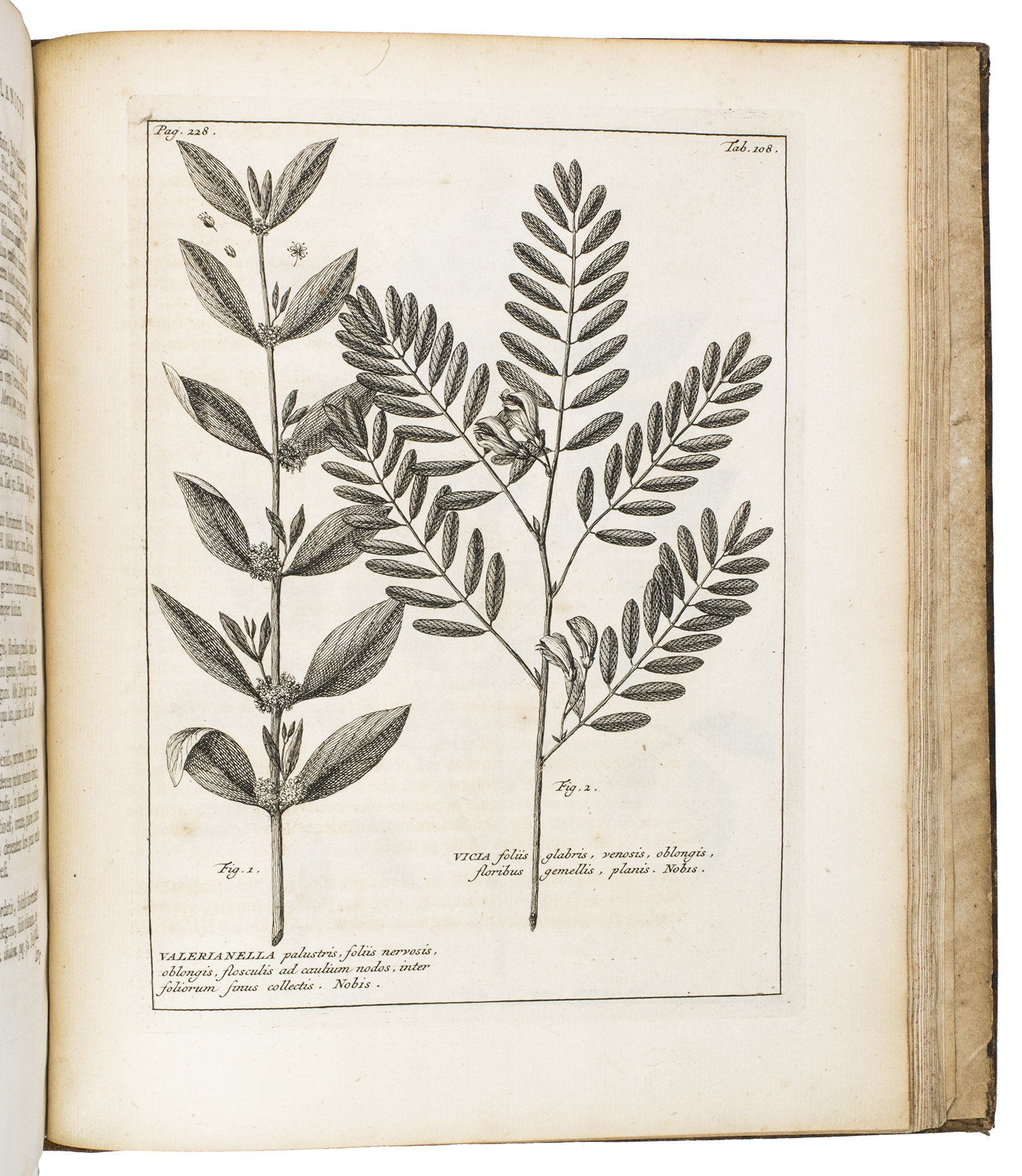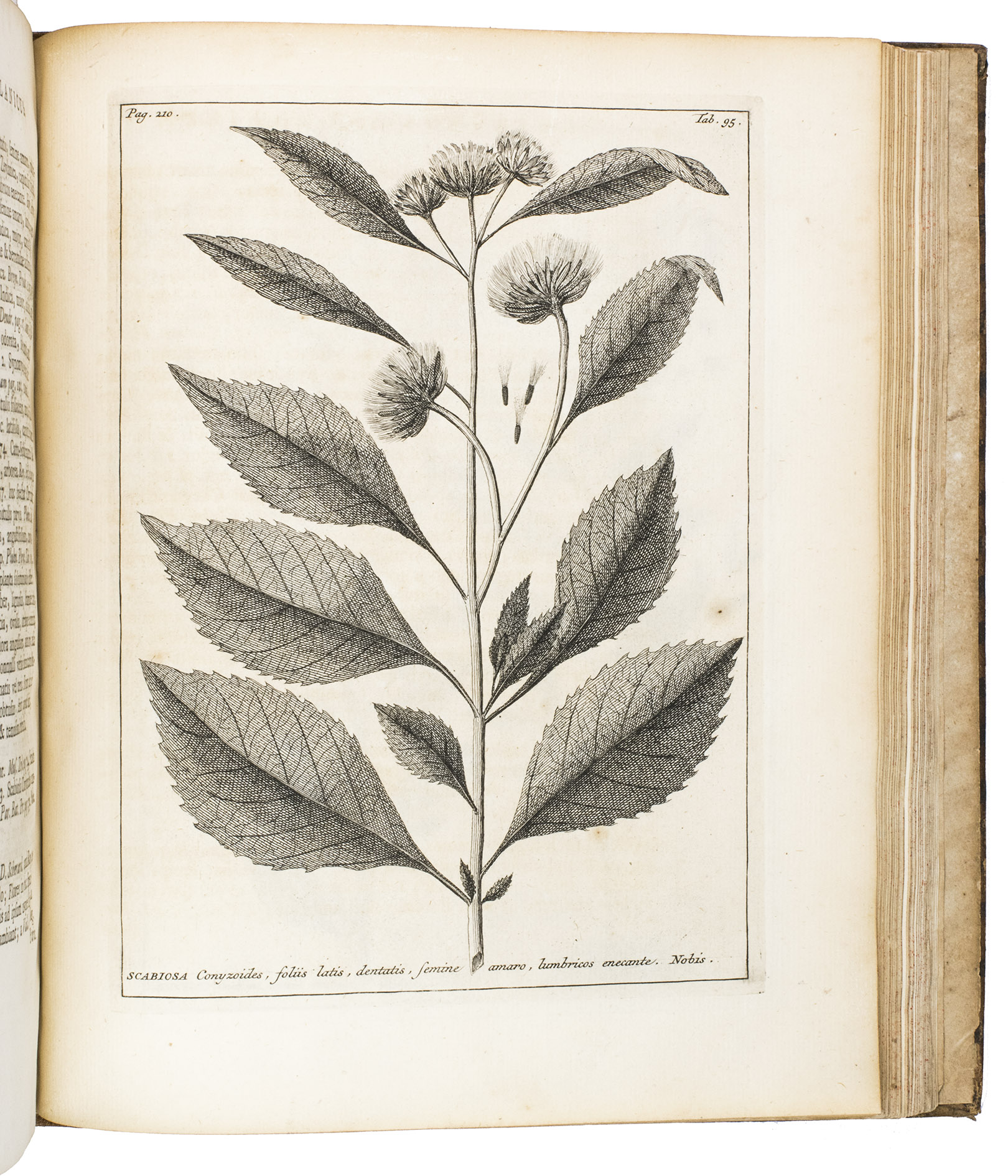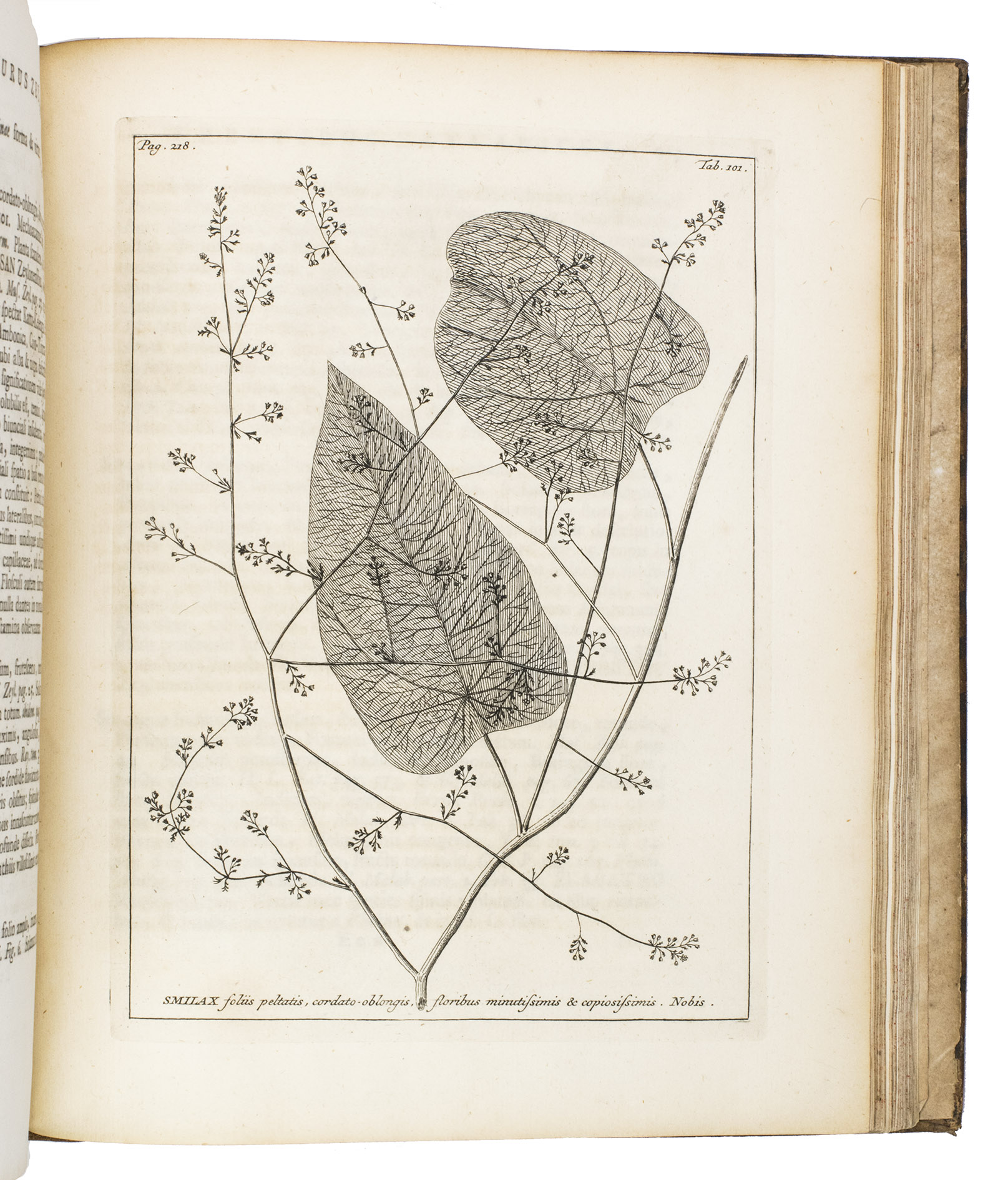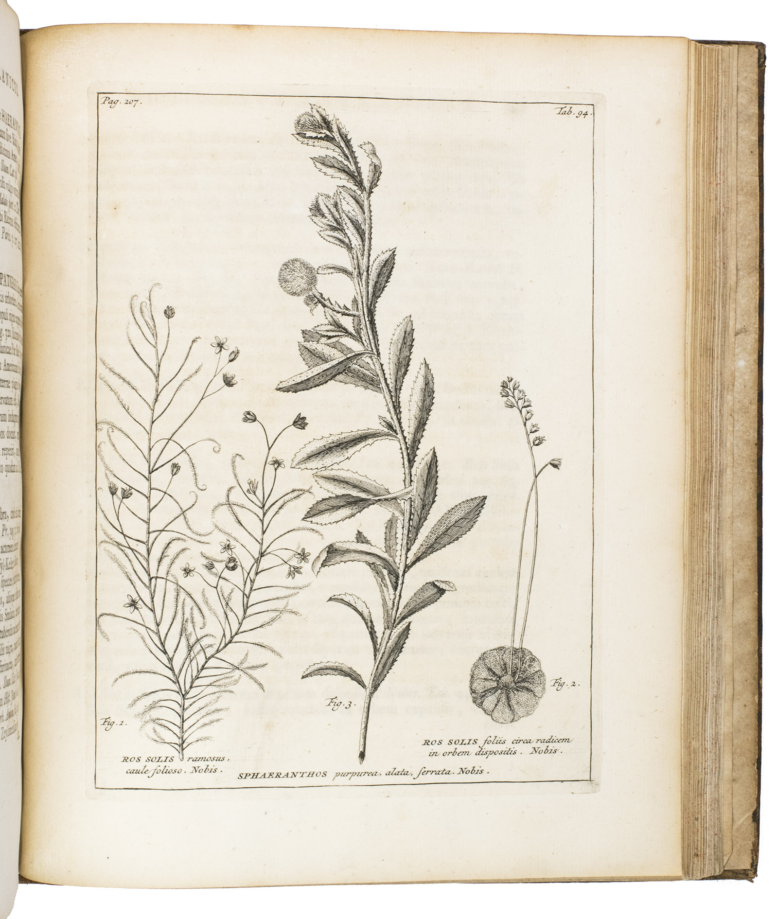 With the bookplate of E. Gruda Forfang, and an oval armorial bookplate mounted on the front pastedown. The work has been rebacked, with the original spine laid down, the leather been rubbed, affecting the gold-tooling on the spine. The hinges have been reinforced with white bookcloth, lacking the front free flyleaf, plates 47-49 have been bound in the wrong order, as usual, the head margin has been cut somewhat short, but without affecting the text of plates, later annotations (the Latin name of the depicted plant) in the lower margins of some of the plates, a very faint water stain in the outer margin of some of the leaves in the second half of the work. Otherwise in good condition. Hunt 501; Nissen BBI 303; Pritzel 1388; Stafleu & Cowan 928; STCN 180651501 (18 copies).