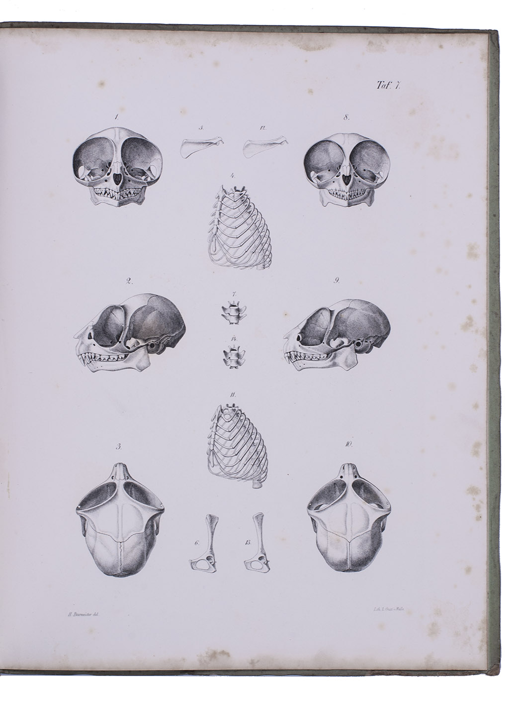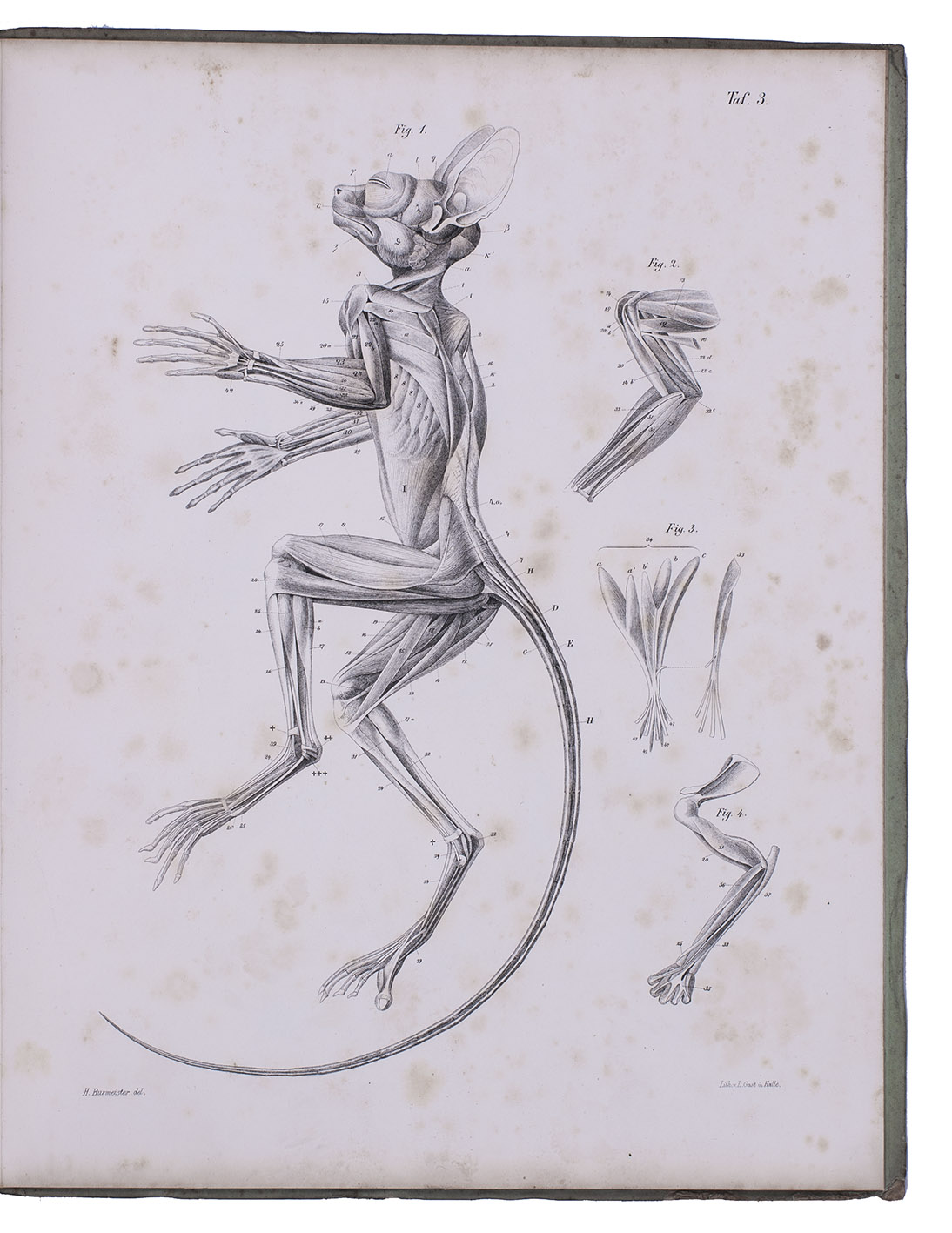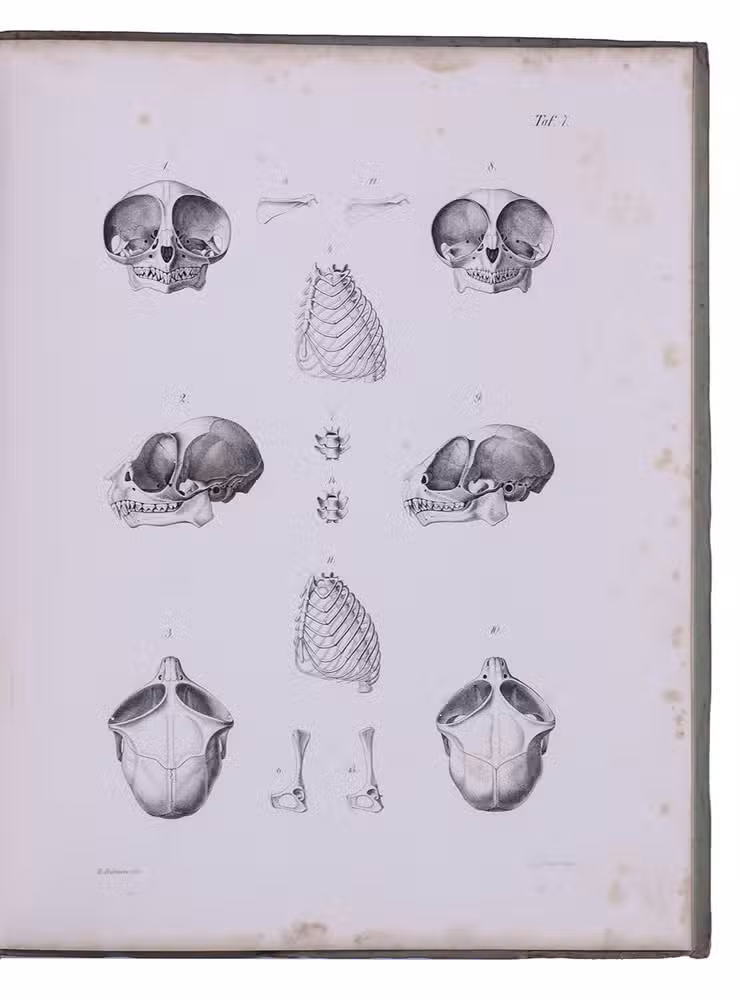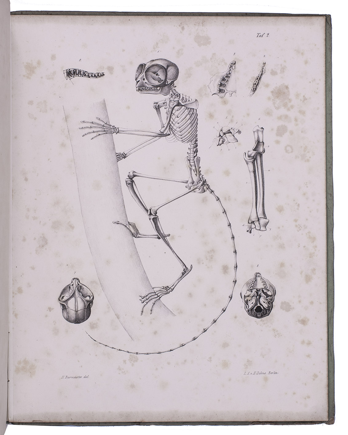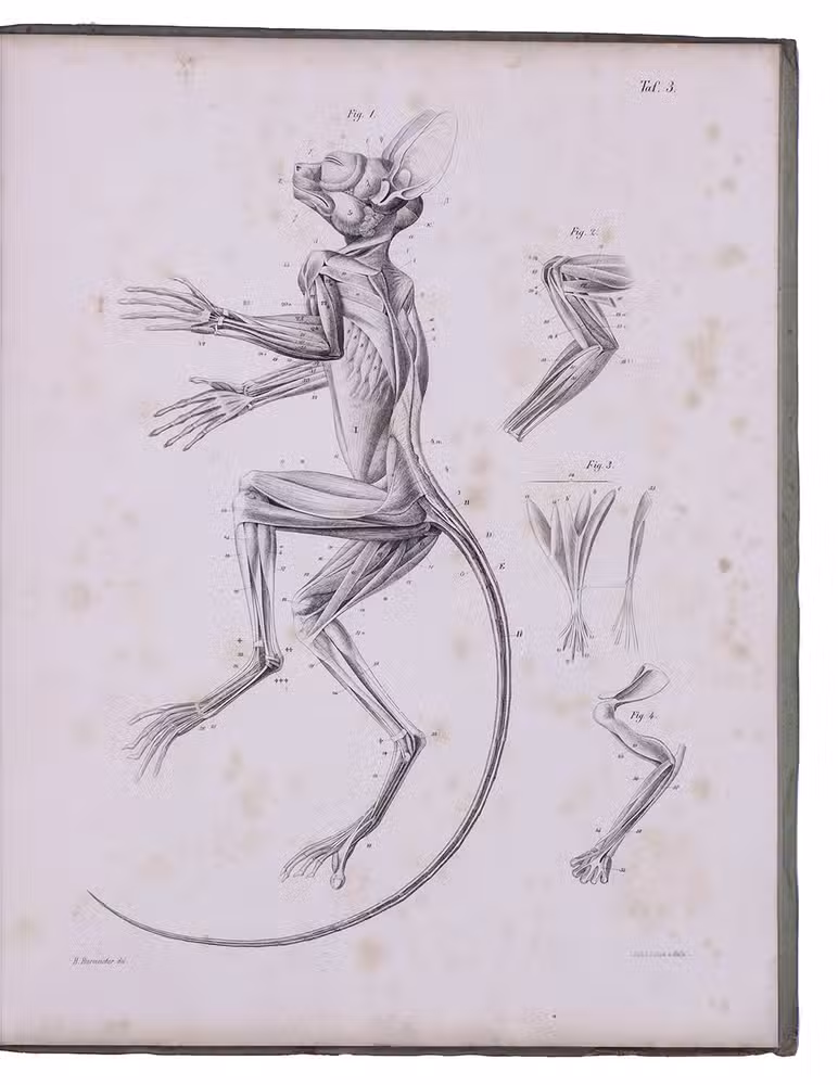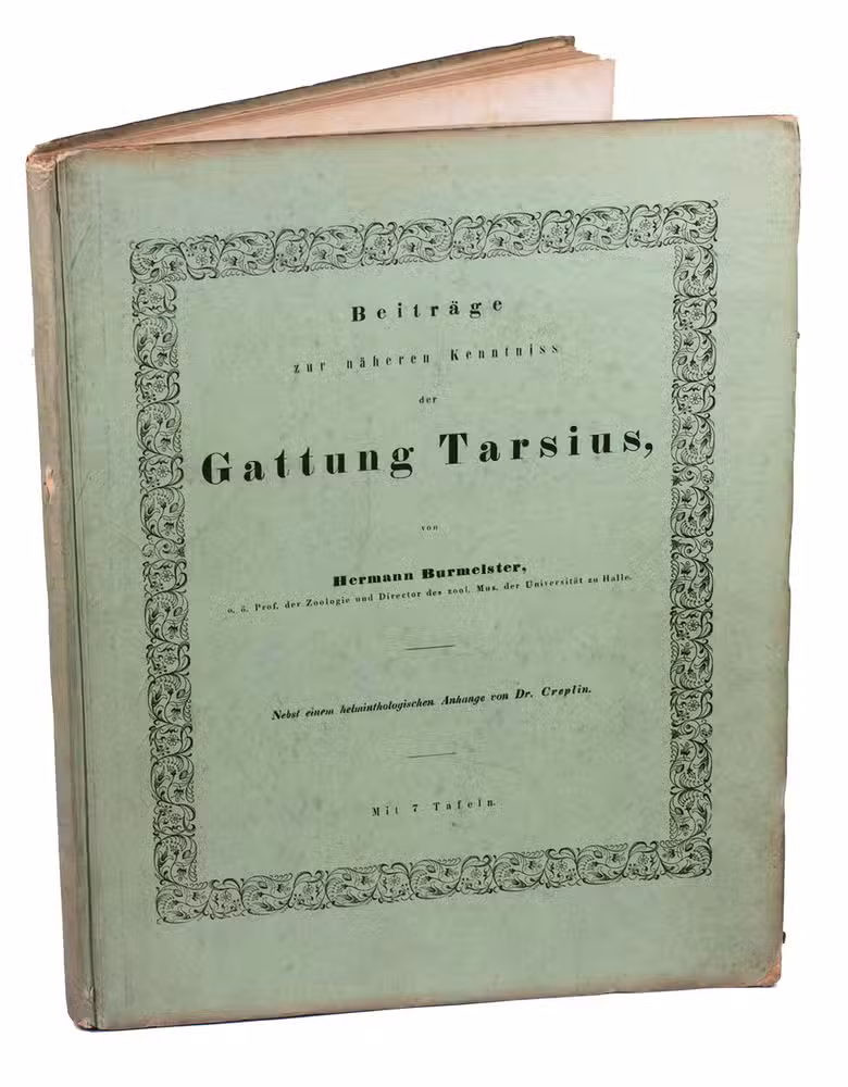 First edition of a detailed work on the genus Tarsius (tarsiers) by the German zoologist Karl Hermann Konrad Burmeister (1807-1892). Today Tarsius species can only be found on Sulawesi and a few other Indonesian islands. The work contains a historical introduction to the genus, which was first described by Buffon; a chapter on the tarsier's appearance, describing its fur and skeleton; and very detailed chapters on the animal's organs, muscular and nerve systems. The hand-coloured plate depicts a tarsier holding on to a branch, the other plates show its skeleton, muscles, nerves and organs, all with details.