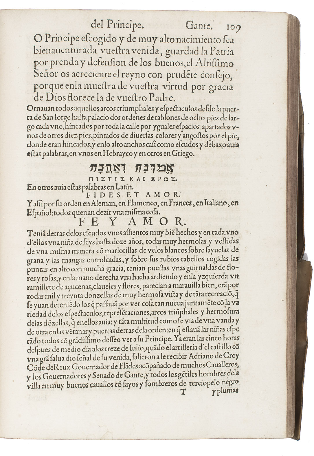 The Aragon humanist scholar Juan Cristóbal Calvete de Estrella (ca. 1510/20?-1593) served in the Spanish court of Charles V, who appointed him tutor to Prince Philip (1527-1598) in 1541. He accompanied Philip on these travels, so that his book forms an essential primary source for both the life and personality of the future King Philip II, who was to bring Spain its golden age and its greatest power and wealth, and for the early beginnings of his relations with the Netherlands, which was to revolt against the King, bring about Spain's fall from power and develop its own golden age as an independent state. Calvete de Estrella remained in Antwerp when Philip returned to Spain, having his book printed there. It is an excellent piece of book production, anticipating the role Antwerp was to play as Europe's leading centre of printing and publishing.