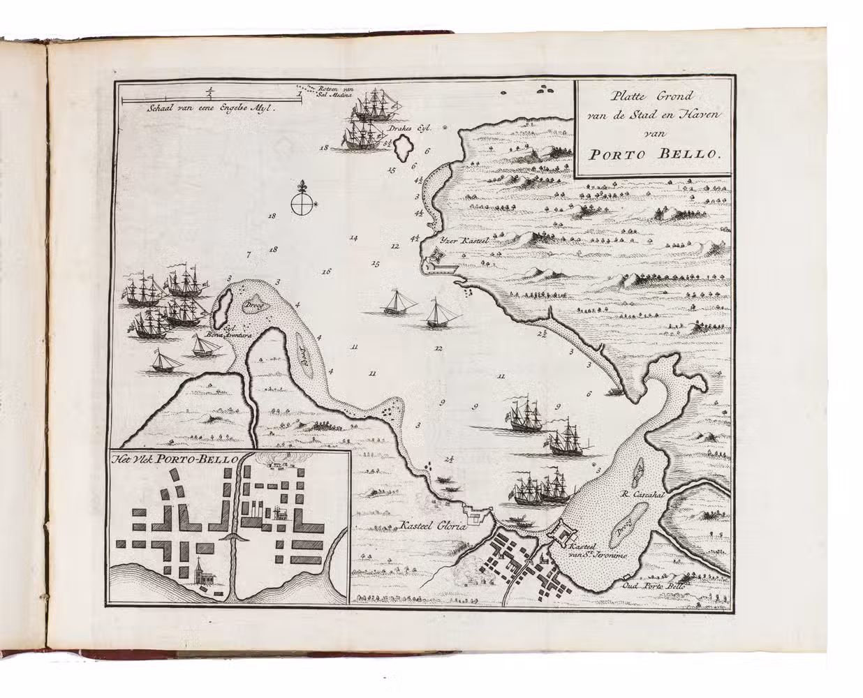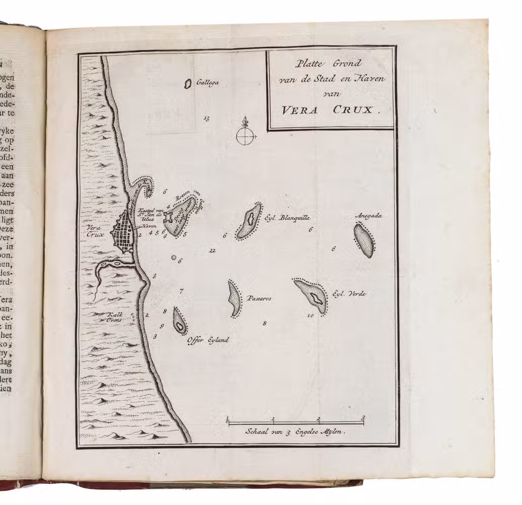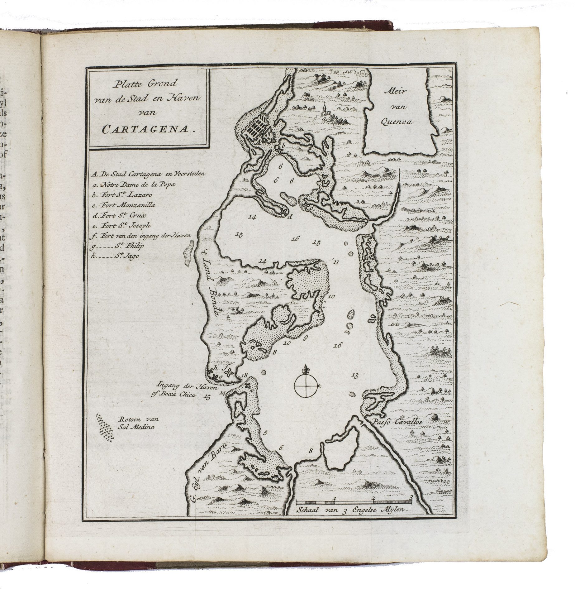 Amsterdam, Bernardus Mourik, [ca. 1745 or ca. 1748]. 8vo. With 4 folding engraved maps, showing the city and harbours of Veracruz, Havana, Portobelo and Cartagena. Contemporary red half sheepskin (roan). [8], 328 pp.