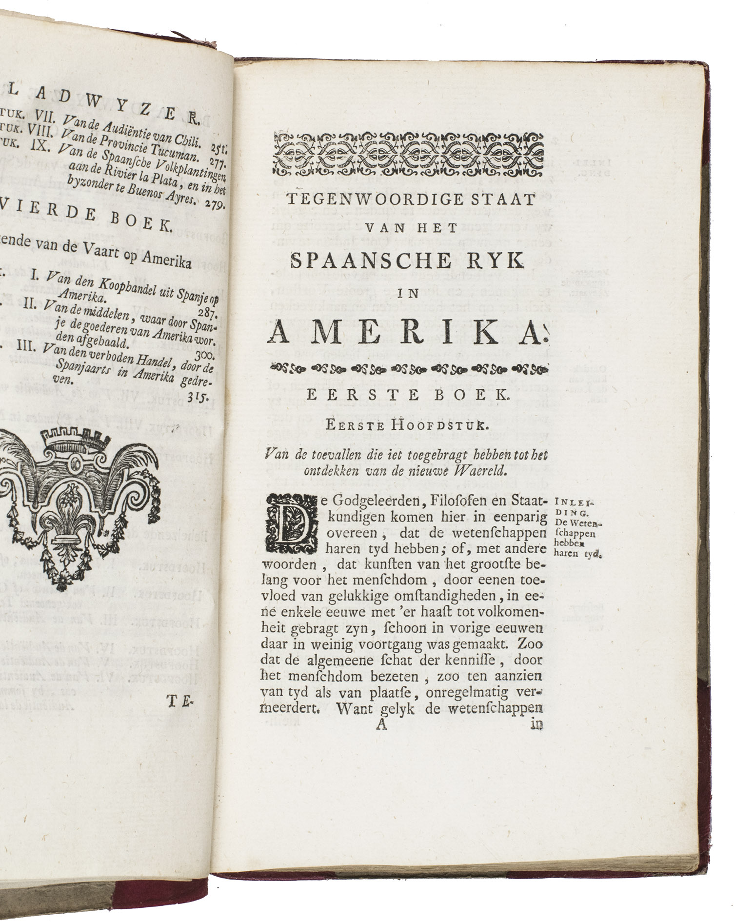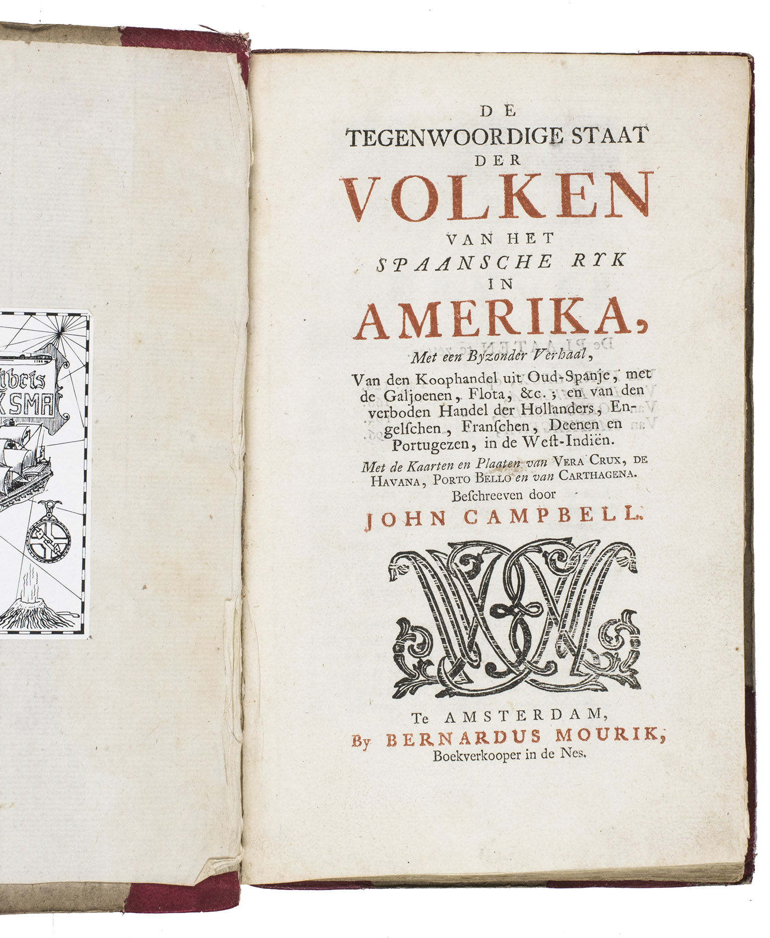 Rare second issue of the first and only edition of a Dutch translation of A concise history of the Spanish America (1741), by the prolific Scottish author John Campbell (1708-1775). The work is divided into 4 parts, the first on the discovery of America, the second on the Spanish settlement in North America, the third a description of South America, and the fourth on the trade with America. The second and third part contain chapters on Buenos Aires, California, Charcas, Chile, Cuba, Florida, Guatemala, Lima, Mexico, Puerto Rico, Panama, Tucuman Province and Quito.