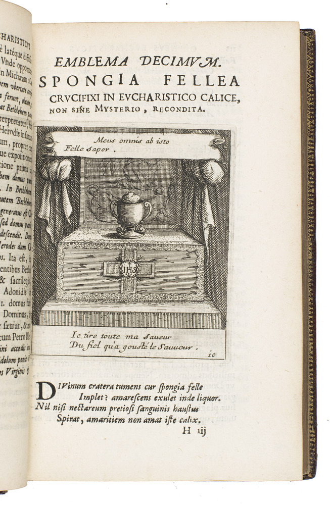 First edition of a remarkable religious emblem book by Augustin Chesneau (1615-after 1669). The emblems, each with a Latin title above and French moralising couplet below engraved in the plate, are by the Flemish painter and engraver Albert Flamen (1620-1674). Flamen's engravings mainly show landscapes and animals such as birds, fish, Whale, dolphin, reptiles, trees, ships and various people. Greek and Christian mythological symbols are used in the emblems, apparently combined into a new mythology. Flamen's style in engraving reminds of that of Wenceslaus Hollar, and a lot of his images are connected with the world of animals, as is also the case in this work. This edition was re-issued in 1659 as the "editio secunda", with a cancelled letterpress title page. A French edition was published by the same publisher in 1667 as Emblèmes sacrez sur le tres-saint et tres-adorable sacrement de l'eucharistie.