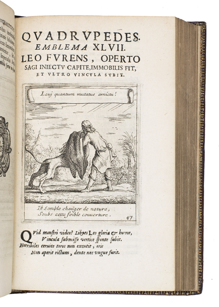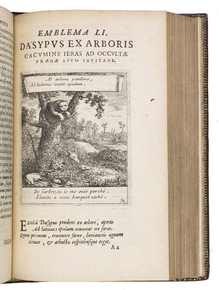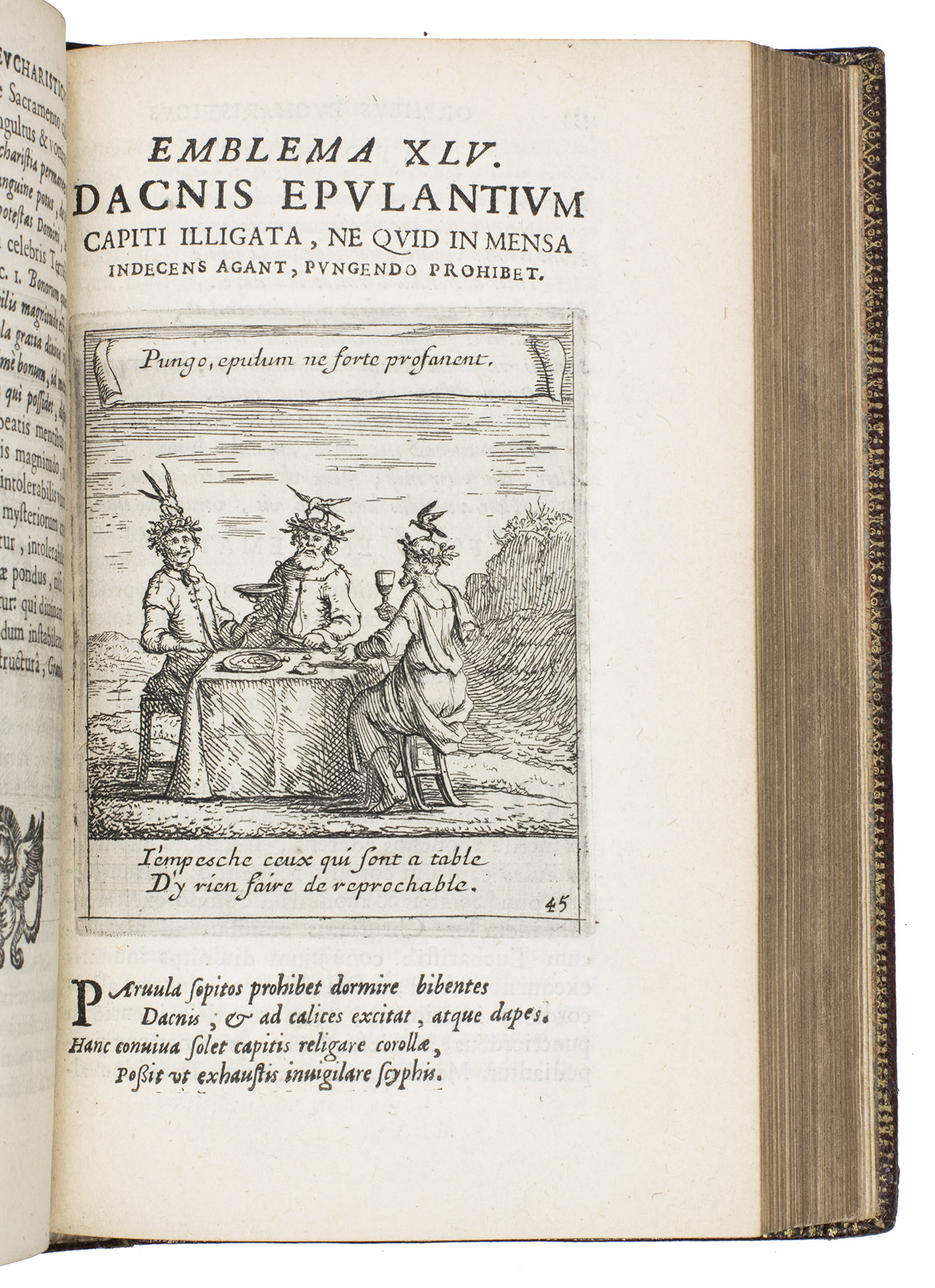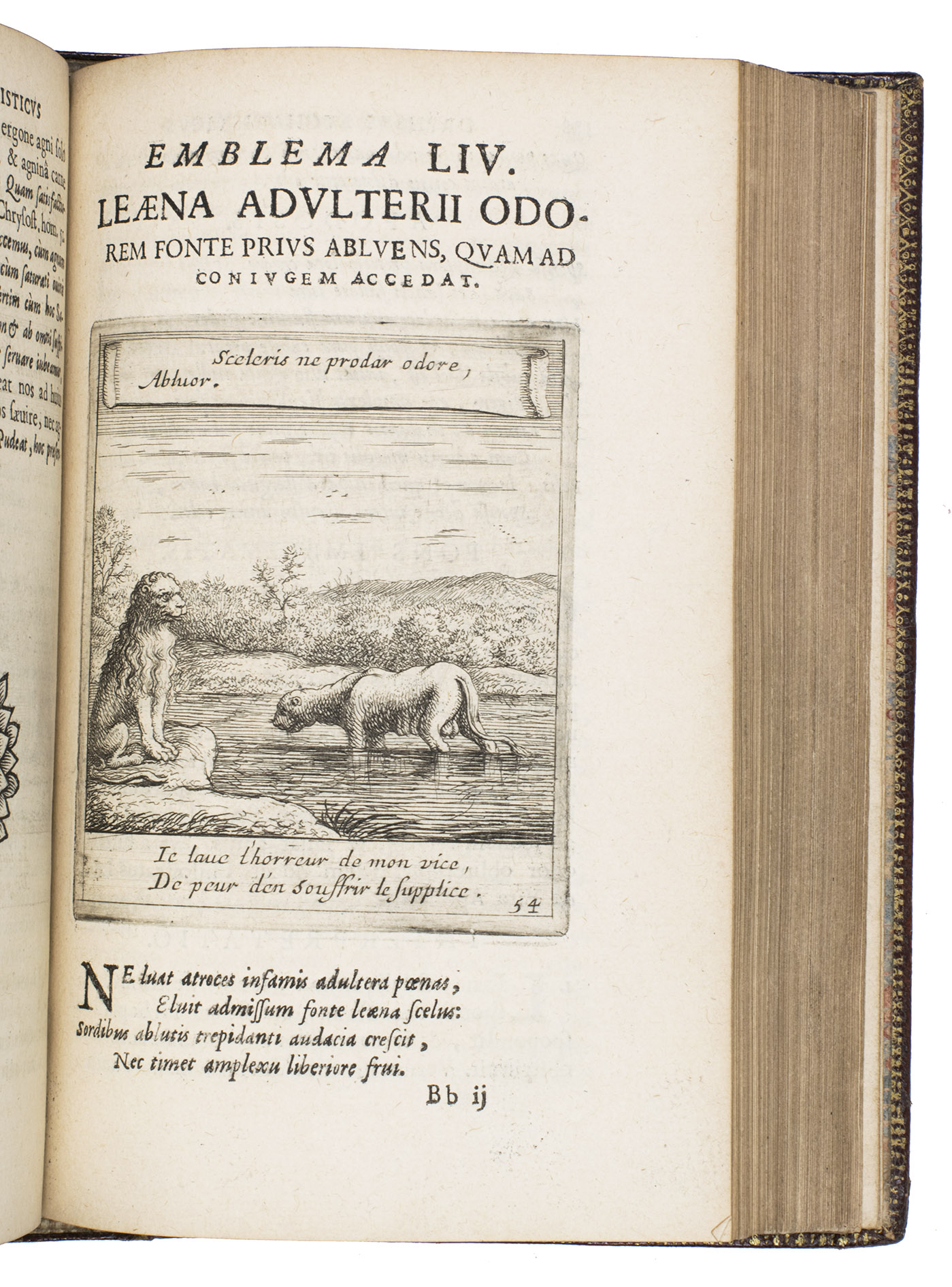 Binding with minor traces of use; p. 353 with small part of blank margin restored. Very good copy in red morocco. Adams, Rawles and Saunders F.181; Landwehr, Romanic Emblem Books 224; Praz 304; not in USTC.