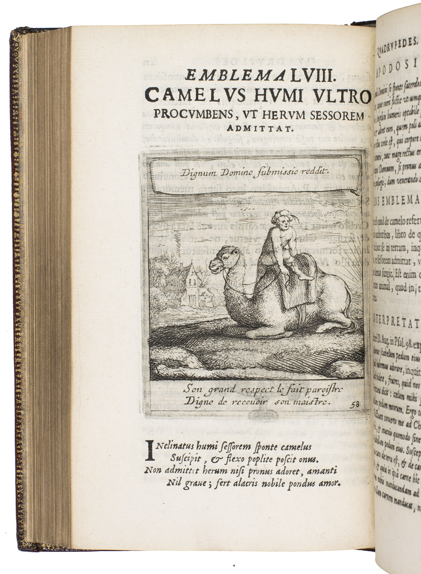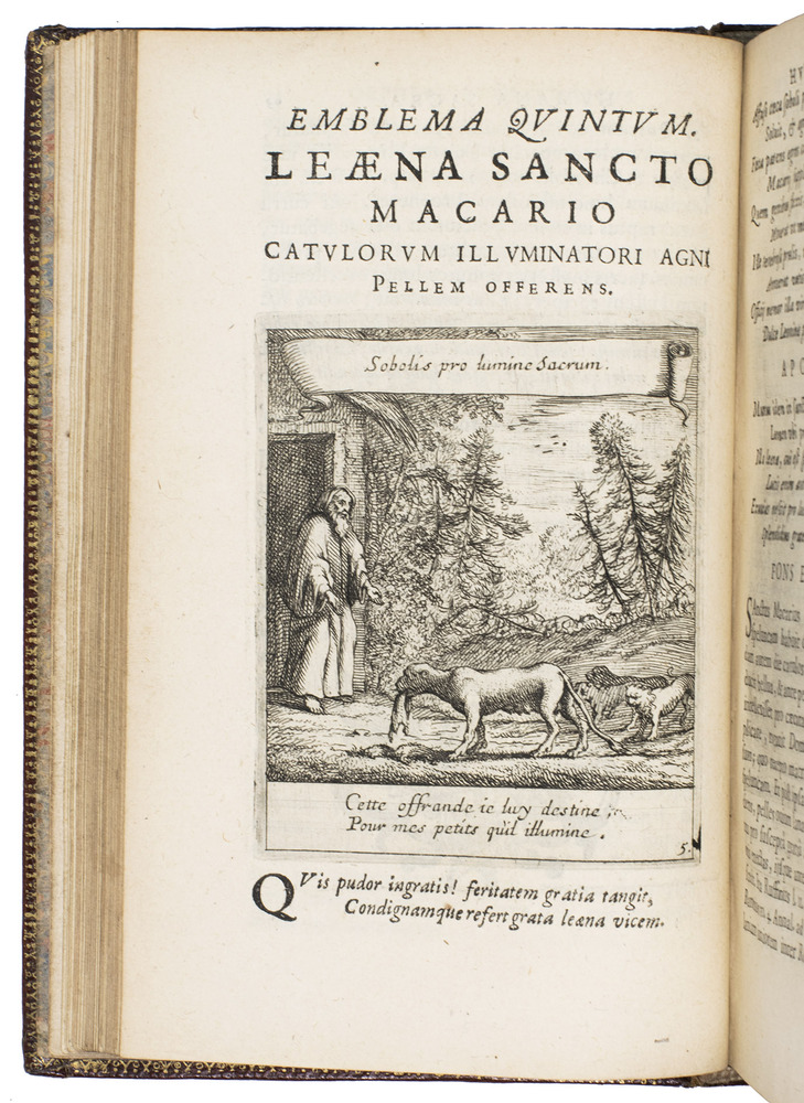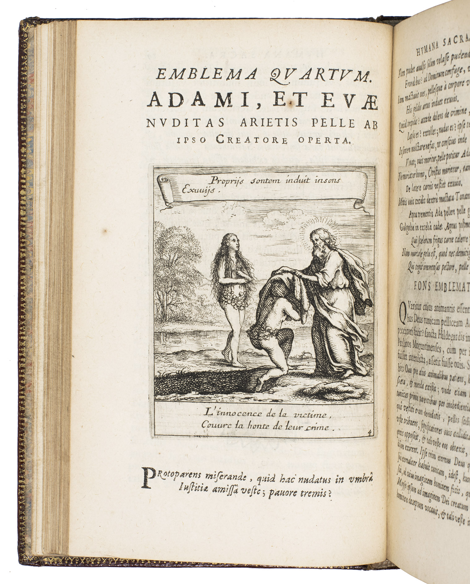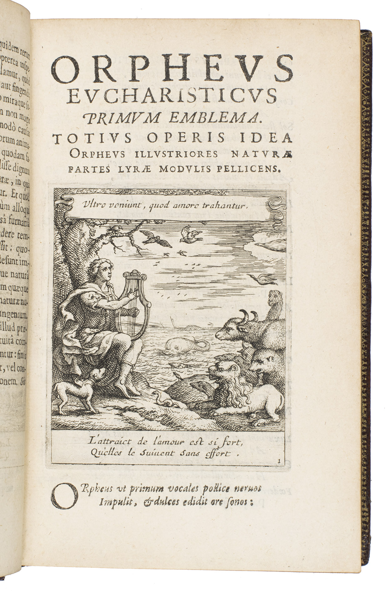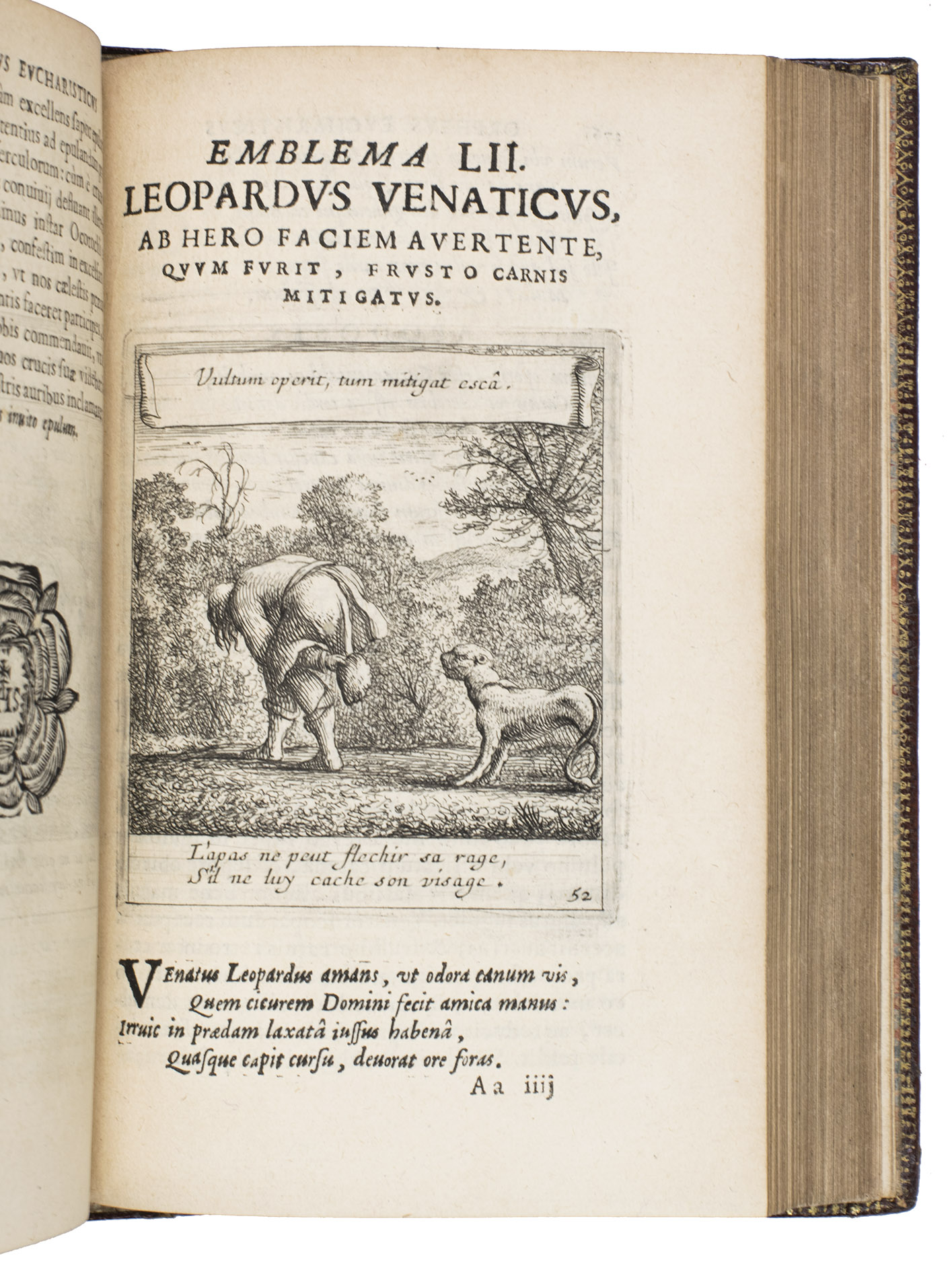 Paris, Florentin Lambert, 1657. 8vo. With an engraved title page, a typographical title page with a small woodcut ornament, 101 engraved emblems by Albert Flamen in the text (1 unnumbered on page 5, 100 numbered I-C), further with woodcut initials and woodcut tailpieces. Late 17th- or early 18th-century gold-tooled red morocco. 699, [33] pp.