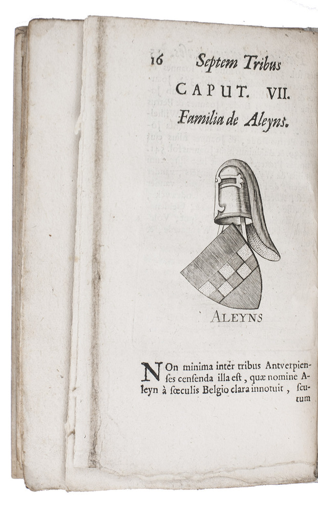 Genealogy of the seven noble houses of Antwerp and chronology of the magistrates of the city. Magistrate offices in Antwerp were traditionally divided between members of the seven patrician families, whose members were supposedly descendants of the companions of the legendary Silvius Brabo. Christyn gives each of these families a short description and genealogy together with an illustration of the family crest. The second part of the book lists the magistrates of the city, with most of the lists starting in the 13th or 14th century.