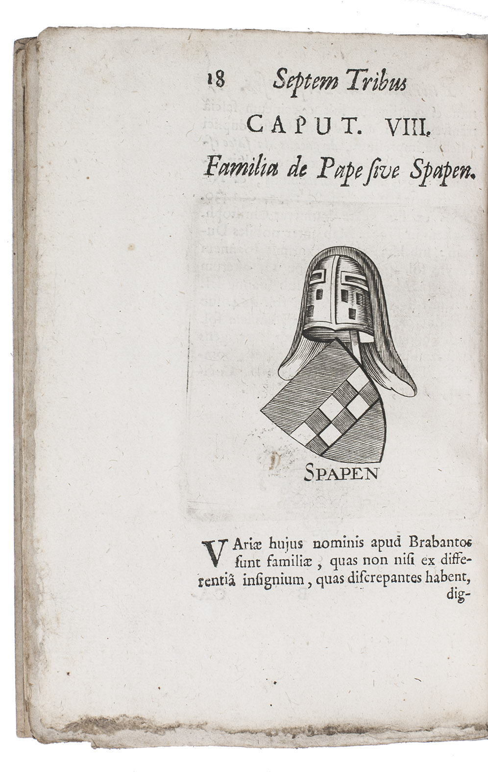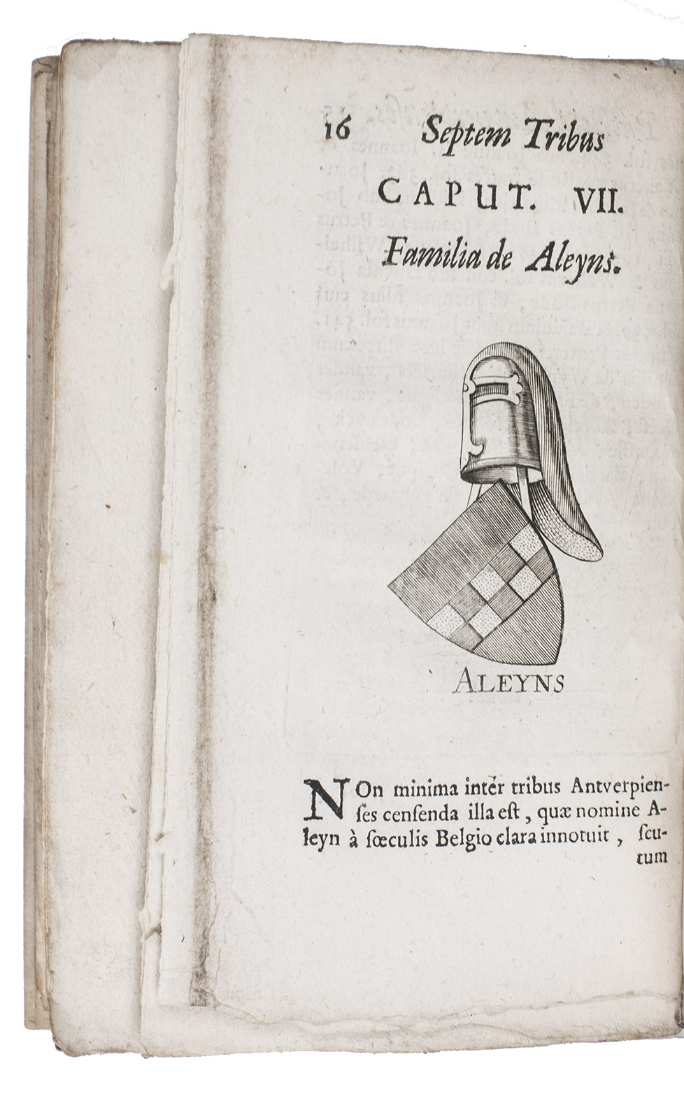 Leiden, Petrus Heghius [printed in Brussels by Philippe Vleugart], 1672. 8vo. With an allegorical frontispiece showing a personification of time accompanying the crests of the seven houses above personifications of the Scheldt and the city of Antwerp and 7 engraved coatsofarms in text. Modern half parchment, red paste paper sides. [10], 55 pp.