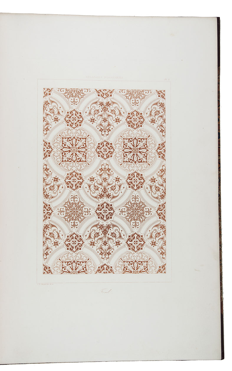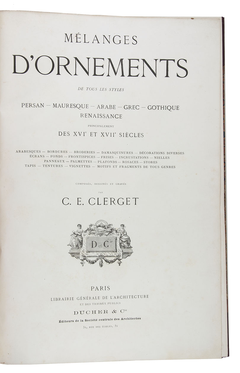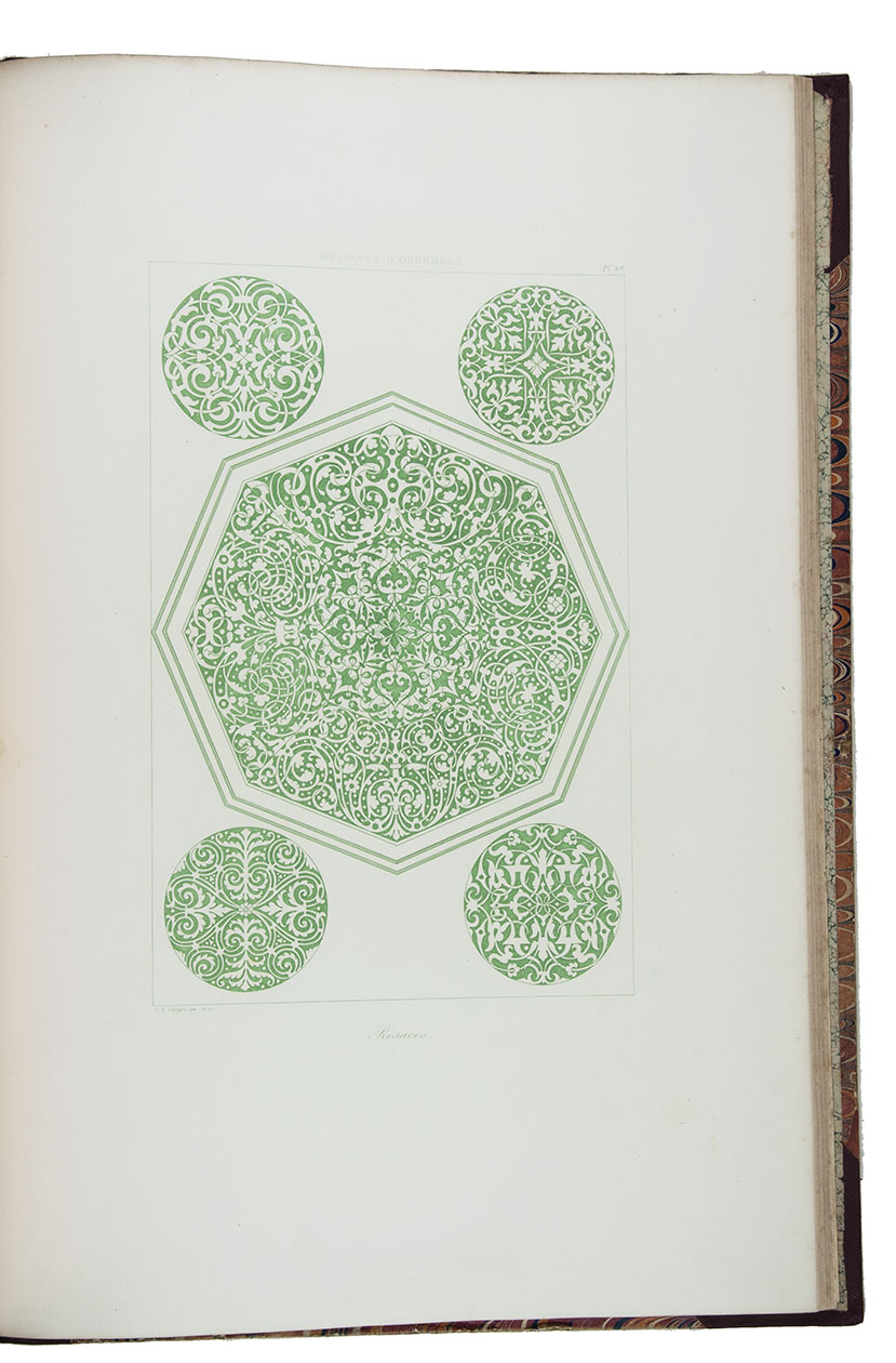 A splendid display of ornament in a wide variety of mostly Islamic-influenced styles, described as Persian, Moorish, arabesque, Greek, gothic and renaissance. Although many "arabesque" styles had been used in Europe under various names, Europe's growing colonial and trade relations with the Islamic world in the early 19th-century led to a greater familiarity with Islamic ornament and a new fashion for its application in Western art. The present plates were conceived, drawn and "engraved" by Charles Ernest Clerget (1812-1875?) and originally published by Émile Leconte in 2 parts (issued in 12 sub-parts) from 1837 to 1838. They were intended in part as models for artists and architects.