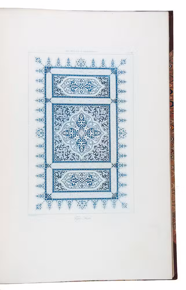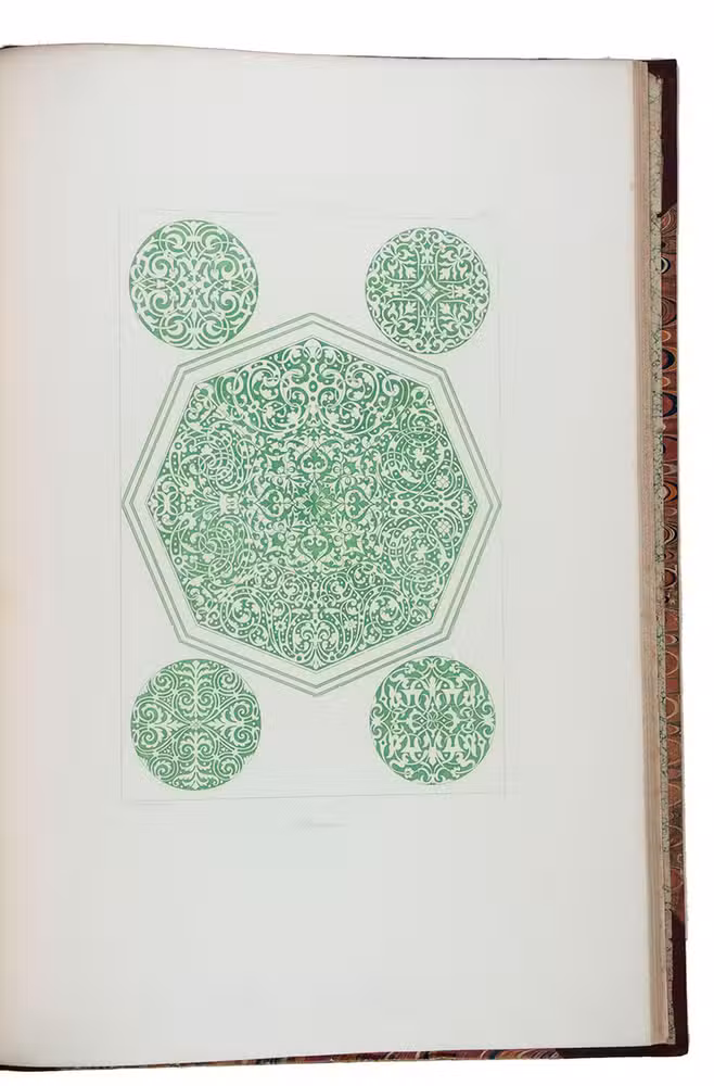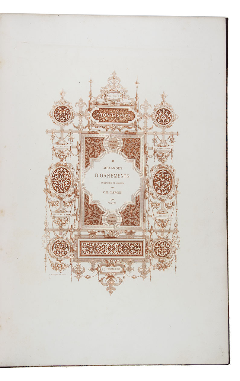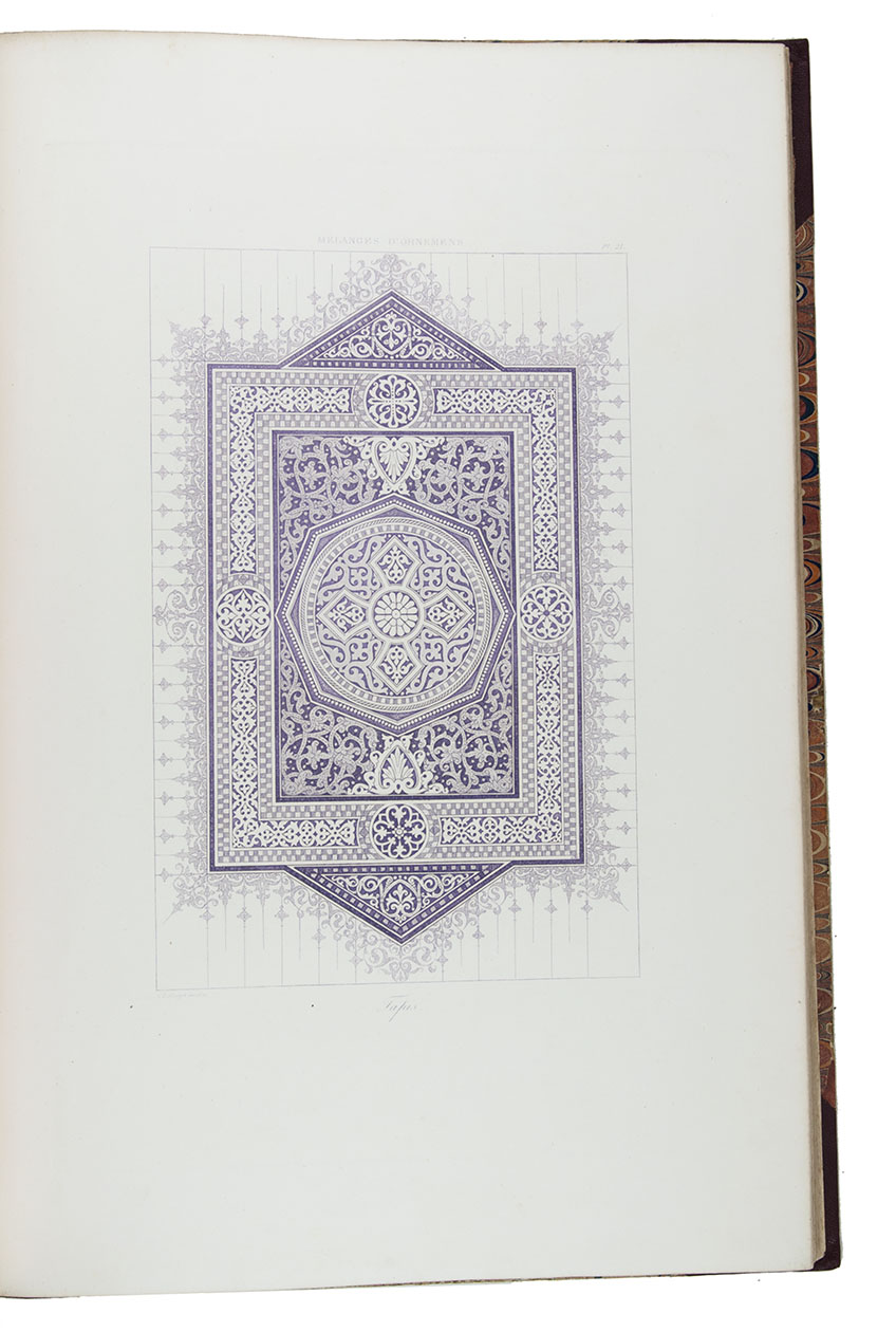 A splendid display of ornament in a wide variety of mostly Islamic-influenced styles, described as Persian, Moorish, arabesque, Greek, gothic and renaissance. Although many "arabesque" styles had been used in Europe under various names, Europe's growing colonial and trade relations with the Islamic world in the early 19th-century led to a greater familiarity with Islamic ornament and a new fashion for its application in Western art. The present plates were conceived, drawn and "engraved" by Charles Ernest Clerget (1812-1875?) and originally published by Émile Leconte in 2 parts (issued in 12 sub-parts) from 1837 to 1838. They were intended in part as models for artists and architects.