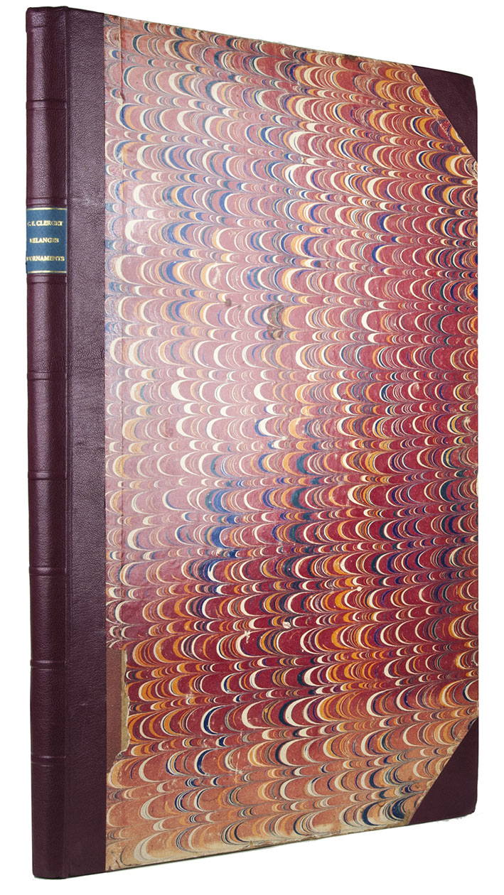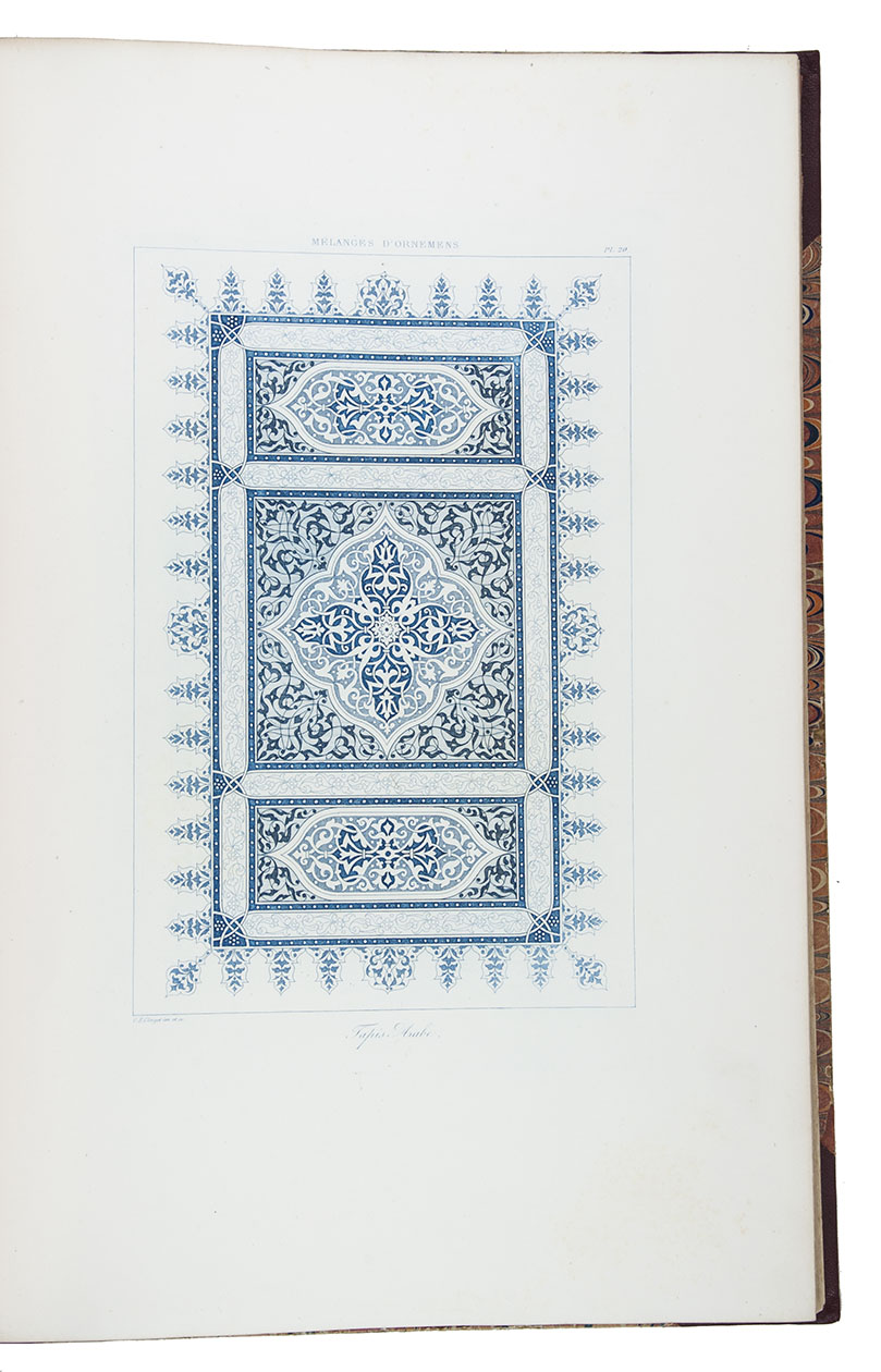 Paris, Ducher & Cie (colophon: printed by Eugène Heutte & Cie), [ca. 1880 (engraved 1837-1838)]. Royal folio (45 x 31 cm). With 2 elaborately ornamented part-titles, 70 numbered ornament plates (all 72 plates "engraved" on litho stones, image area mostly 26.5 x 17 cm) and a letterpress list of the plates. With each plate printed in blue, green, violet, ochre, red, black or brown (several shades) and 9 printed in 2 colours. Contemporary half red cloth, rebacked and with new corners in red goatskin morocco. [2] ll. plus [1], 37, [1], 38-70 plates.