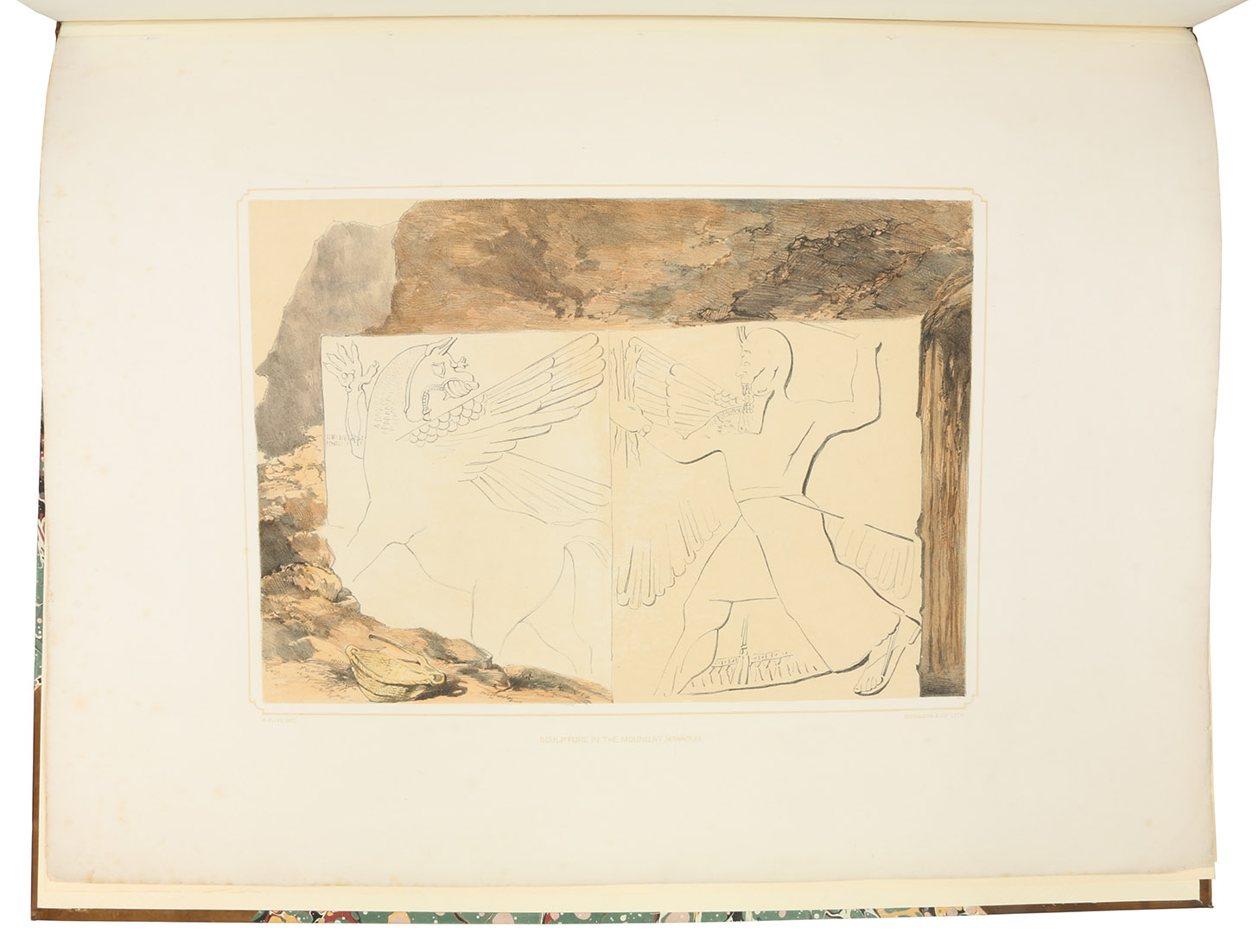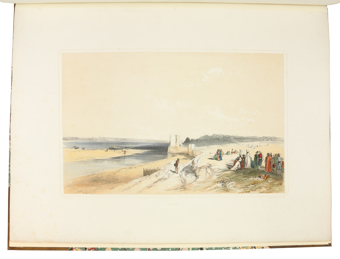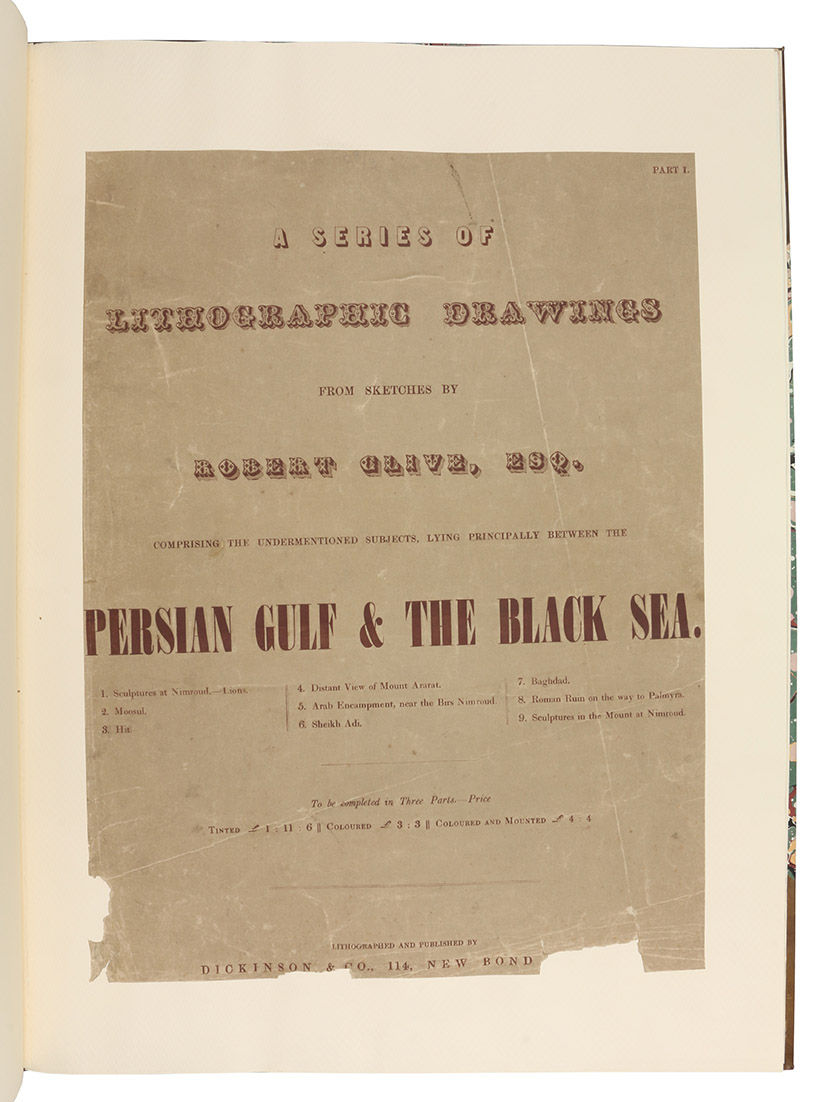 First edition of a rare lithographic plates book of Mesopotamian antiquities and views. The first instalment of a total of three, containing nine lithographs: 1. Sculptures at Nimroud-Lions; 2. Moosul; 3. Hît; 4. Distant view of Mount Ararat; 5. Arab encampment near the Birs Nimroud (on one sheet ); 6. Sheikh Adi; 7. Baghdad; 8. Roman ruin on the way to Palmyra; 9. Sculptures in the Mount at Nimroud. The Victoria and Albert Museum ascribes this work to the artist Robert Charles Clive (1827-1902).