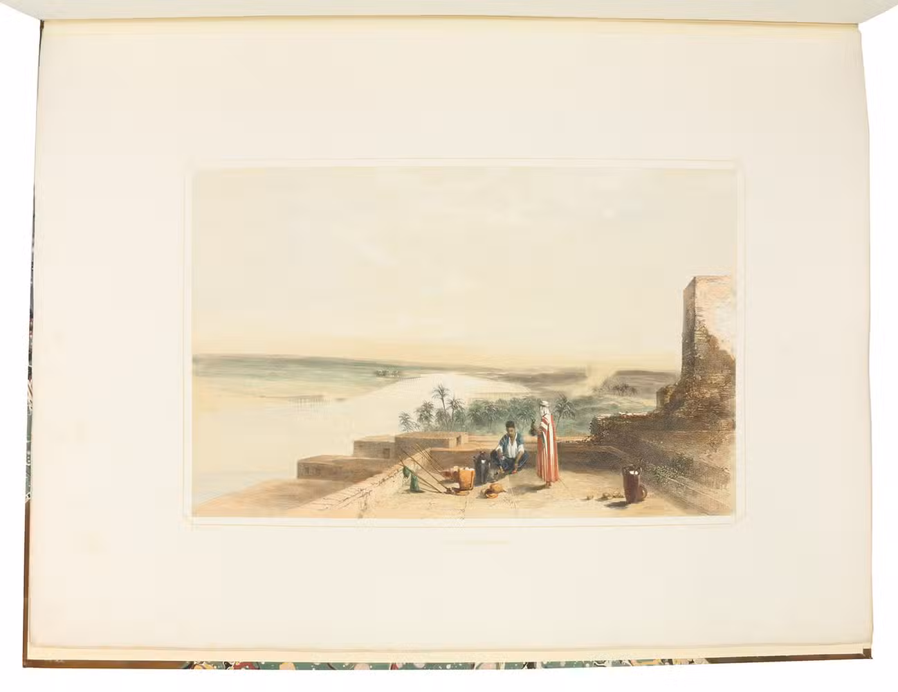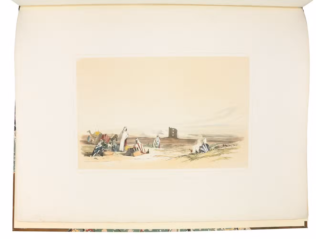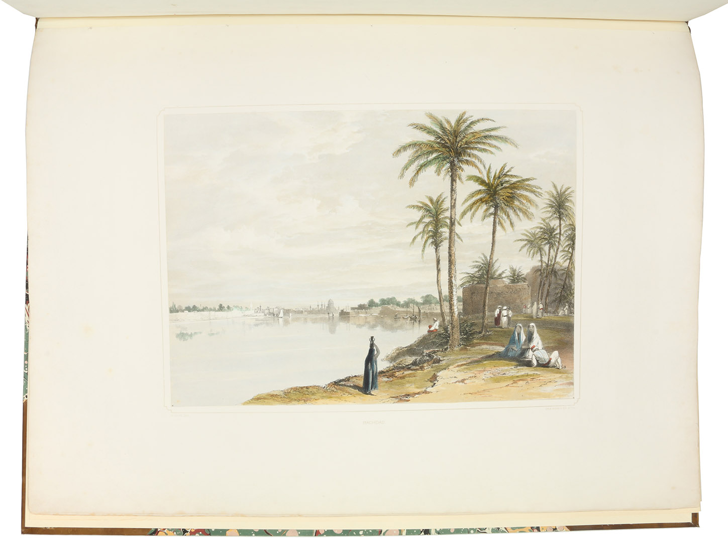 First edition of a rare lithographic plates book of Mesopotamian antiquities and views. The first instalment of a total of three, containing nine lithographs: 1. Sculptures at Nimroud-Lions; 2. Moosul; 3. Hît; 4. Distant view of Mount Ararat; 5. Arab encampment near the Birs Nimroud (on one sheet ); 6. Sheikh Adi; 7. Baghdad; 8. Roman ruin on the way to Palmyra; 9. Sculptures in the Mount at Nimroud. The Victoria and Albert Museum ascribes this work to the artist Robert Charles Clive (1827-1902).
