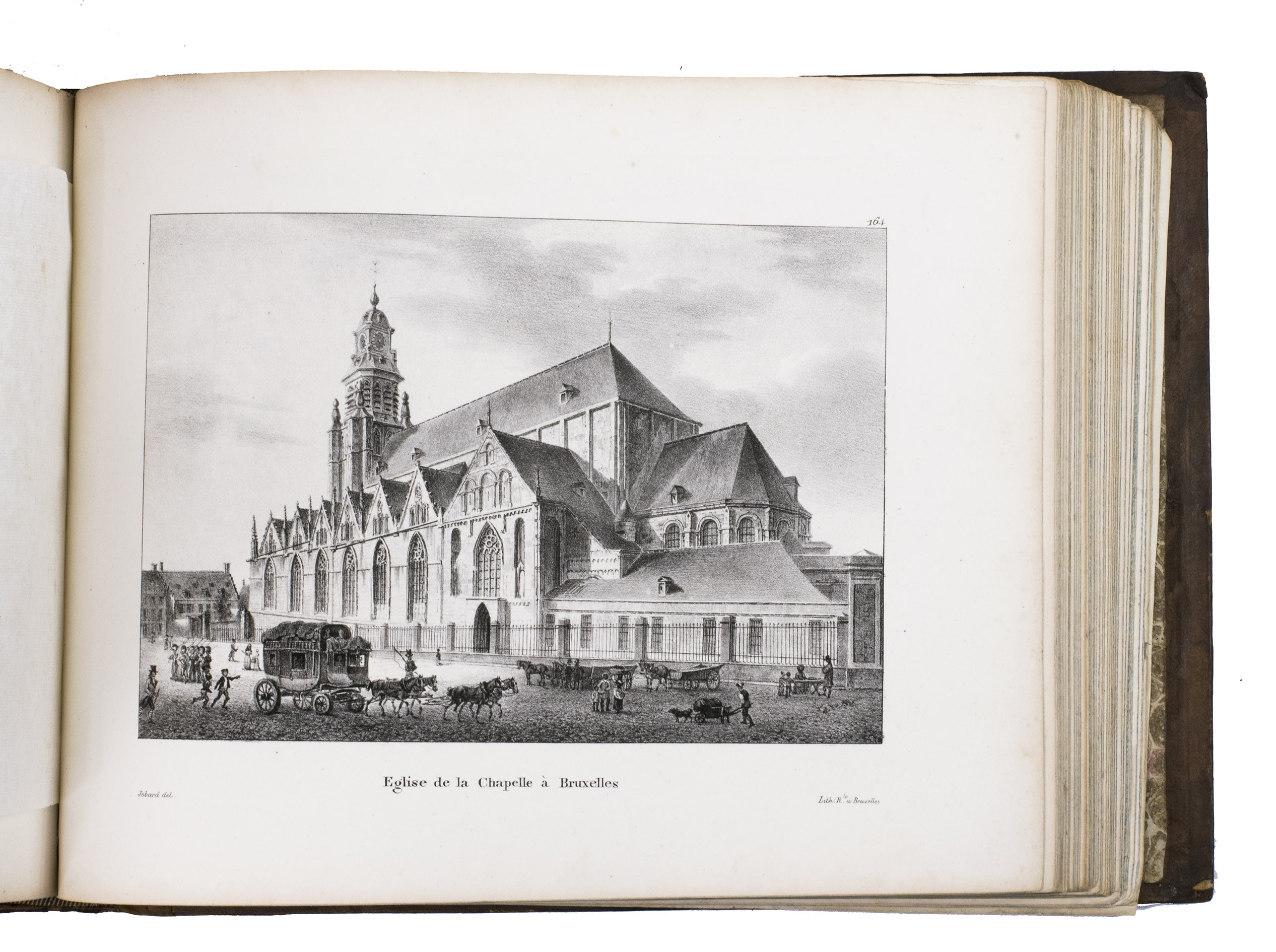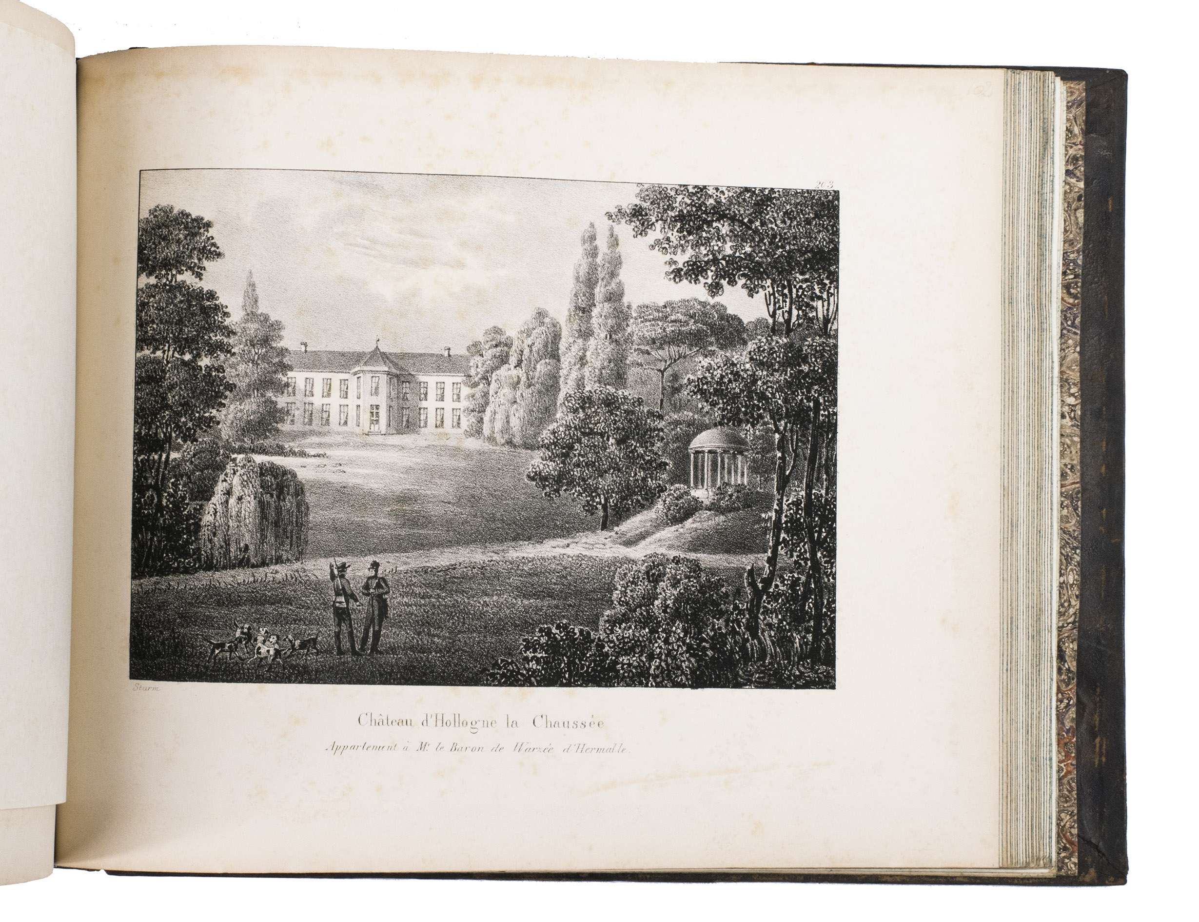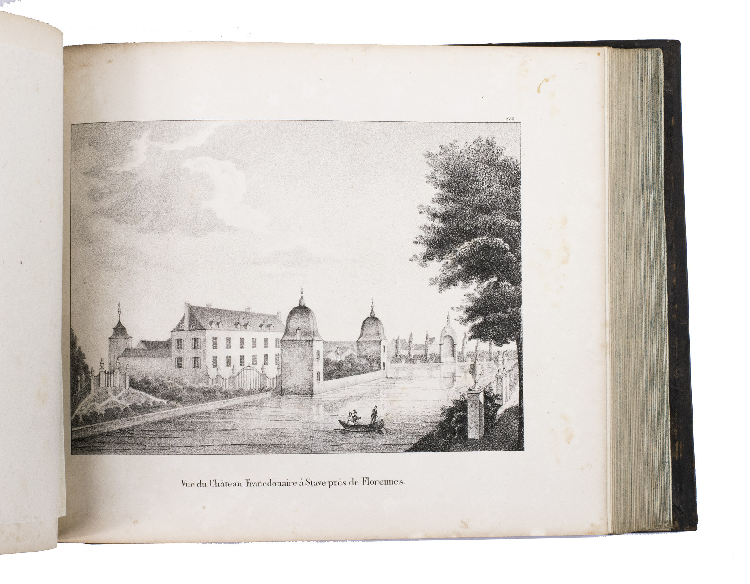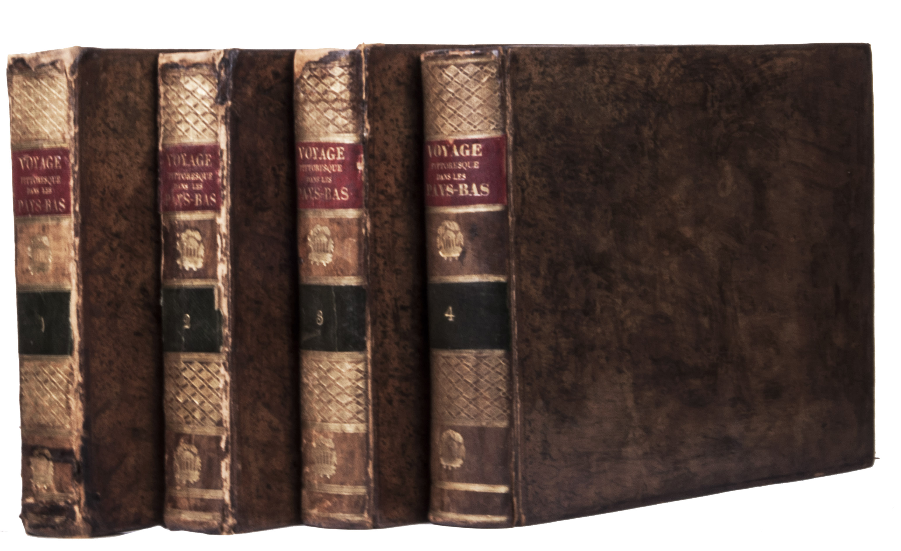 Rare complete and uniformly bound set of the first edition of both volumes on the Voyage as well as the later published volumes of the Chateaux et monuments, numbered as one series from 1-4, which are very rarely offered together. The present copy of Chateaux et monumens contains 26 extra plates. The series include a collection of 407 full-page lithographs with views of towns, monuments, landscapes, and castles in the Low Countries (present day Belgium, Luxembourg, and the Netherlands). The plates are lithographed by Jean-Baptiste Madou, after drawings of Otto van der Howen, Benjamin Mary, T. Hubert, A. de Marbaix, and others. The work was written by the Belgian author Jean-Joseph de Cloet (1794-1855), who also wrote a number of works comparing the Dutch and French language. The third volume contains twenty extra lithographic plates on the city gates and surroundings of Brussels, taken from Guillaume Burggraaff's Collection des anciennes portes de Bruxelles (1823). The fourth volume contains six extra plates comprising the serie Six paysages dessinés d'après nature et lithographiés par Deroy (1824) by C. Constans.