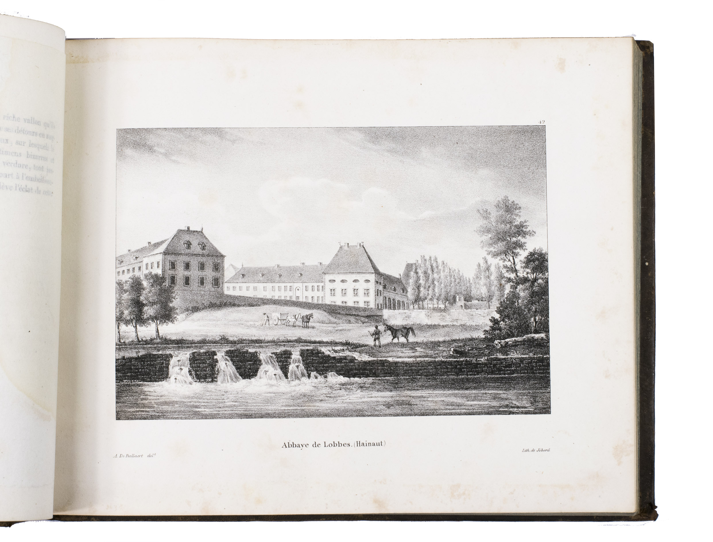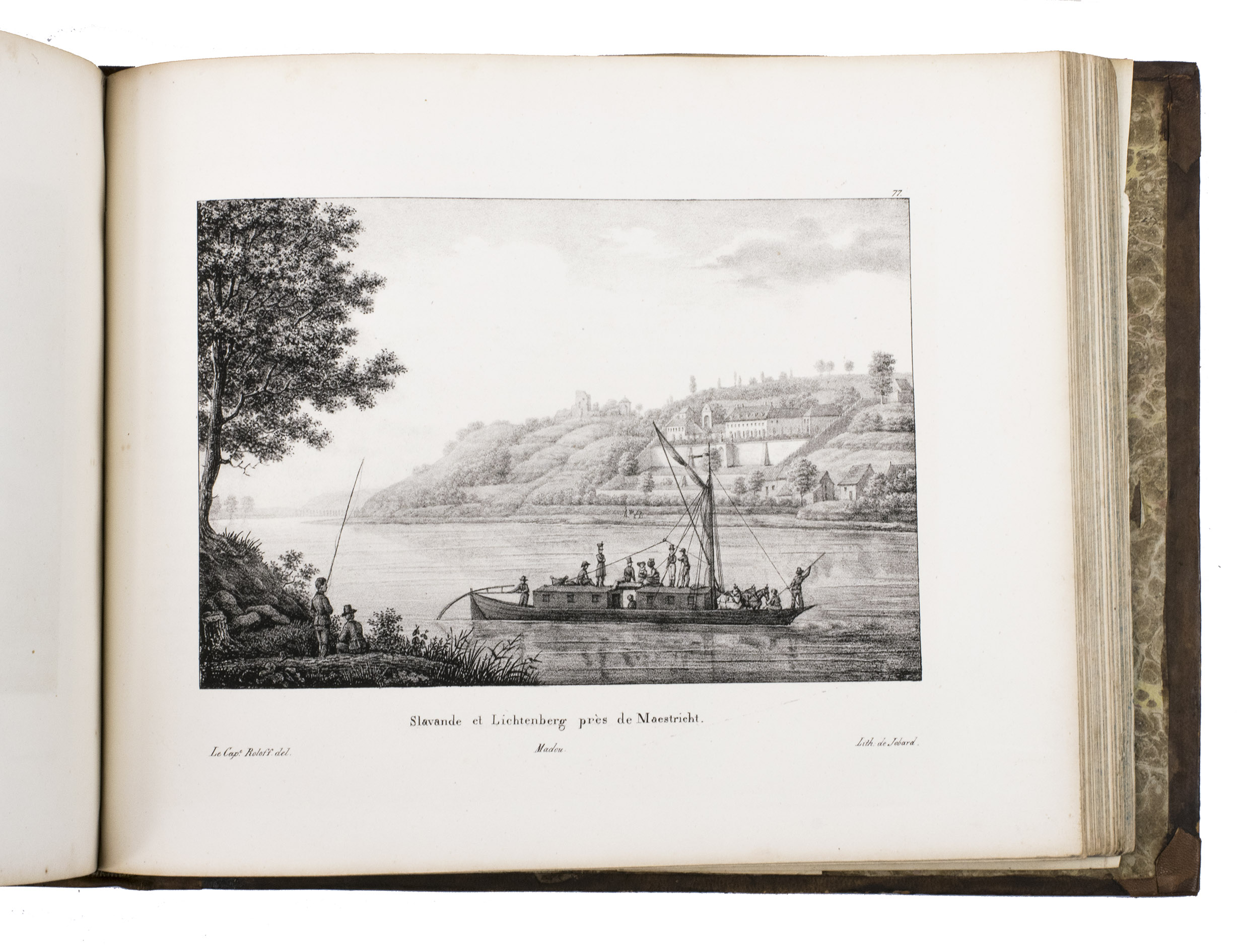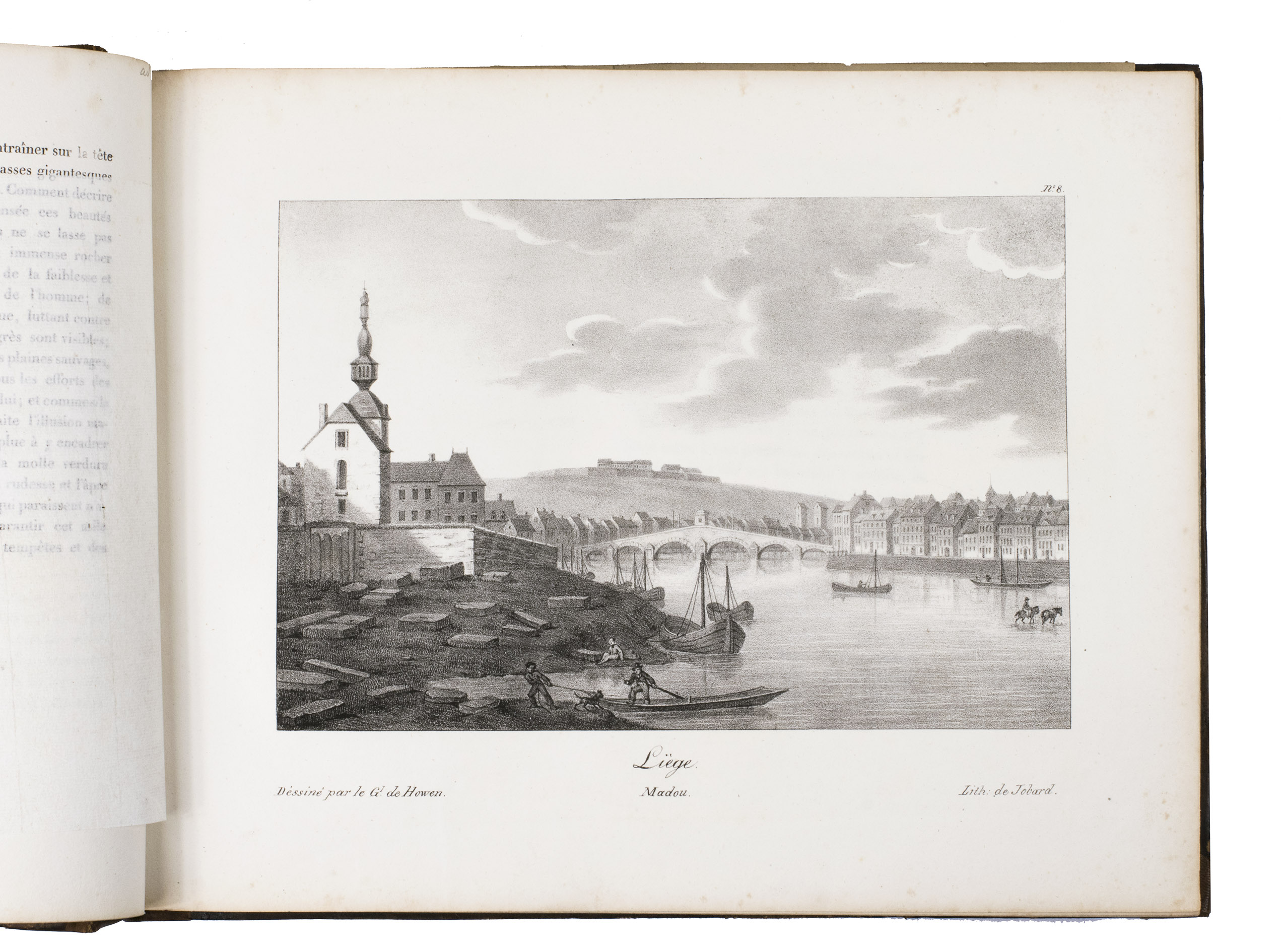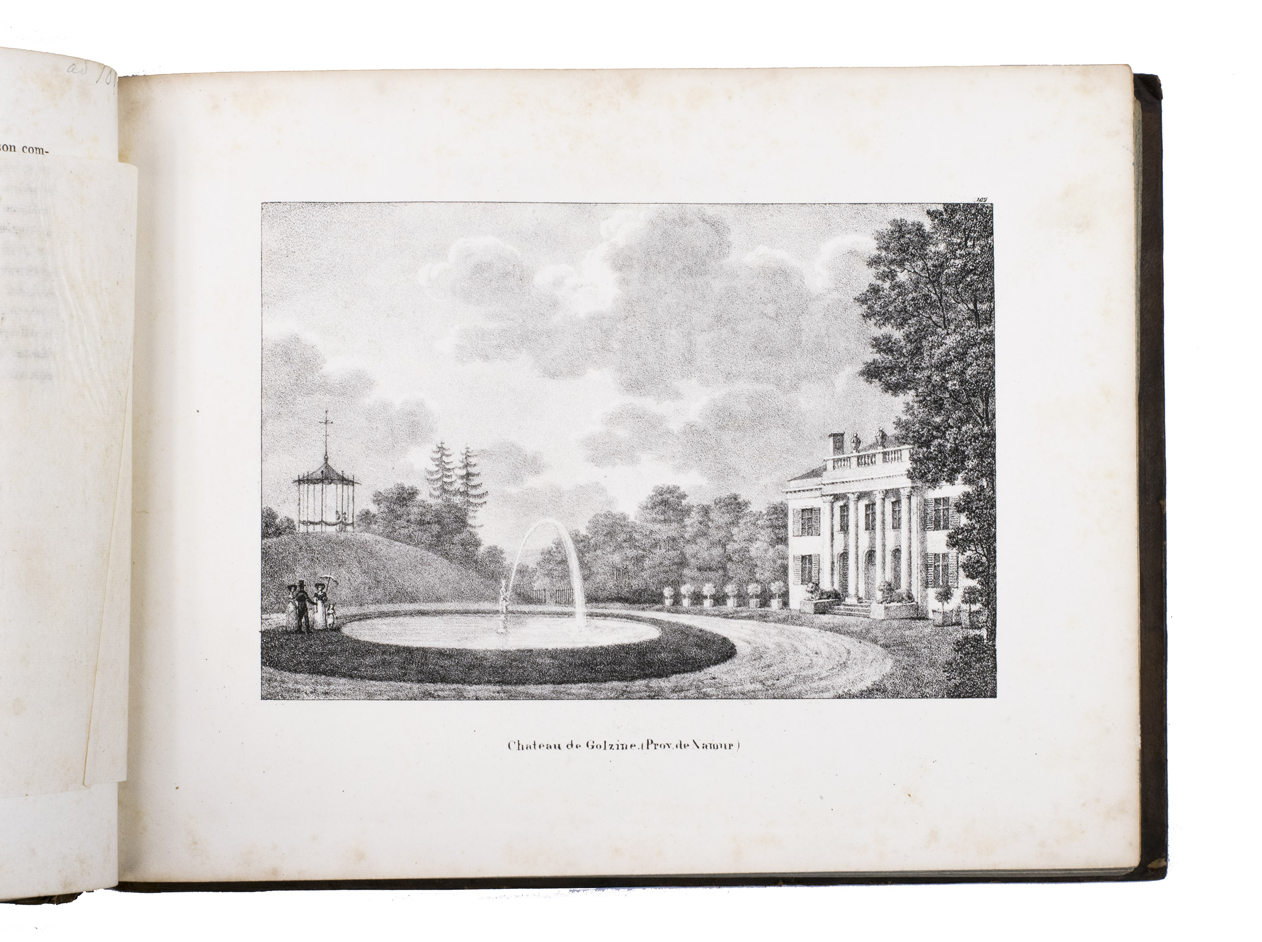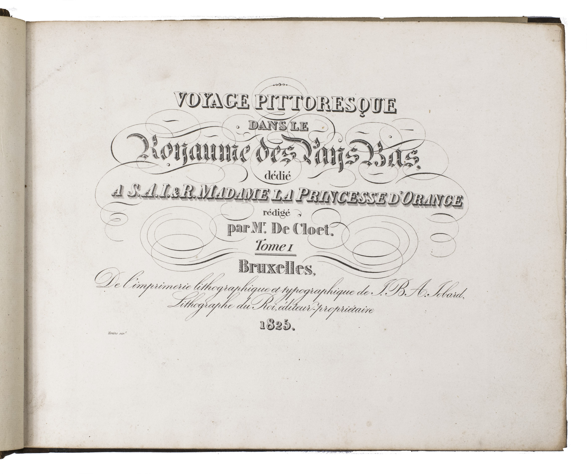 Rare complete and uniformly bound set of the first edition of both volumes on the Voyage as well as the later published volumes of the Chateaux et monuments, numbered as one series from 1-4, which are very rarely offered together. The present copy of Chateaux et monumens contains 26 extra plates. The series include a collection of 407 full-page lithographs with views of towns, monuments, landscapes, and castles in the Low Countries (present day Belgium, Luxembourg, and the Netherlands). The plates are lithographed by Jean-Baptiste Madou, after drawings of Otto van der Howen, Benjamin Mary, T. Hubert, A. de Marbaix, and others. The work was written by the Belgian author Jean-Joseph de Cloet (1794-1855), who also wrote a number of works comparing the Dutch and French language. The third volume contains twenty extra lithographic plates on the city gates and surroundings of Brussels, taken from Guillaume Burggraaff's Collection des anciennes portes de Bruxelles (1823). The fourth volume contains six extra plates comprising the serie Six paysages dessinés d'après nature et lithographiés par Deroy (1824) by C. Constans.