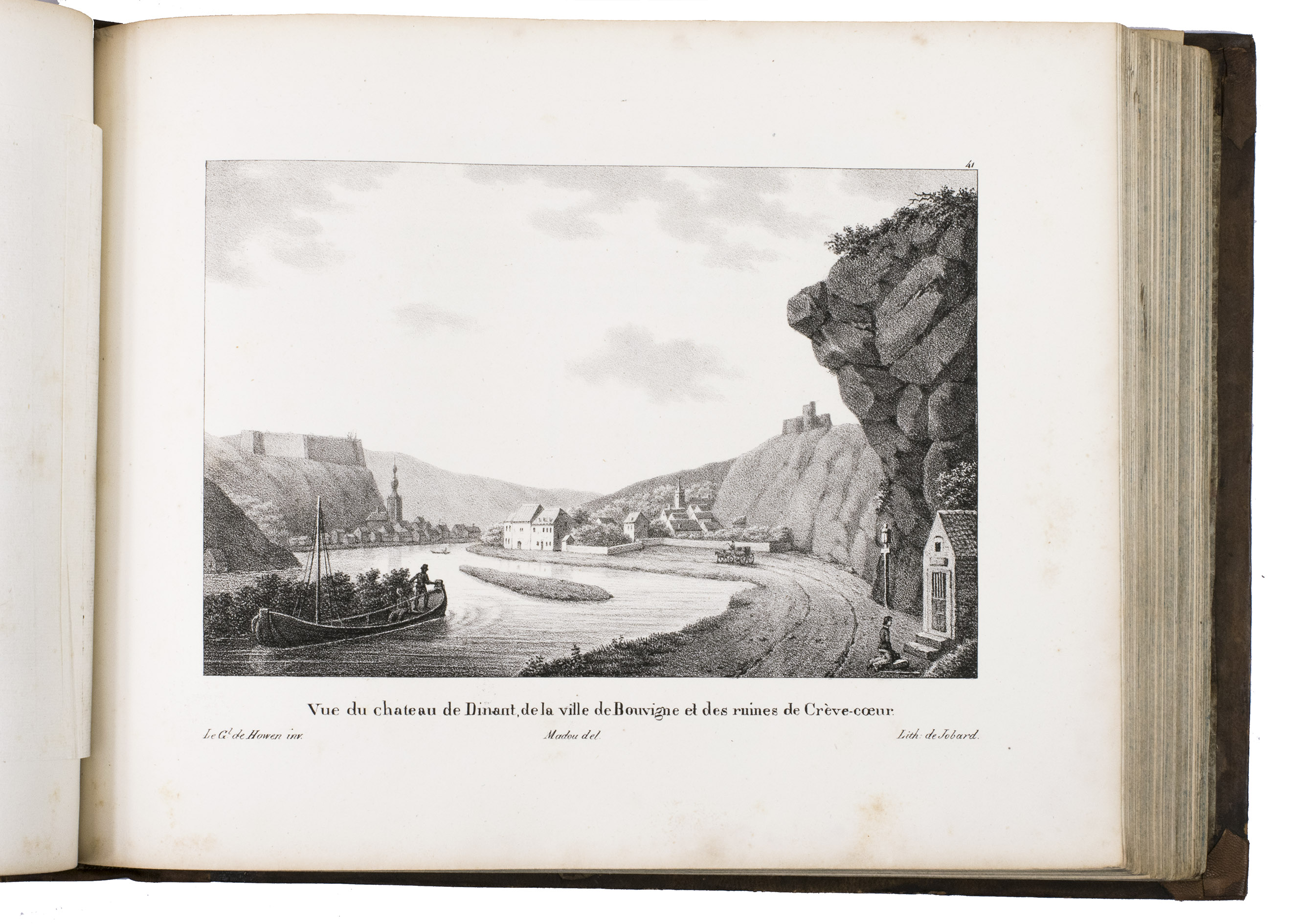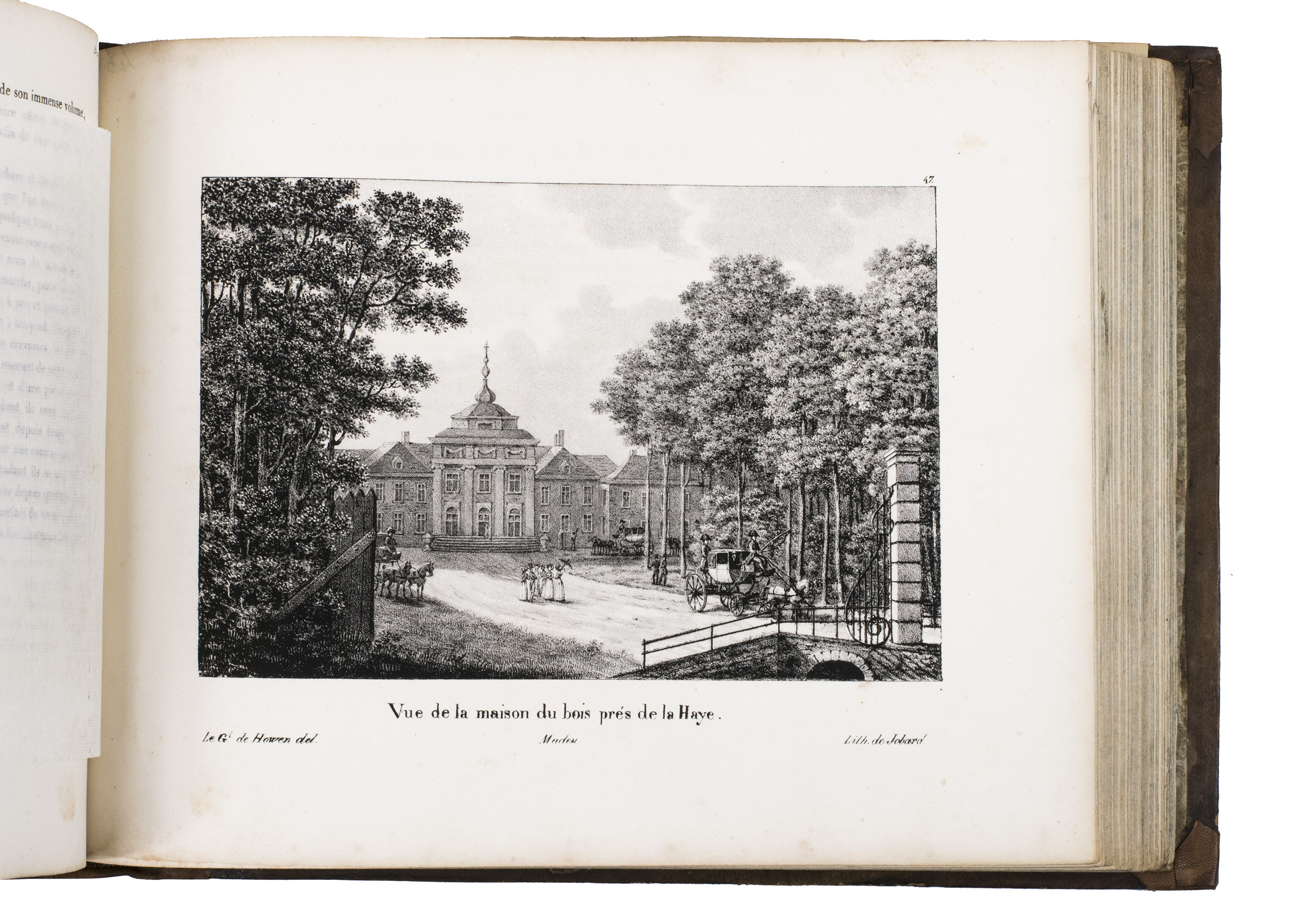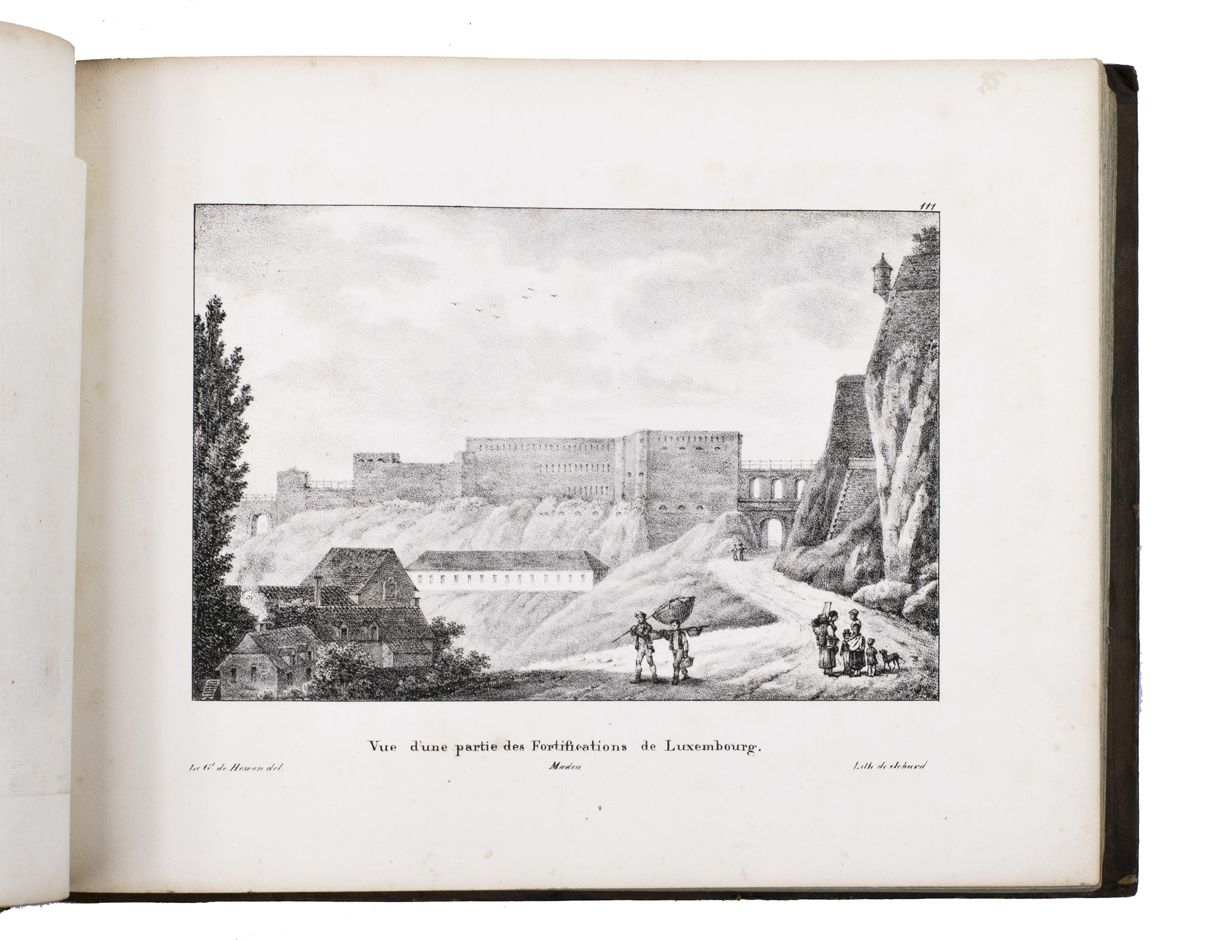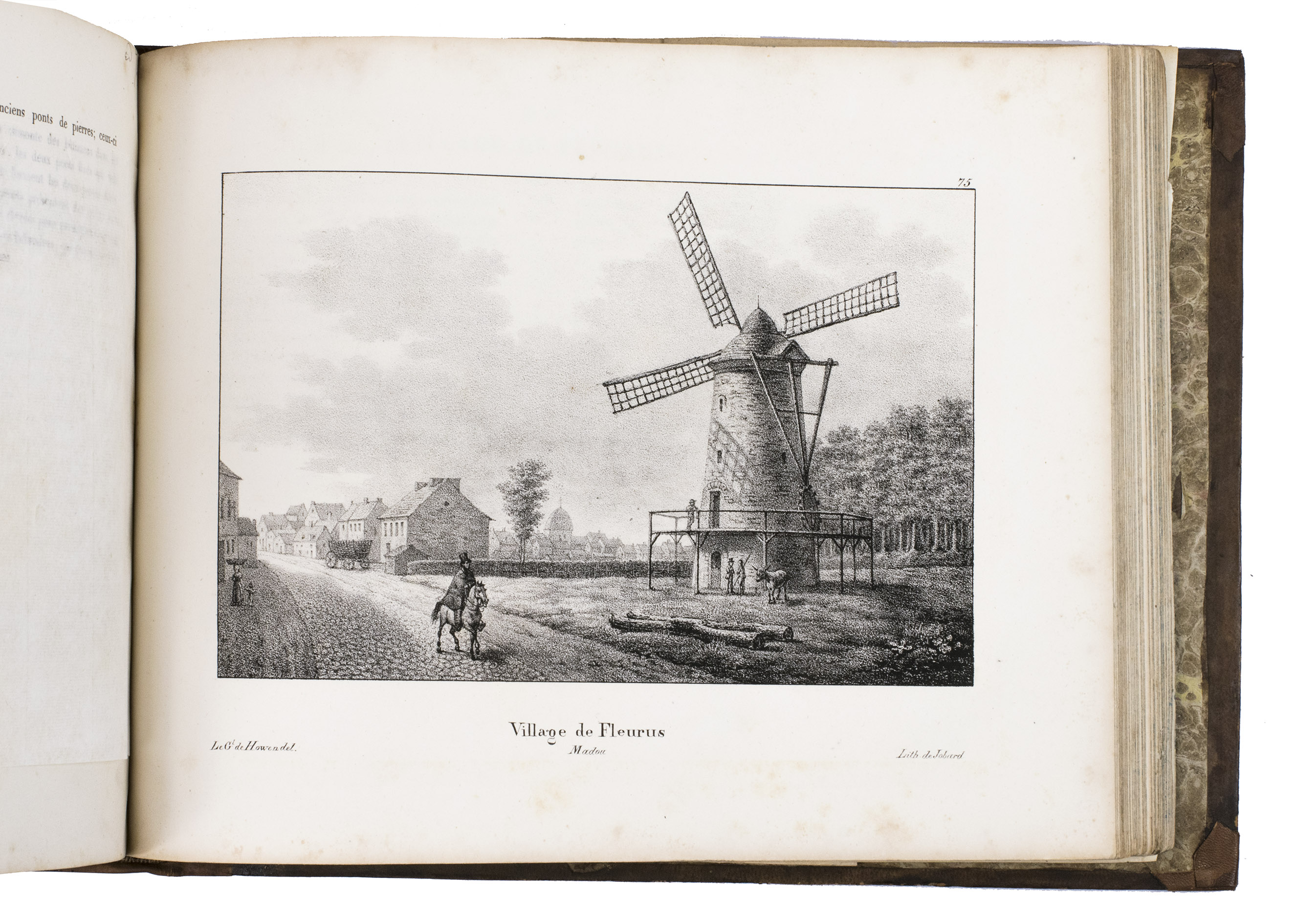 Rare complete and uniformly bound set of the first edition of both volumes on the Voyage as well as the later published volumes of the Chateaux et monuments, numbered as one series from 1-4, which are very rarely offered together. The present copy of Chateaux et monumens contains 26 extra plates. The series include a collection of 407 full-page lithographs with views of towns, monuments, landscapes, and castles in the Low Countries (present day Belgium, Luxembourg, and the Netherlands). The plates are lithographed by Jean-Baptiste Madou, after drawings of Otto van der Howen, Benjamin Mary, T. Hubert, A. de Marbaix, and others. The work was written by the Belgian author Jean-Joseph de Cloet (1794-1855), who also wrote a number of works comparing the Dutch and French language. The third volume contains twenty extra lithographic plates on the city gates and surroundings of Brussels, taken from Guillaume Burggraaff's Collection des anciennes portes de Bruxelles (1823). The fourth volume contains six extra plates comprising the serie Six paysages dessinés d'après nature et lithographiés par Deroy (1824) by C. Constans.