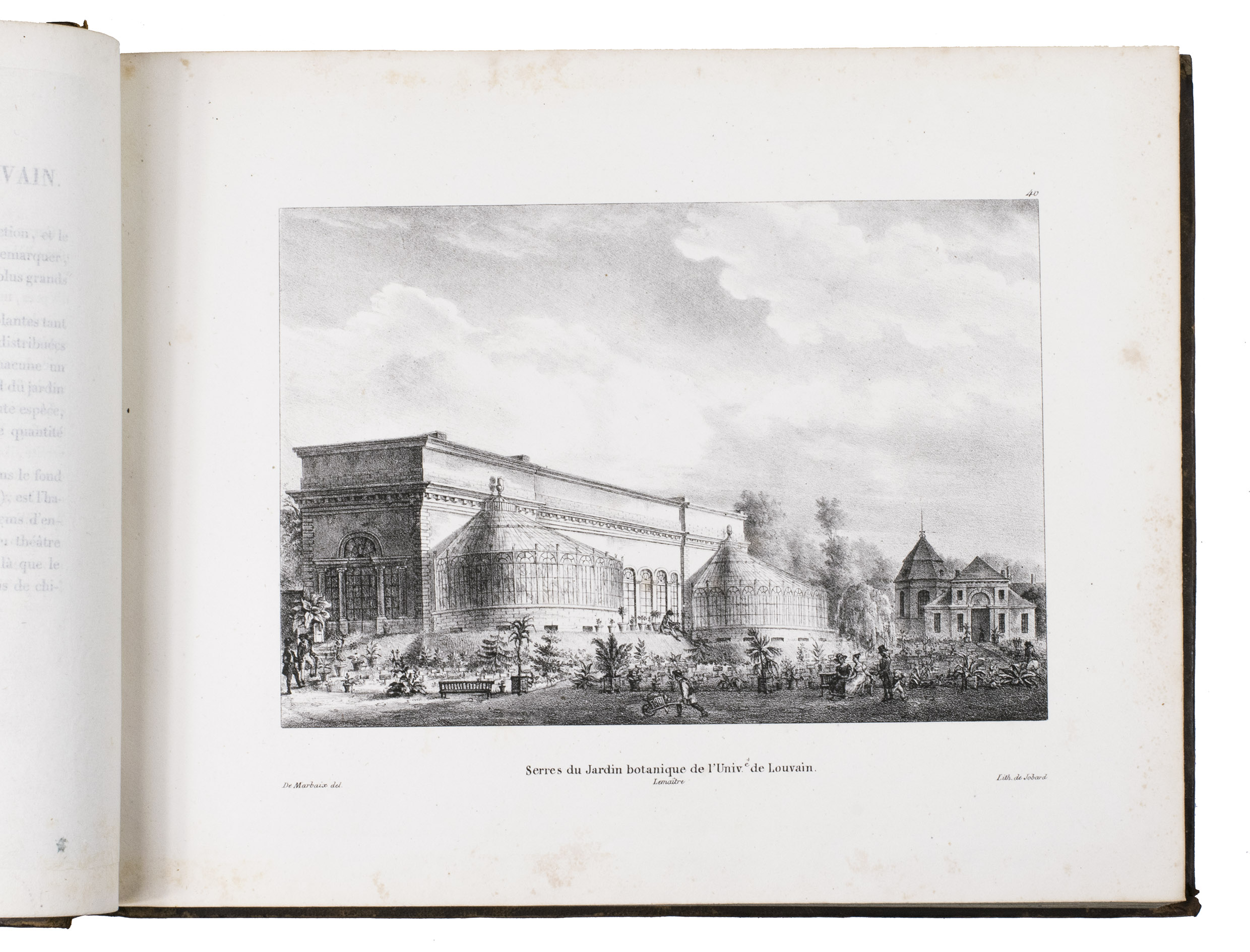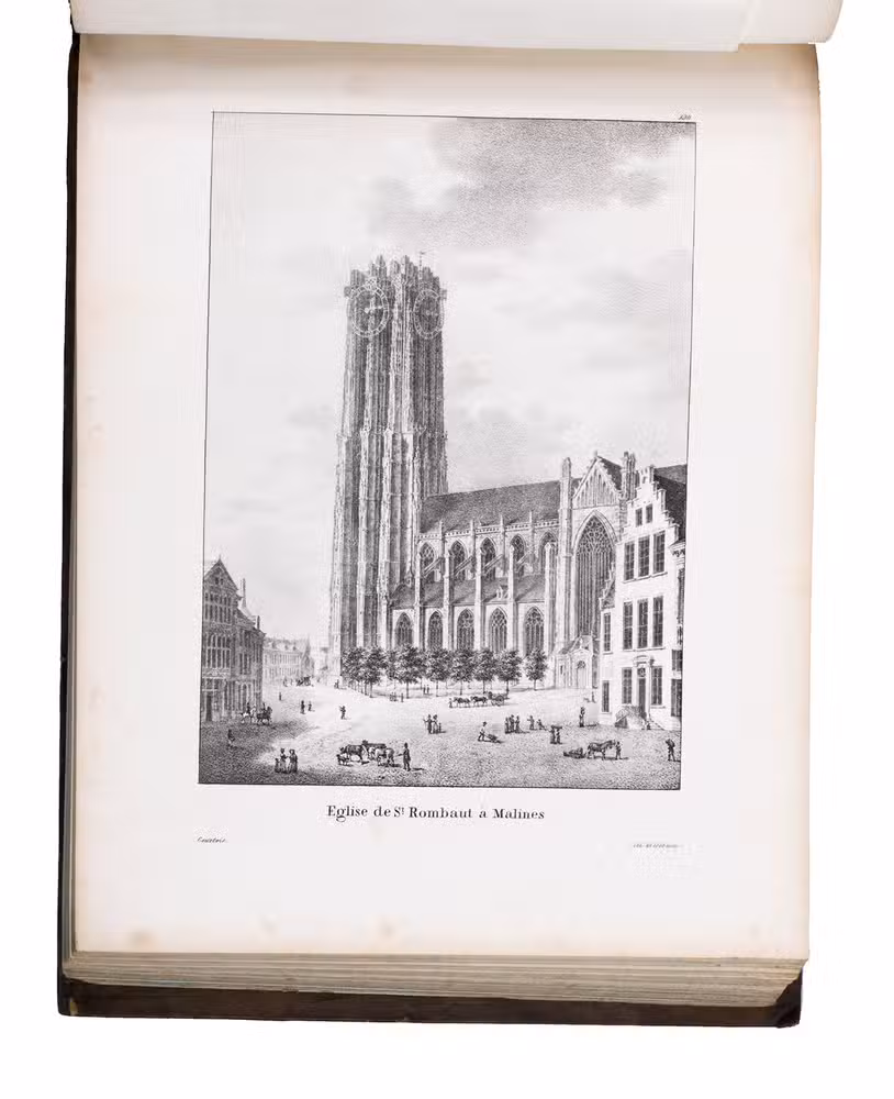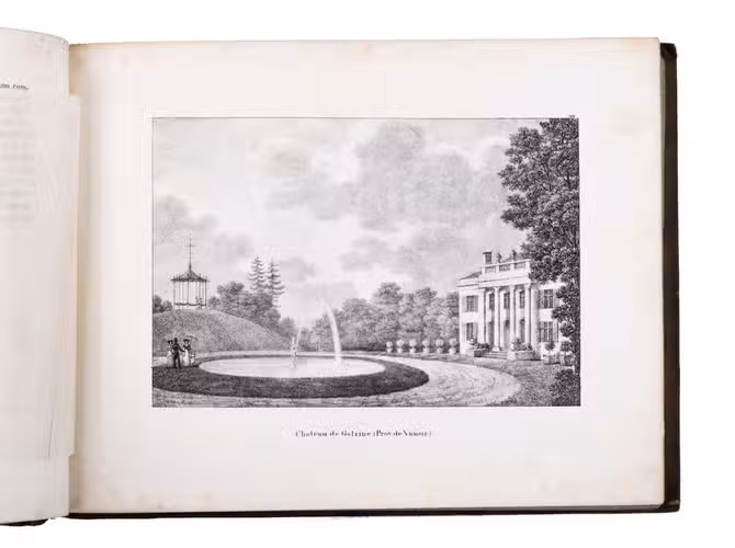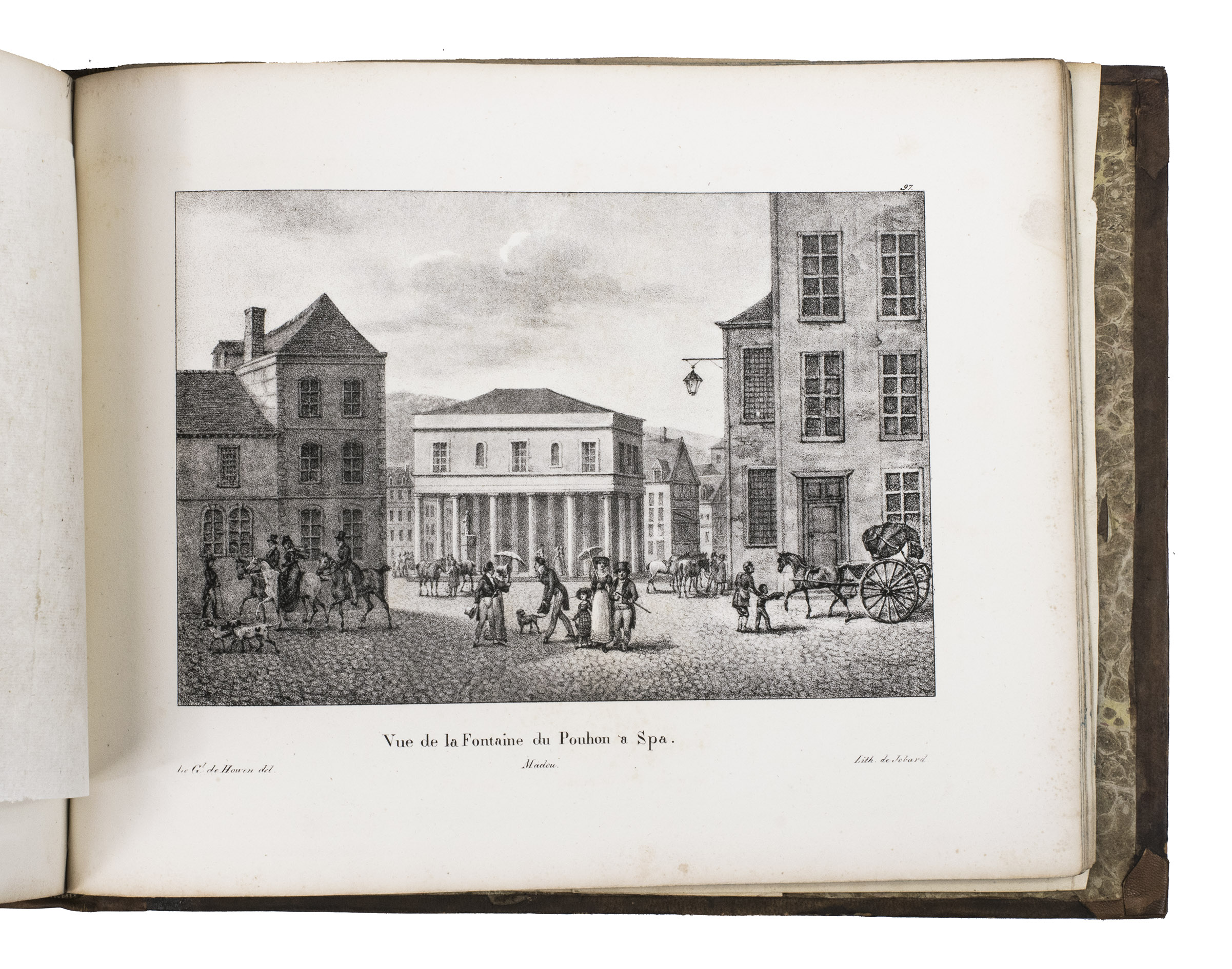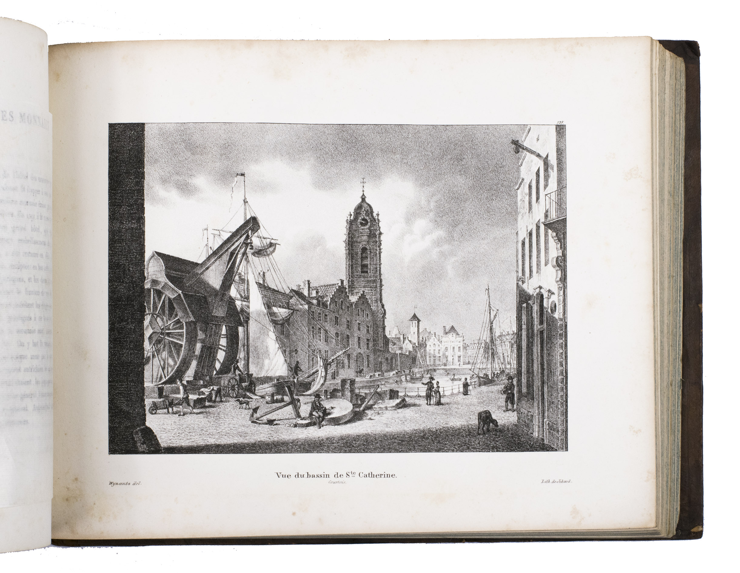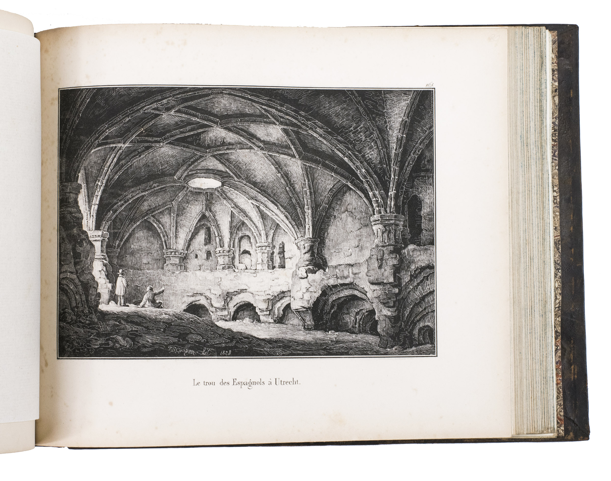 Rare complete and uniformly bound set of the first edition of both volumes on the Voyage as well as the later published volumes of the Chateaux et monuments, numbered as one series from 1-4, which are very rarely offered together. The present copy of Chateaux et monumens contains 26 extra plates. The series include a collection of 407 full-page lithographs with views of towns, monuments, landscapes, and castles in the Low Countries (present day Belgium, Luxembourg, and the Netherlands). The plates are lithographed by Jean-Baptiste Madou, after drawings of Otto van der Howen, Benjamin Mary, T. Hubert, A. de Marbaix, and others. The work was written by the Belgian author Jean-Joseph de Cloet (1794-1855), who also wrote a number of works comparing the Dutch and French language. The third volume contains twenty extra lithographic plates on the city gates and surroundings of Brussels, taken from Guillaume Burggraaff's Collection des anciennes portes de Bruxelles (1823). The fourth volume contains six extra plates comprising the serie Six paysages dessinés d'après nature et lithographiés par Deroy (1824) by C. Constans.