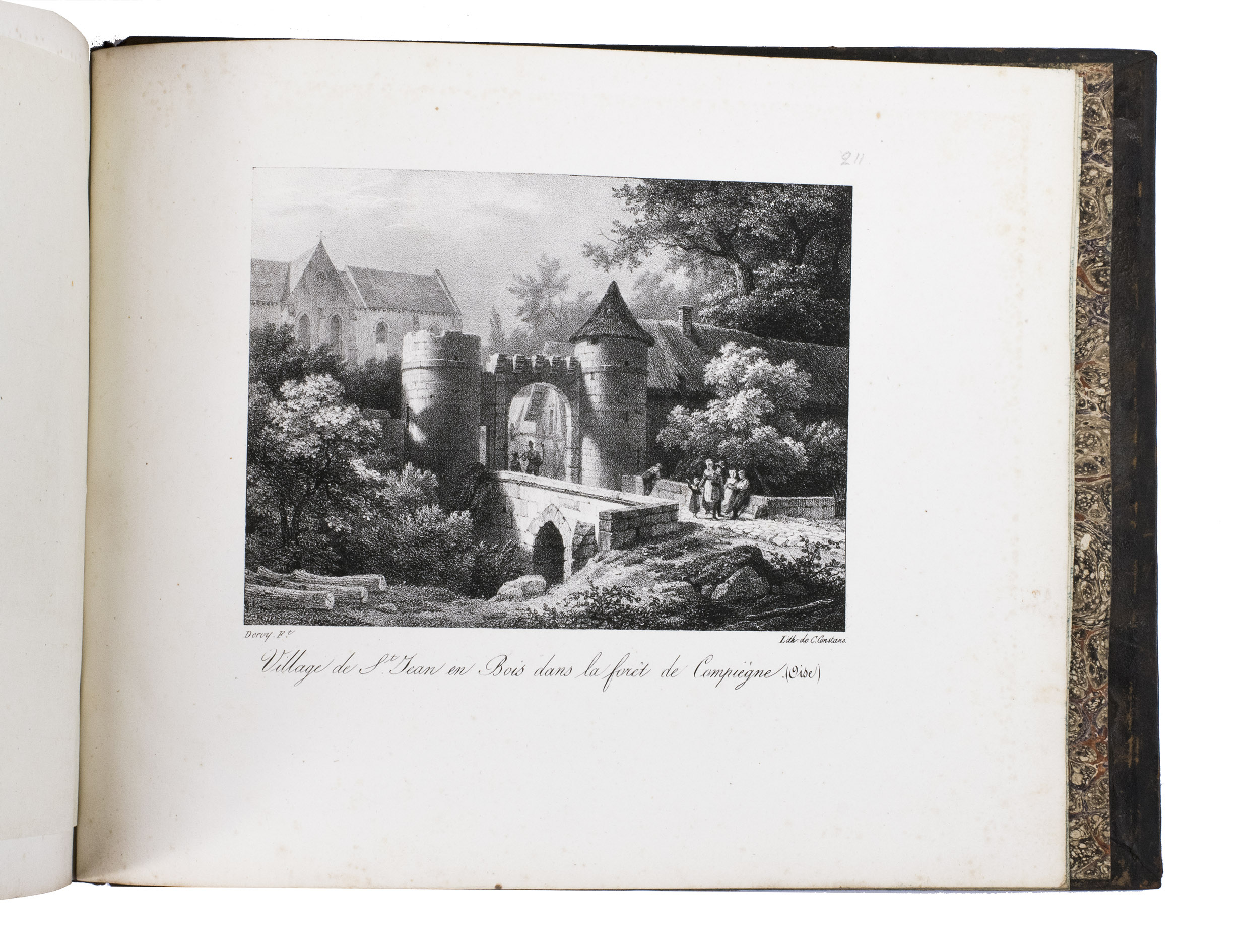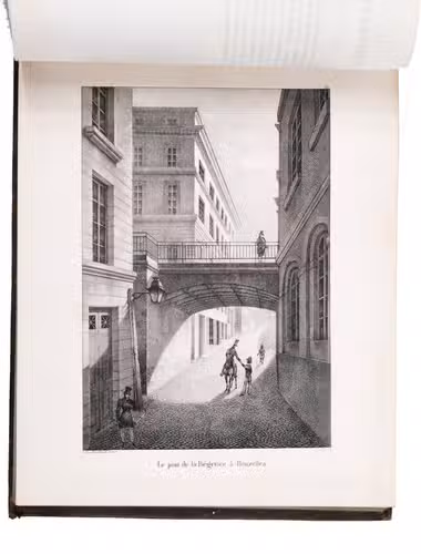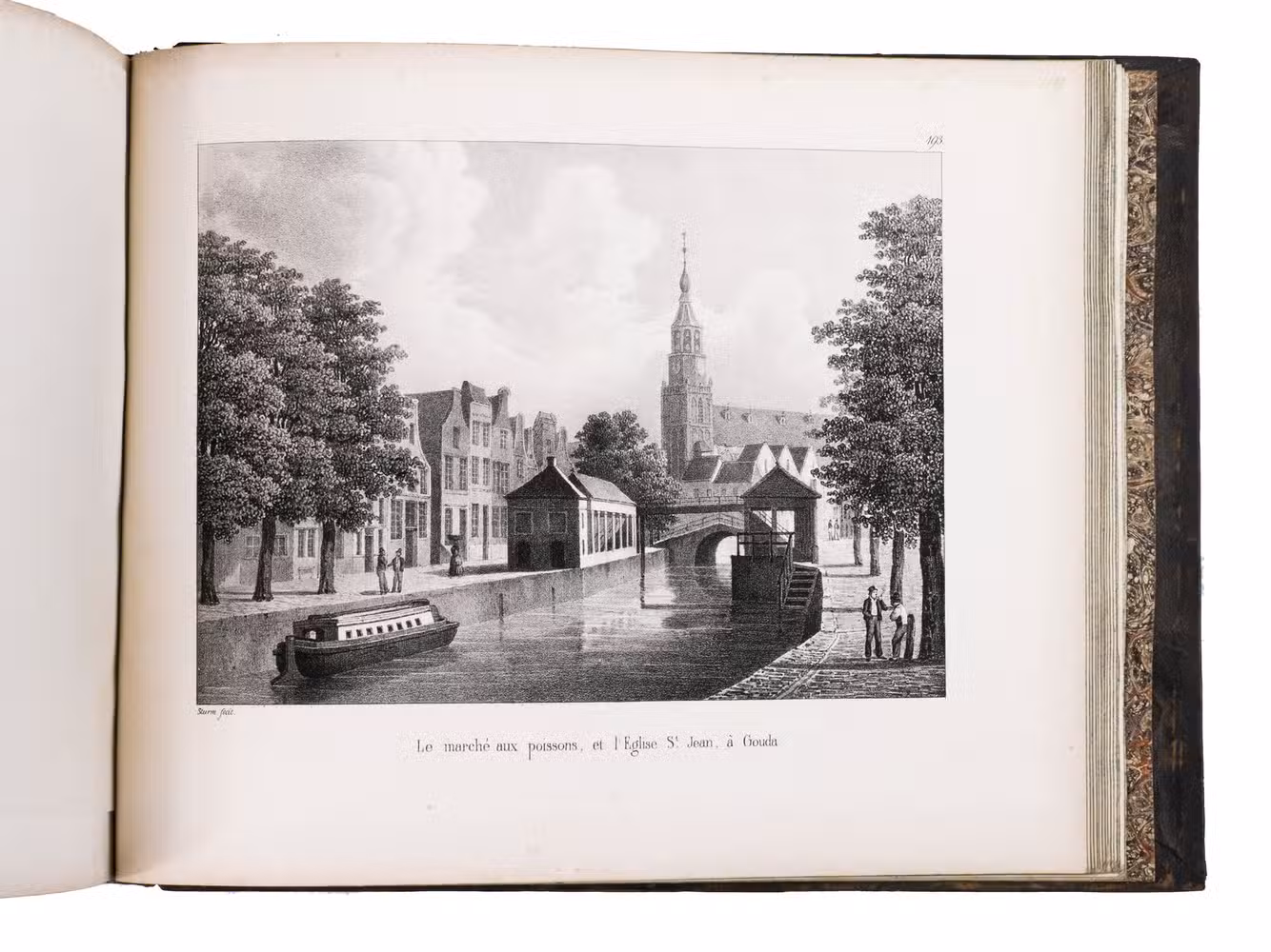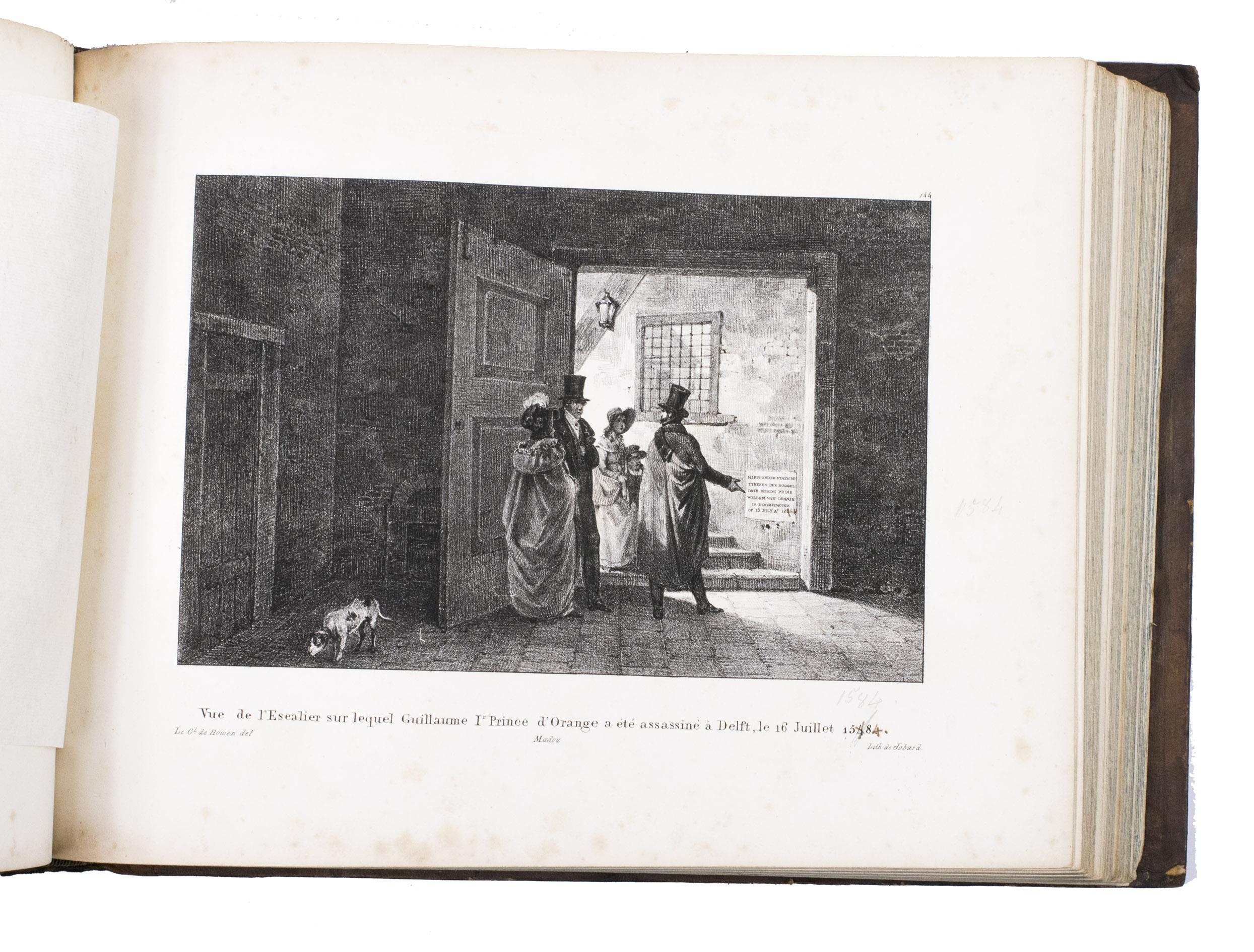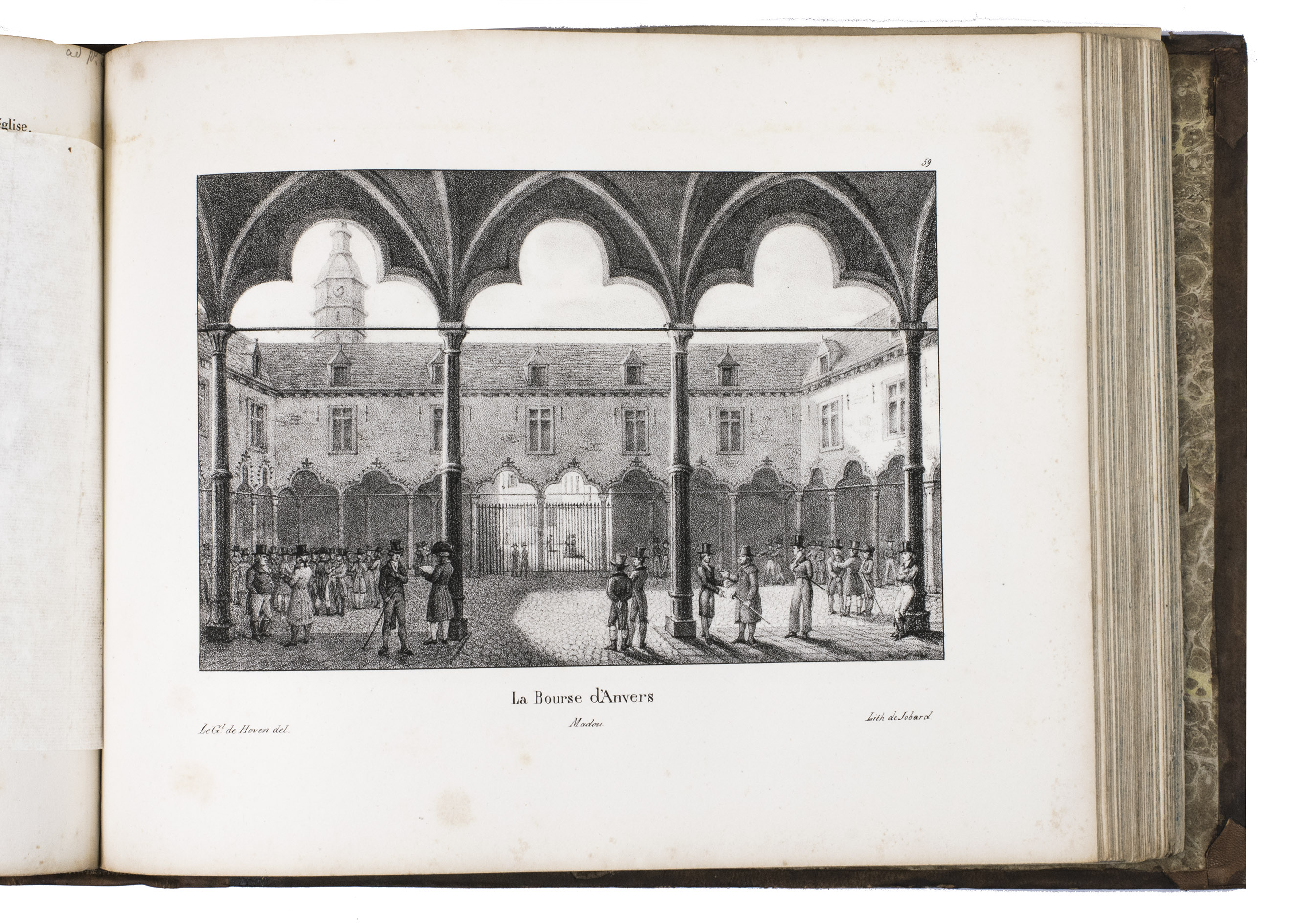 Rare complete and uniformly bound set of the first edition of both volumes on the Voyage as well as the later published volumes of the Chateaux et monuments, numbered as one series from 1-4, which are very rarely offered together. The present copy of Chateaux et monumens contains 26 extra plates. The series include a collection of 407 full-page lithographs with views of towns, monuments, landscapes, and castles in the Low Countries (present day Belgium, Luxembourg, and the Netherlands). The plates are lithographed by Jean-Baptiste Madou, after drawings of Otto van der Howen, Benjamin Mary, T. Hubert, A. de Marbaix, and others. The work was written by the Belgian author Jean-Joseph de Cloet (1794-1855), who also wrote a number of works comparing the Dutch and French language. The third volume contains twenty extra lithographic plates on the city gates and surroundings of Brussels, taken from Guillaume Burggraaff's Collection des anciennes portes de Bruxelles (1823). The fourth volume contains six extra plates comprising the serie Six paysages dessinés d'après nature et lithographiés par Deroy (1824) by C. Constans.