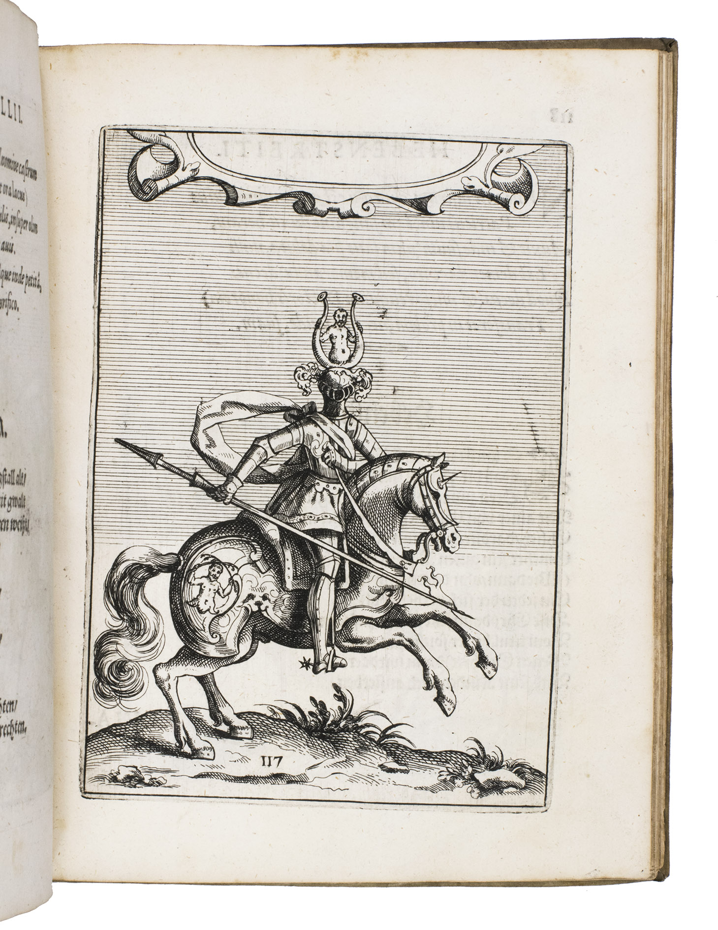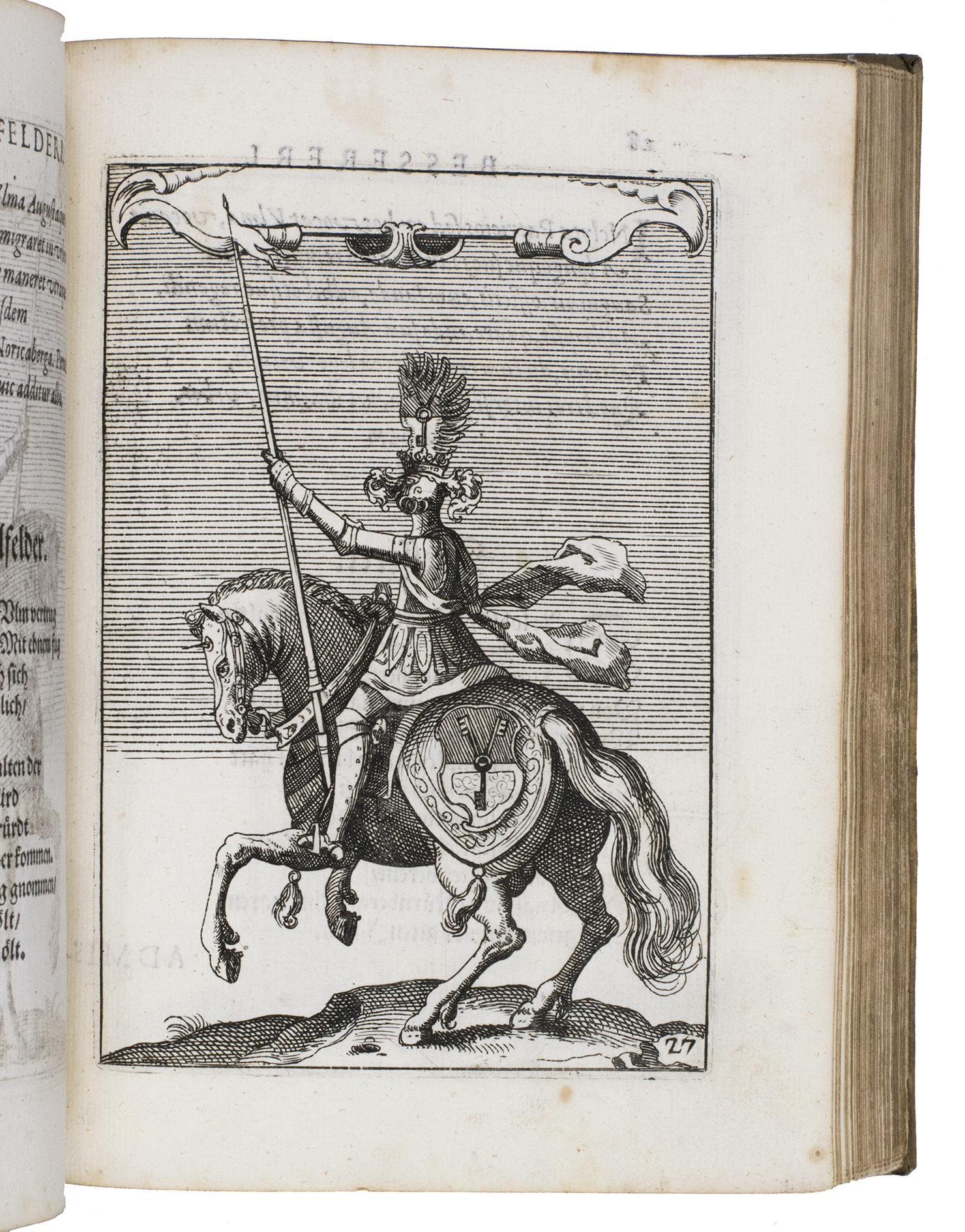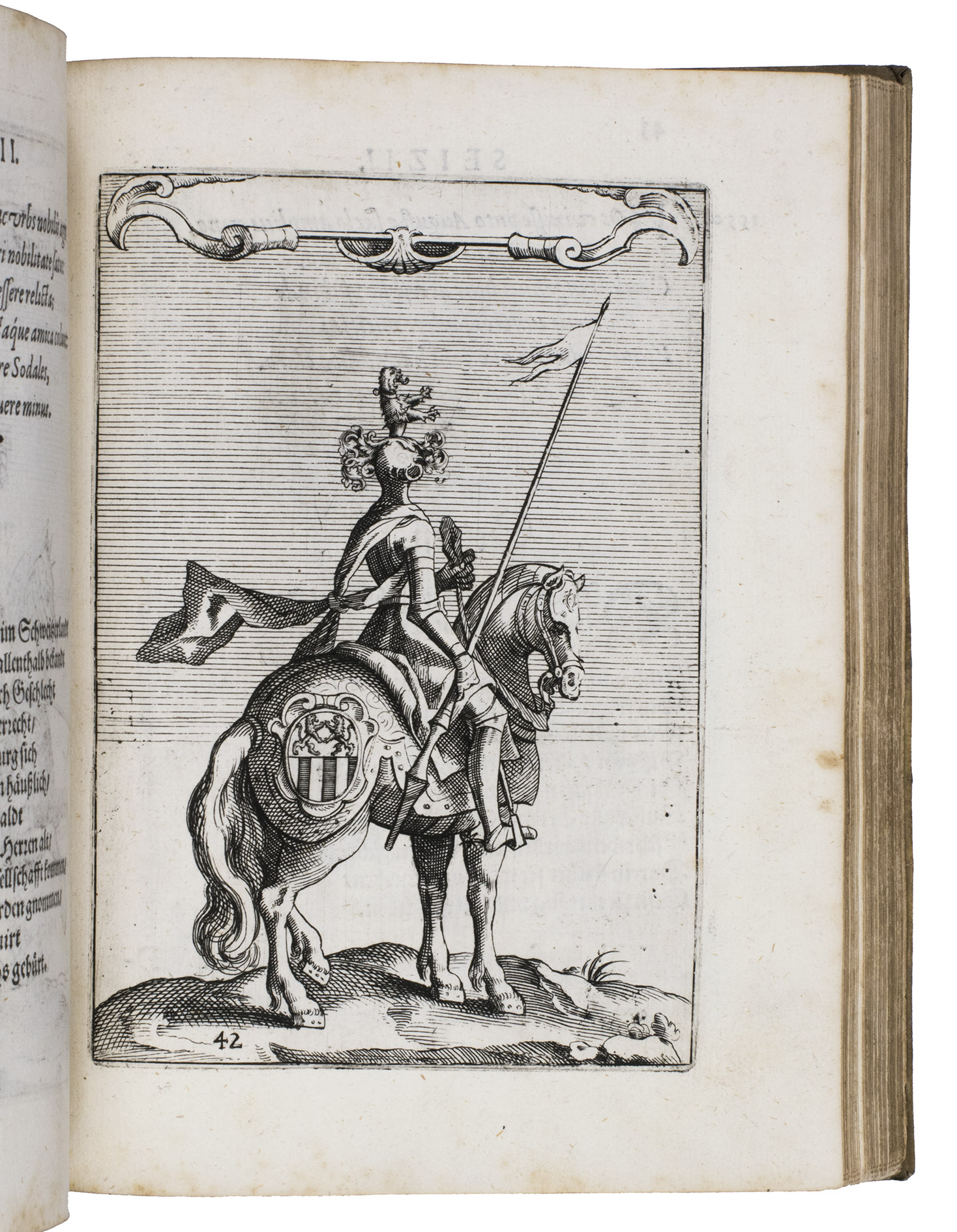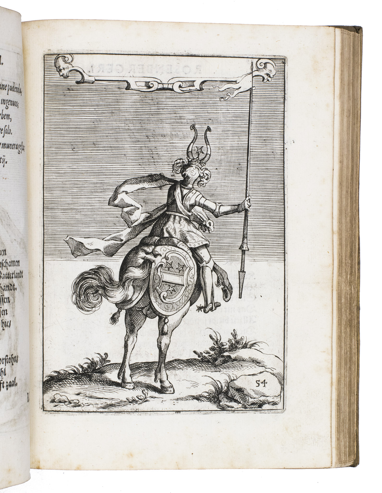 Augsburg, Christoph Mang, 1613. 4to. With an engraved title, and 122 numbered engraved full-page illustrations of knights. Contemporary gold-tooled vellum, with a floral ornament within an oval frame in the centre of both boards, set within a double fillet frame with floral corner pieces, remnants of closing ties, gilt edges. [24], "123" [= 124] ll., 124-136, [1 blank] pp.