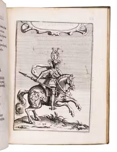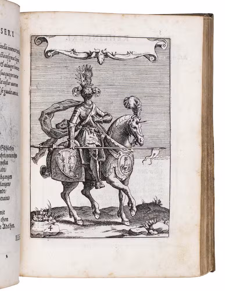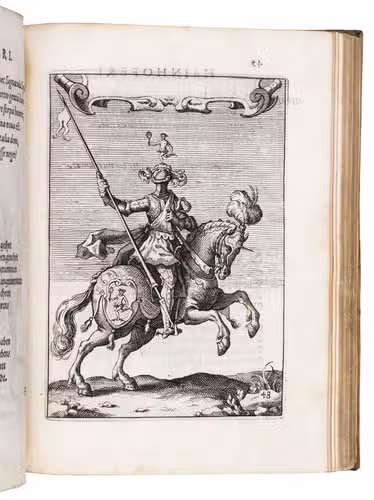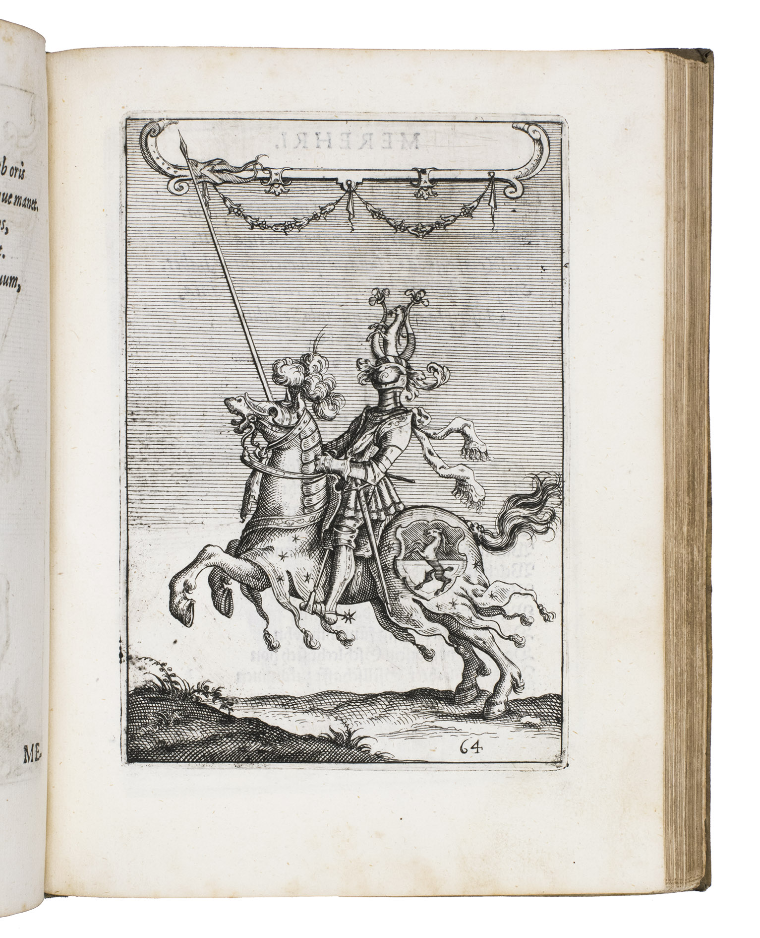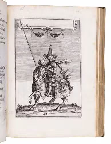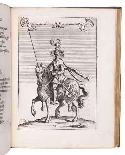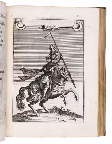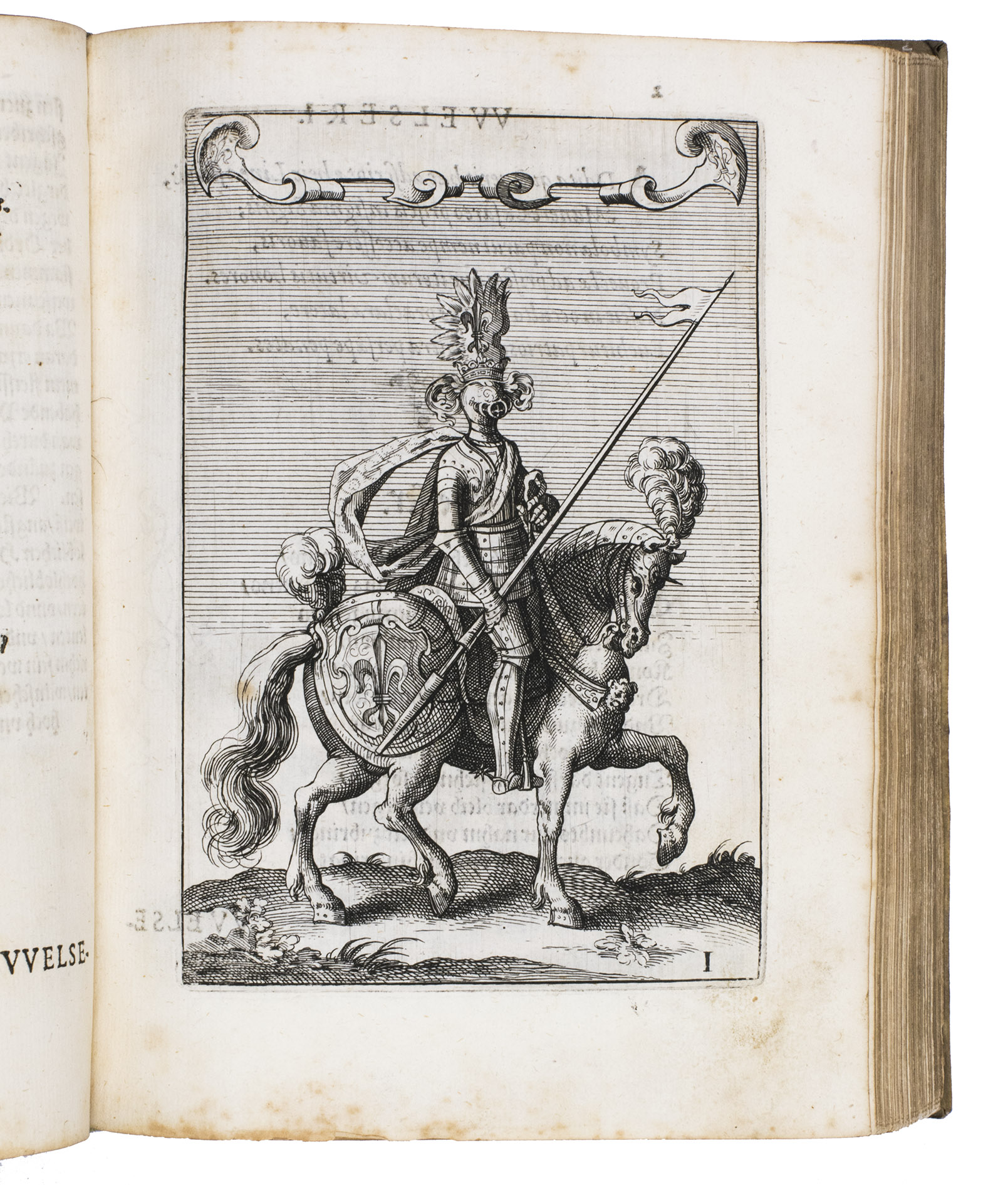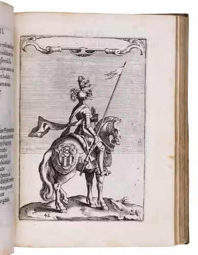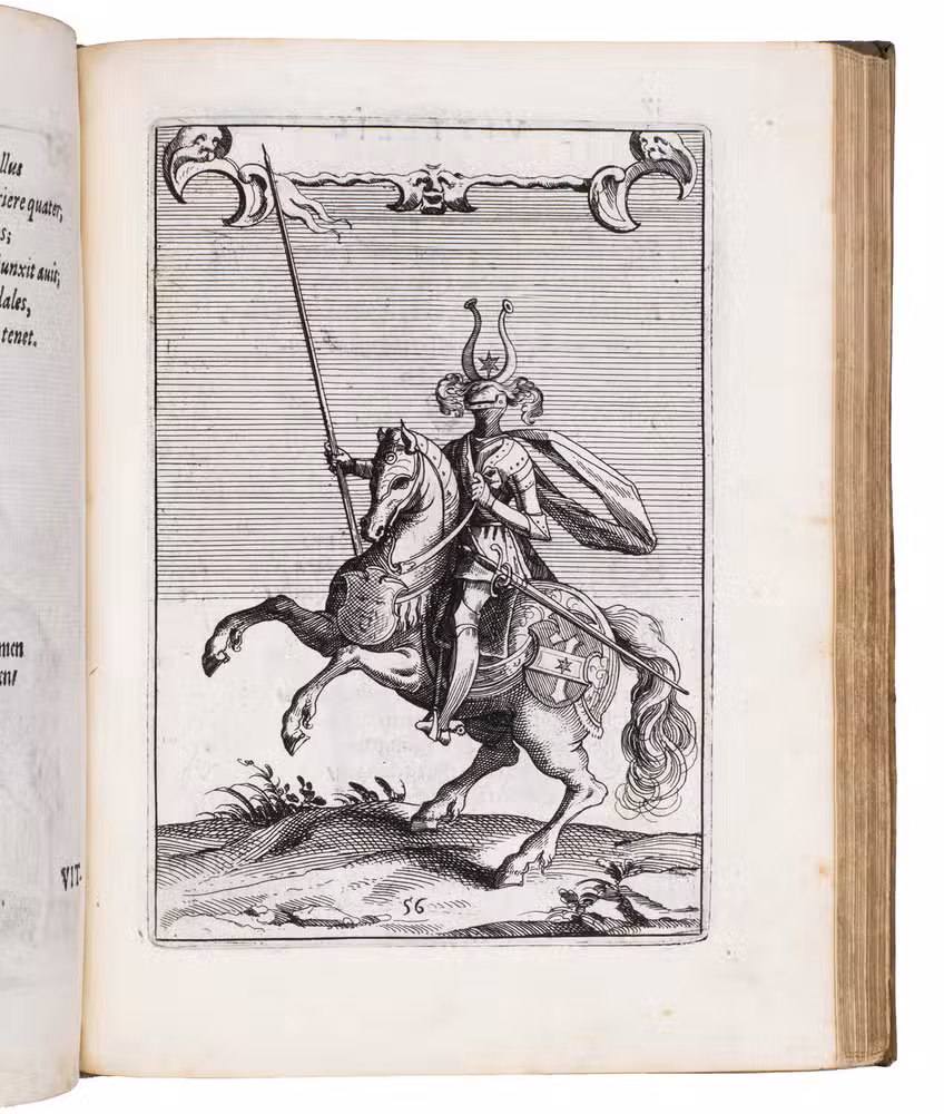 Augsburg, Christoph Mang, 1613. 4to. With an engraved title, and 122 numbered engraved full-page illustrations of knights. Contemporary gold-tooled vellum, with a floral ornament within an oval frame in the centre of both boards, set within a double fillet frame with floral corner pieces, remnants of closing ties, gilt edges. [24], "123" [= 124] ll., 124-136, [1 blank] pp.