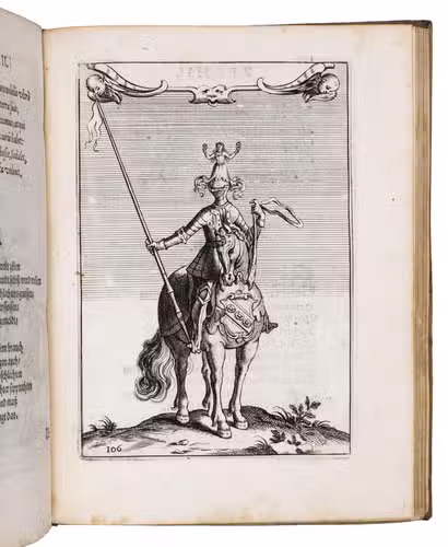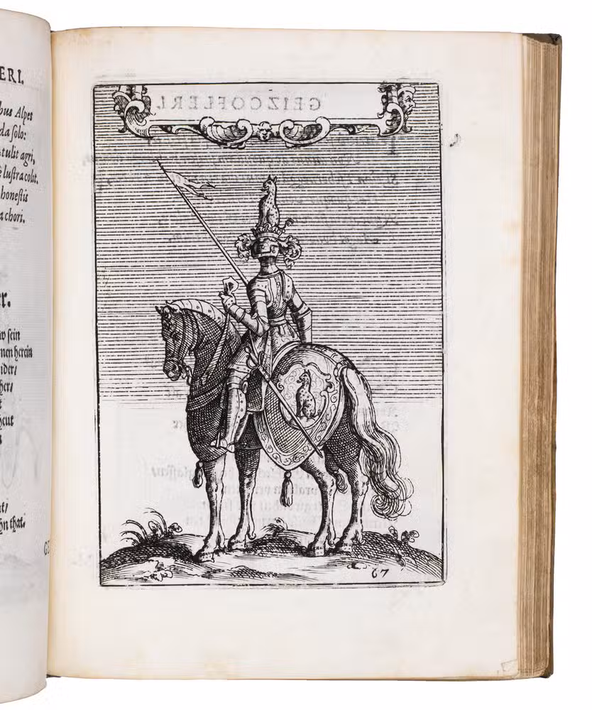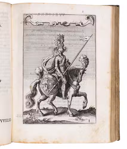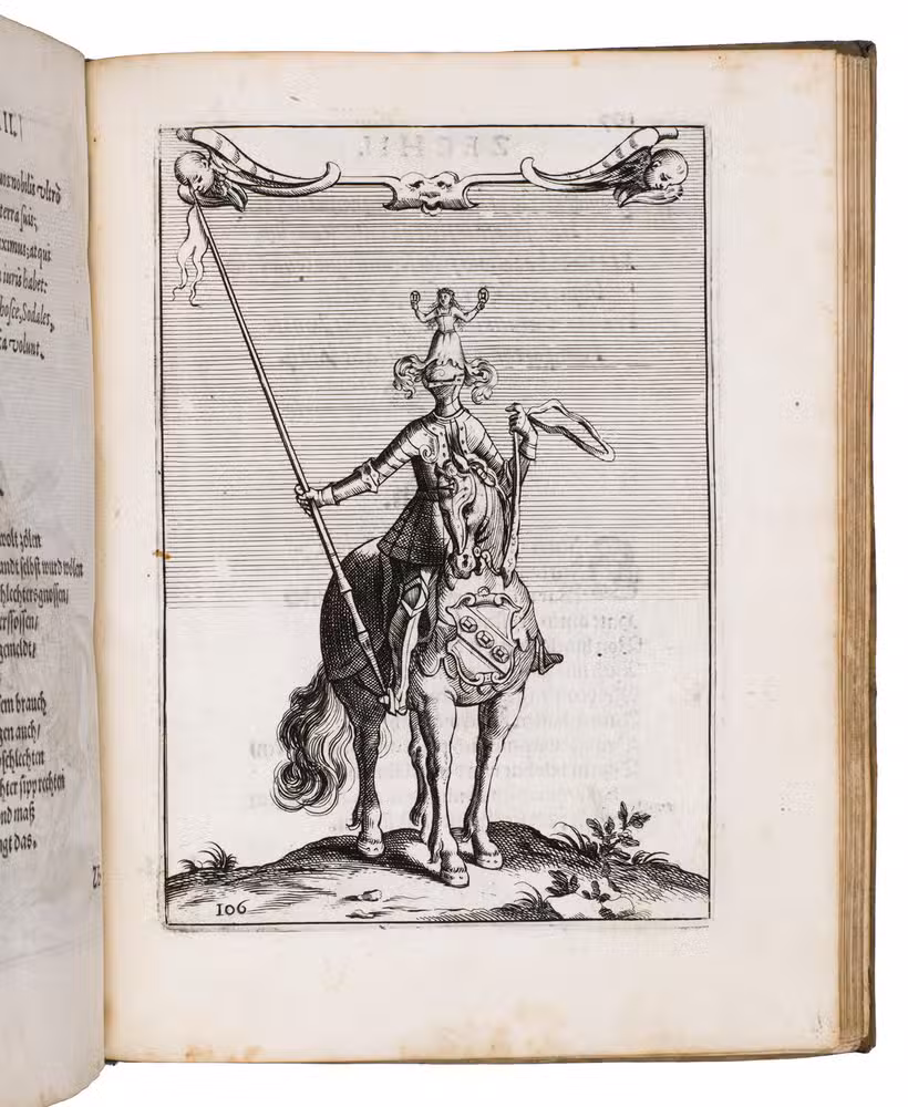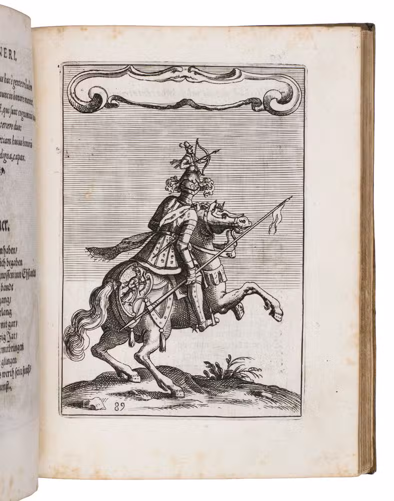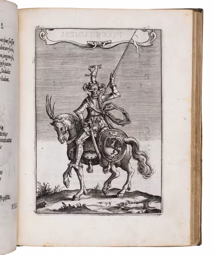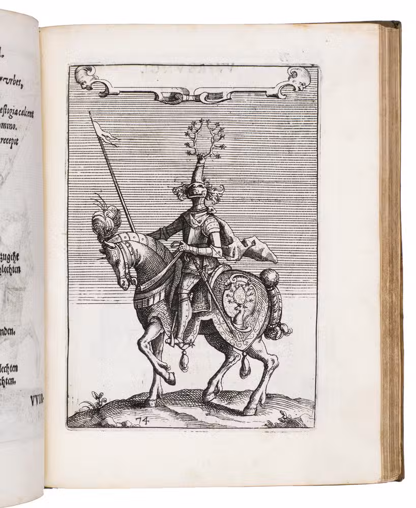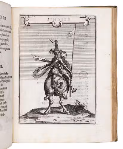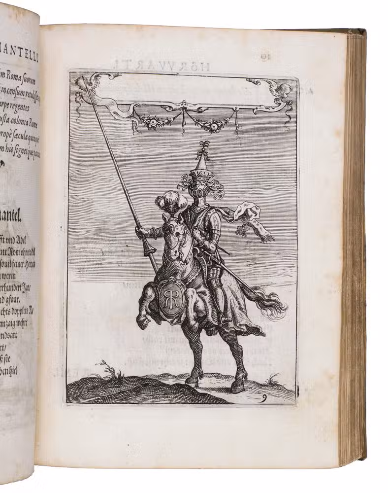 Augsburg, Christoph Mang, 1613. 4to. With an engraved title, and 122 numbered engraved full-page illustrations of knights. Contemporary gold-tooled vellum, with a floral ornament within an oval frame in the centre of both boards, set within a double fillet frame with floral corner pieces, remnants of closing ties, gilt edges. [24], "123" [= 124] ll., 124-136, [1 blank] pp.