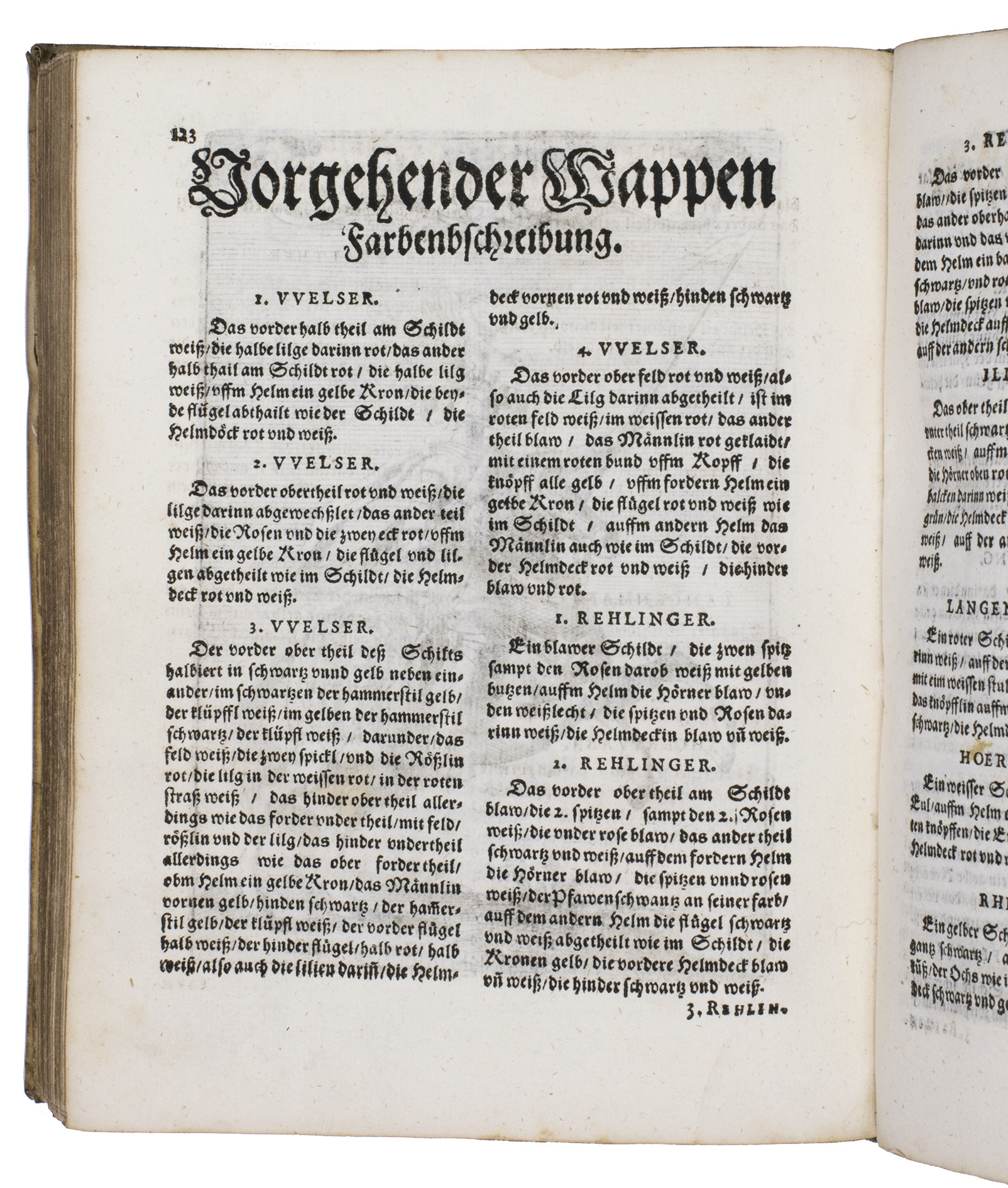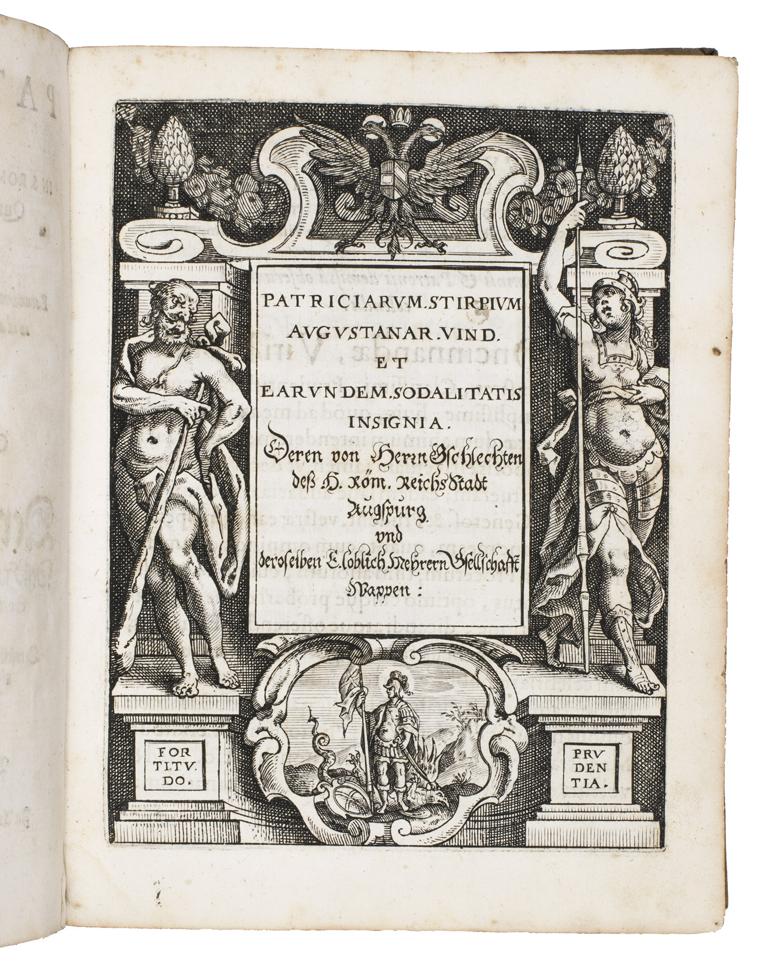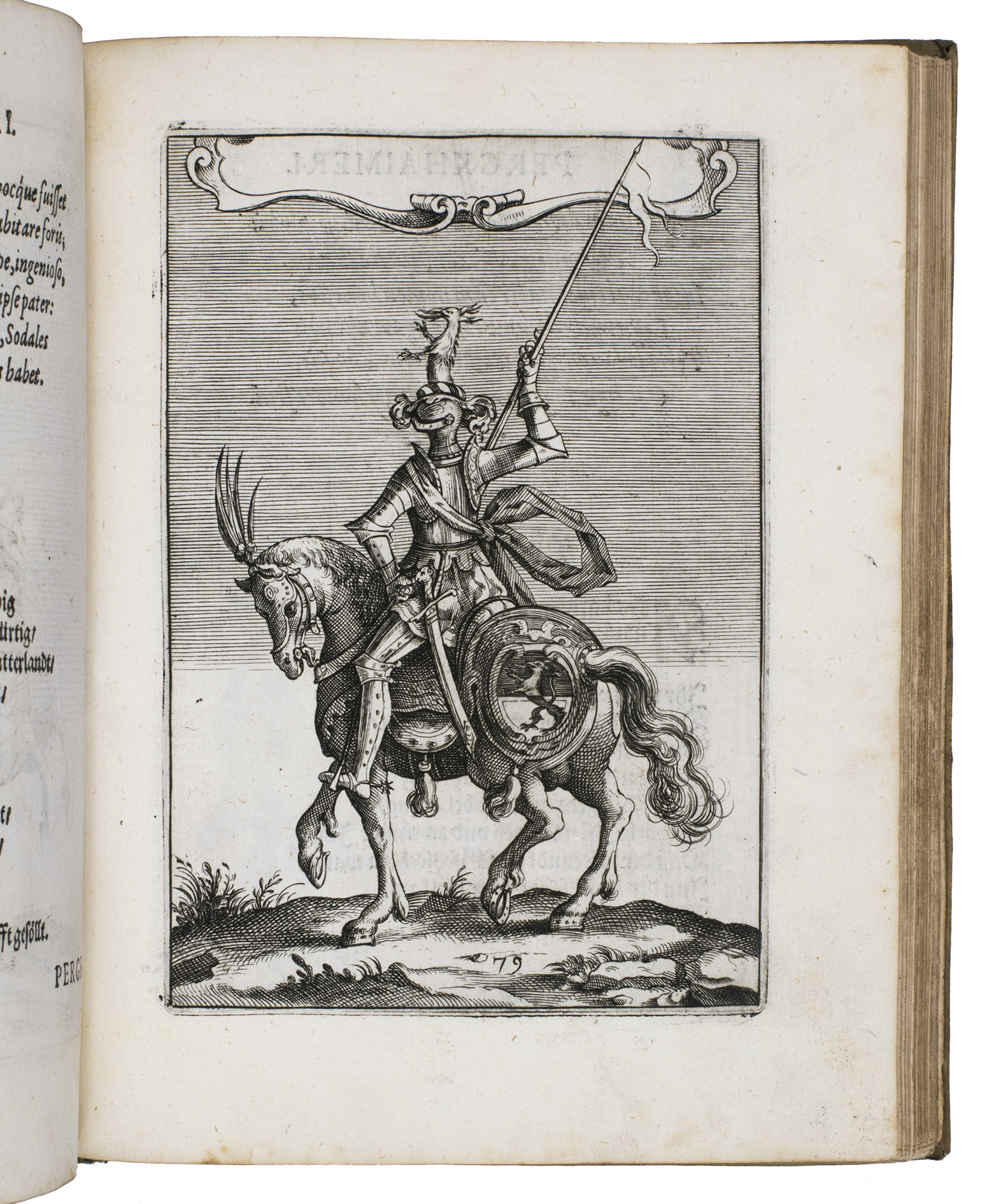 Rare first and only edition of a heraldic work on the patrician families of Augsburg, with over a hundred beautiful full-page engravings. The work, printed in both Latin and German, includes descriptions in verse of various of these families, such as Welser, Peutinger, Fleckheimer, Hebenstreit, and Zeller, and traces their lineage back 400 years or more. The most prominent family members are depicted as knights on horseback, in full armour, together with their coat of arms, which are described in more detail on the final pages. The work is quite scarce, with only 9 copies recorded in institutions, and 3 in sales records.