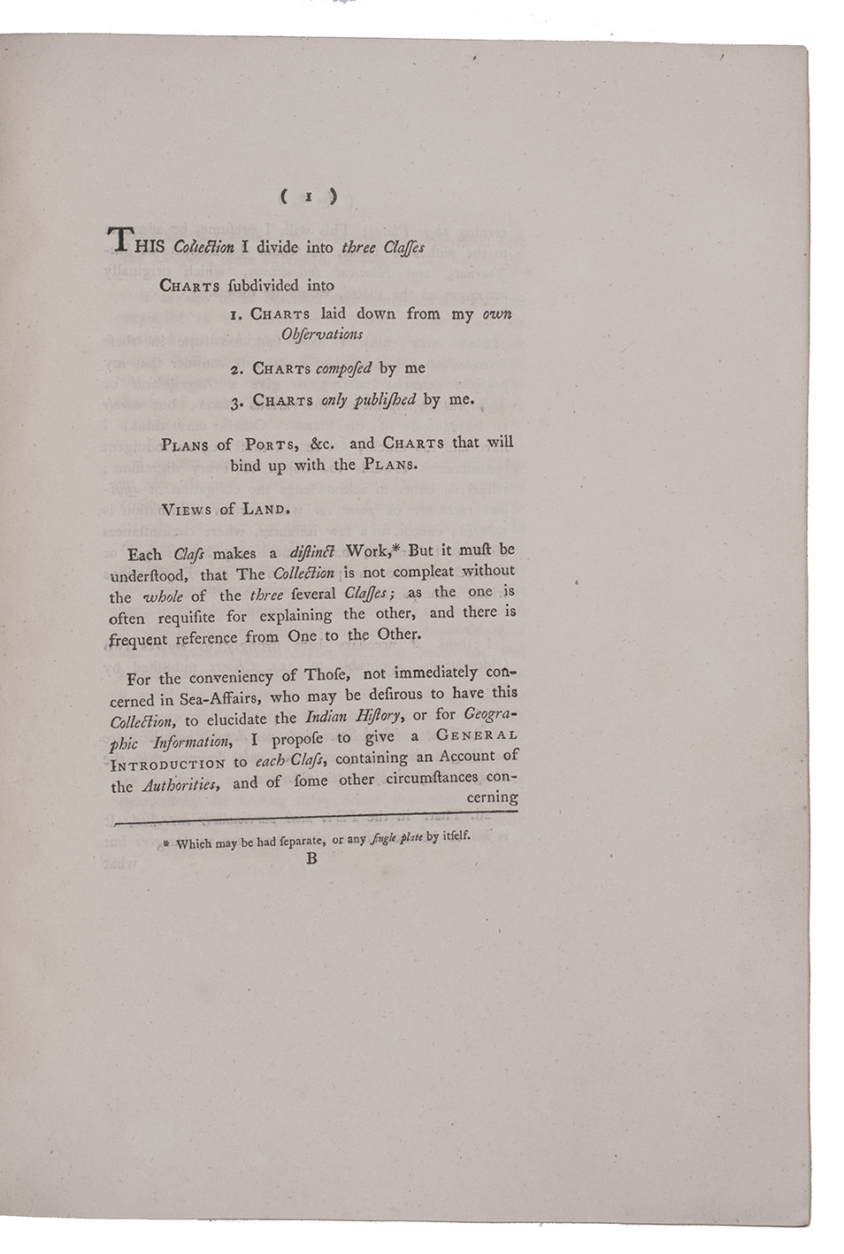 First edition of one the introductions to the newly planned work of the eccentric Scottish geographer Alexander Dalrymple (1737-1808), hydrographer for the East India Company and Captain Cook's leading rival. In 1783 he started to re-arrange his earlier plans, charts and views into a new format, without navigational information, for general sale as a geographical work. The present introduction concerns his nautical publications (mostly annotated ships logs and journals) and despite it being presented as a general geographical work this introduction mostly consists of technical remarks, primarily concerning his advocacy of Arnold's chronometers.