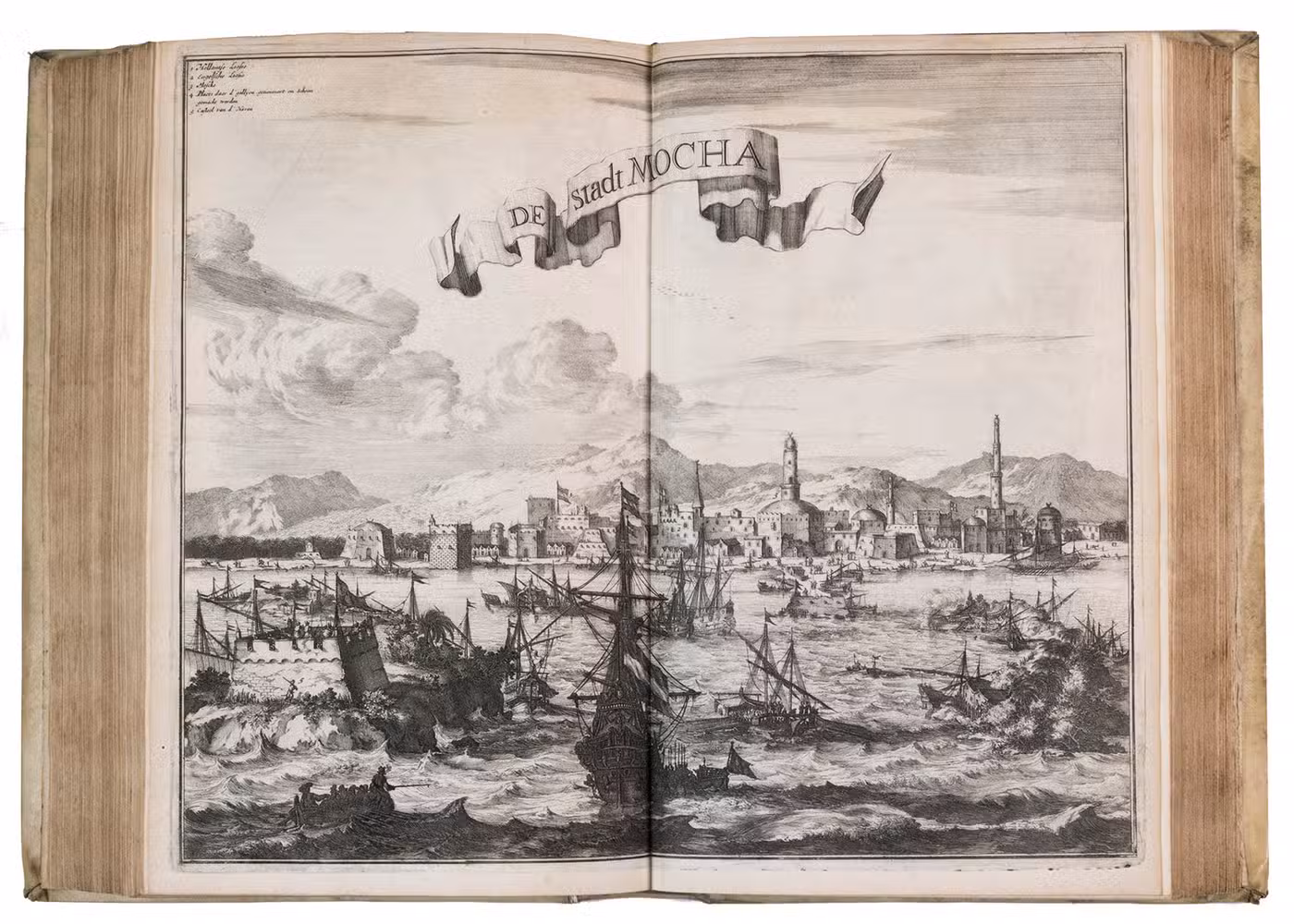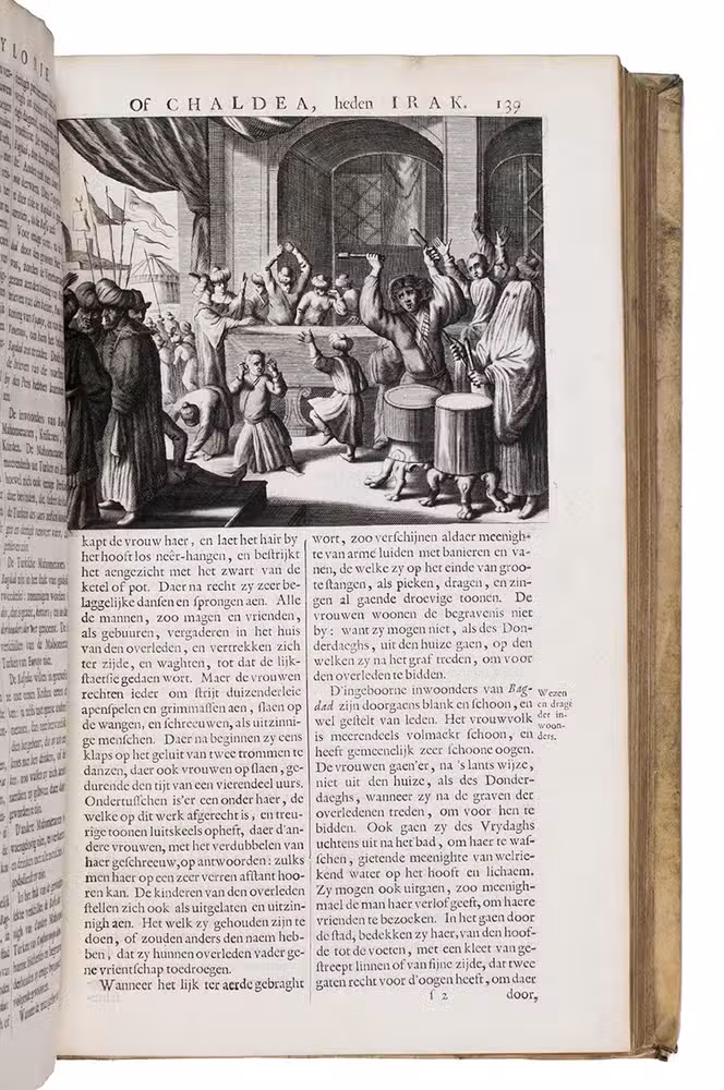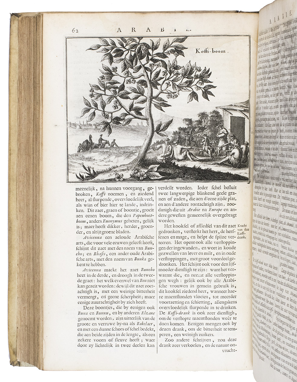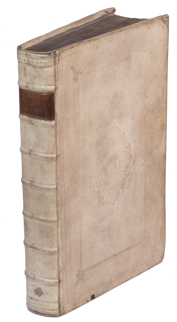 With a damaged library stamp on the title page. The vellum is slightly soiled, the front joint has been restored. A water stain in the upper half of the page in the last third of part 1, page 151 in part 2 was taken from another copy. Otherwise in good condition. Atabey 322; Hage Chahine 1206; Hünersdorff, Coffee, p. 386; Slot, B.J. The Arabs of the Gulf, p. 412; STCN 843116420 (20 copies) Tiele, Bibl. 300; Worldcat 1243774; cf. Blackmer 450 (German ed.).