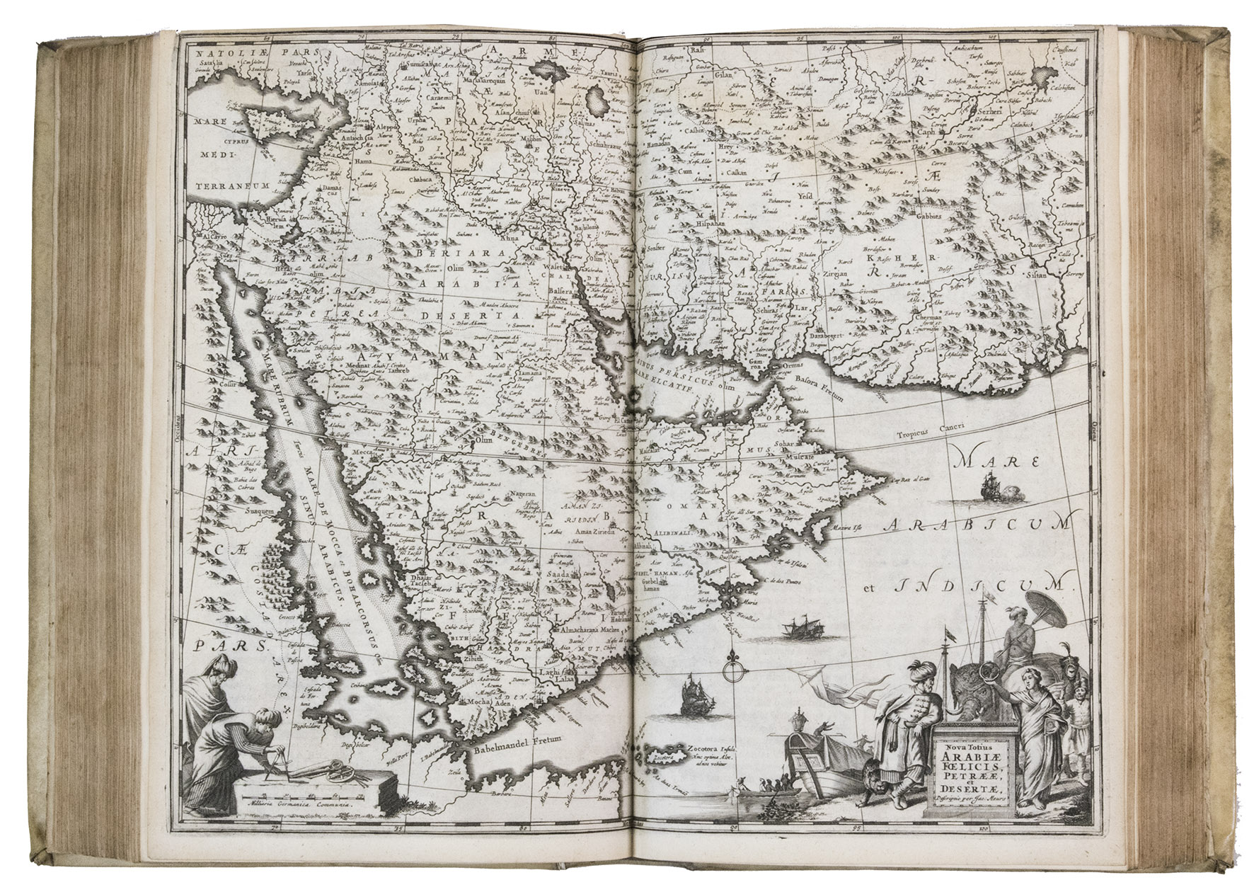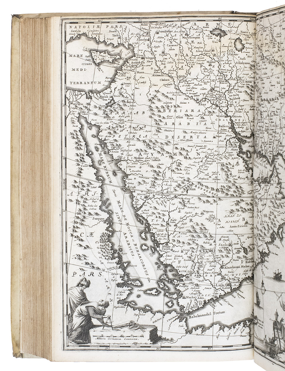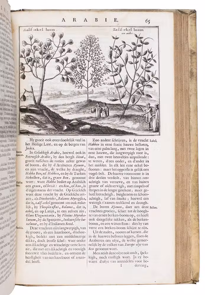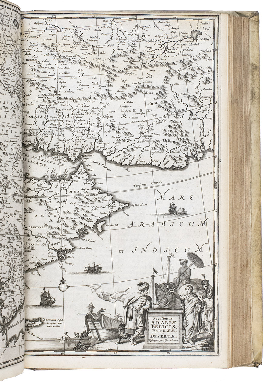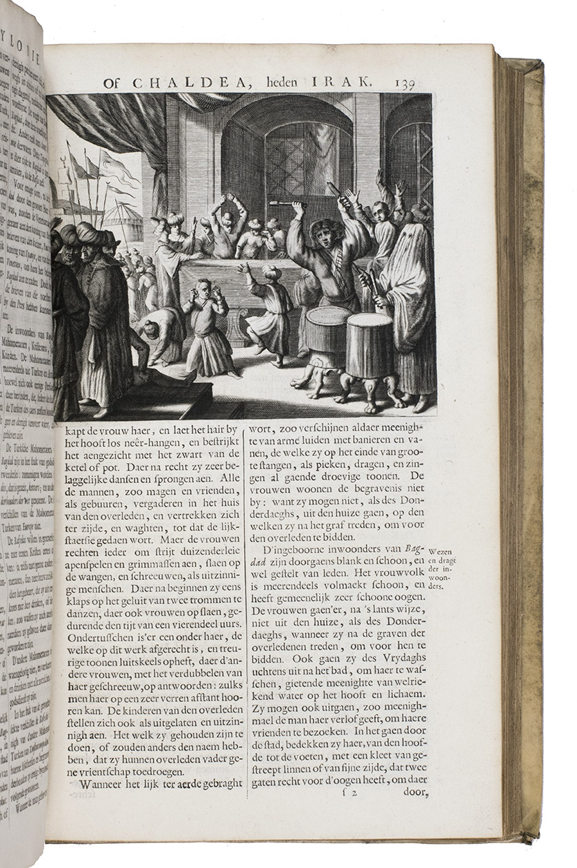 First edition of Olfert Dapper's important description of the Middle East. The first part is devoted to Mesopotamia or Algizira, Babylonia, Assyria and Anatolia, while the second is entirely devoted to Arabia. The work is especially important for the original and new information on Islam, Arabic science, astronomy, philosophy and historiography. Besides a map of Arabia, the fine plates include views of Mount Sinai, Bagdad, Basra, Nineveh, Abydos, Smyrna, Aden, Muscat, Mocha and the Tower of Babel. The second part includes a description of coffee: "In Arabia Felix alone, and in no other place of the whole world, there grows a seed or corn or bean shrub which the Arabs call 'Bon' or 'Ban', of which they prepare a drink by cooking it in water over the fire ..." (part 2, pp. 61-62). The present copy includes a plate showing the plants "Abelmosch", "Semsen" and "Sambak", not called for in the binder's instructions, but included in some copies. The work is dedicated by Dapper to the Amsterdam burgomaster Johannes Hudde, dated 10 December 1679. A translation into German by Joh. Chr. Beer was published in the next year, Umbständliche und eigentliche Beschreibung von Asia (Nurnberg 1681), with the plates copied from this original edition.