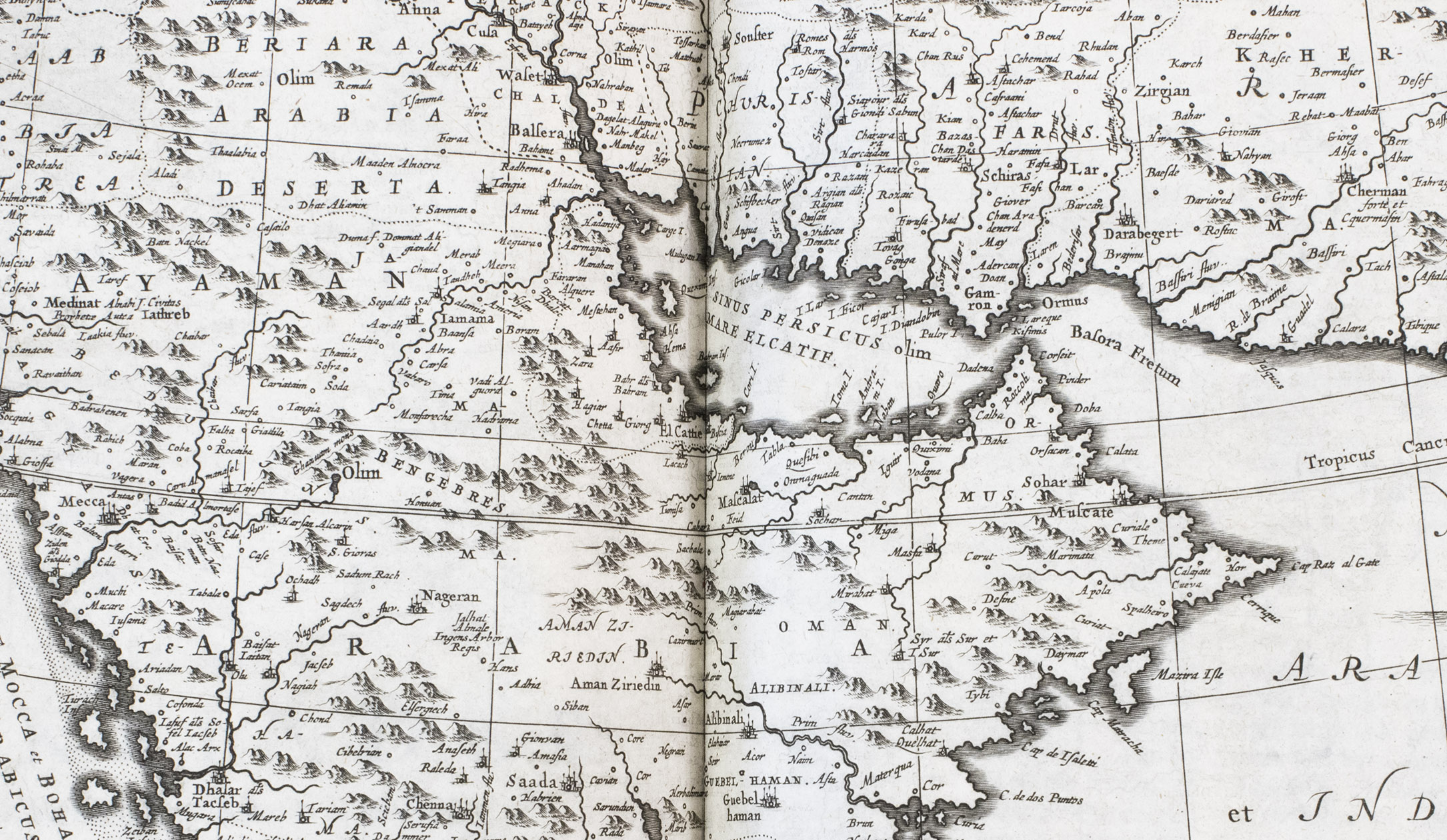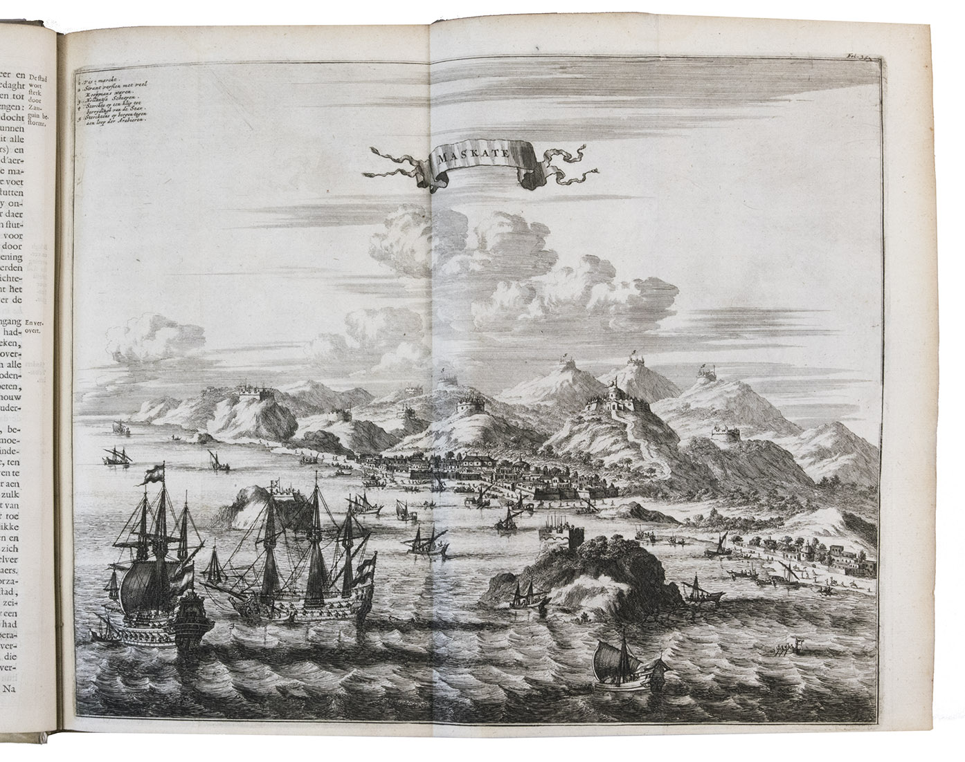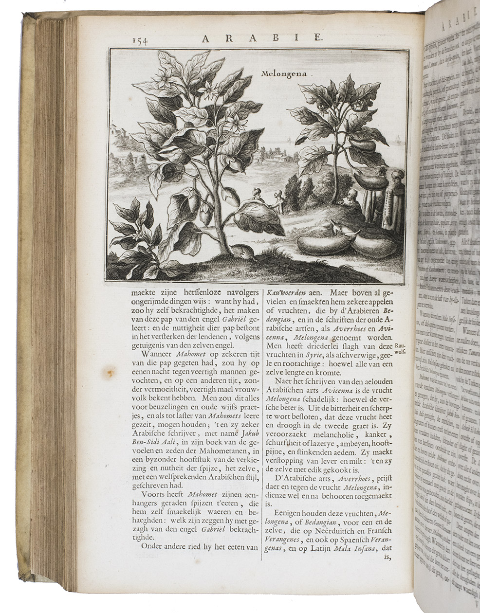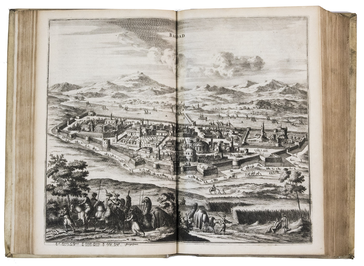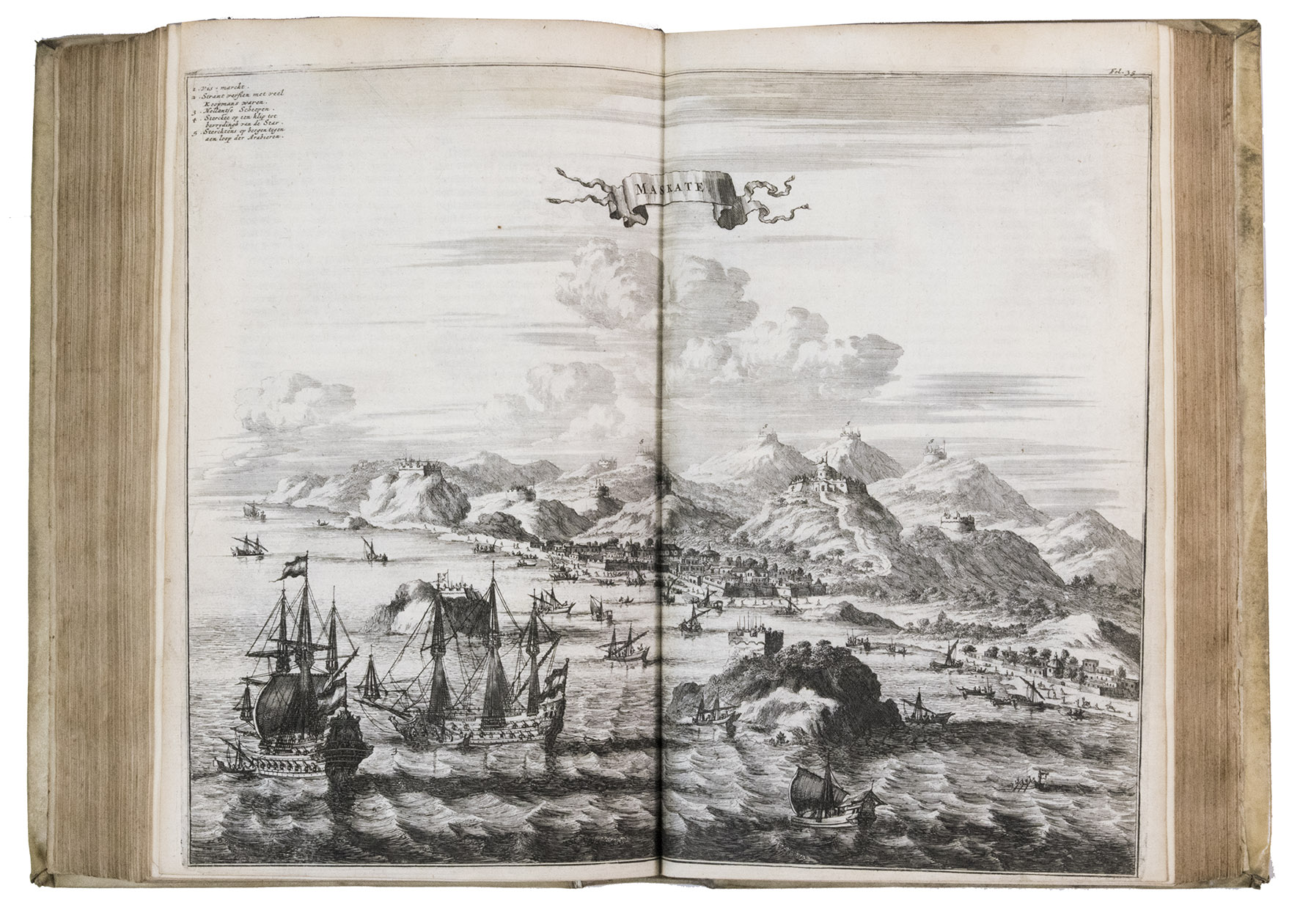 First edition of Olfert Dapper's important description of the Middle East. The first part is devoted to Mesopotamia or Algizira, Babylonia, Assyria and Anatolia, while the second is entirely devoted to Arabia. The work is especially important for the original and new information on Islam, Arabic science, astronomy, philosophy and historiography. Besides a map of Arabia, the fine plates include views of Mount Sinai, Bagdad, Basra, Nineveh, Abydos, Smyrna, Aden, Muscat, Mocha and the Tower of Babel. The second part includes a description of coffee: "In Arabia Felix alone, and in no other place of the whole world, there grows a seed or corn or bean shrub which the Arabs call 'Bon' or 'Ban', of which they prepare a drink by cooking it in water over the fire ..." (part 2, pp. 61-62). The present copy includes a plate showing the plants "Abelmosch", "Semsen" and "Sambak", not called for in the binder's instructions, but included in some copies. The work is dedicated by Dapper to the Amsterdam burgomaster Johannes Hudde, dated 10 December 1679. A translation into German by Joh. Chr. Beer was published in the next year, Umbständliche und eigentliche Beschreibung von Asia (Nurnberg 1681), with the plates copied from this original edition.