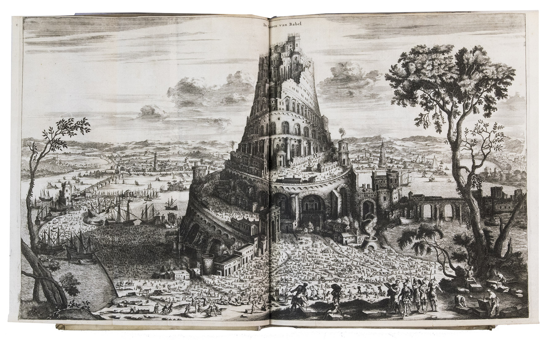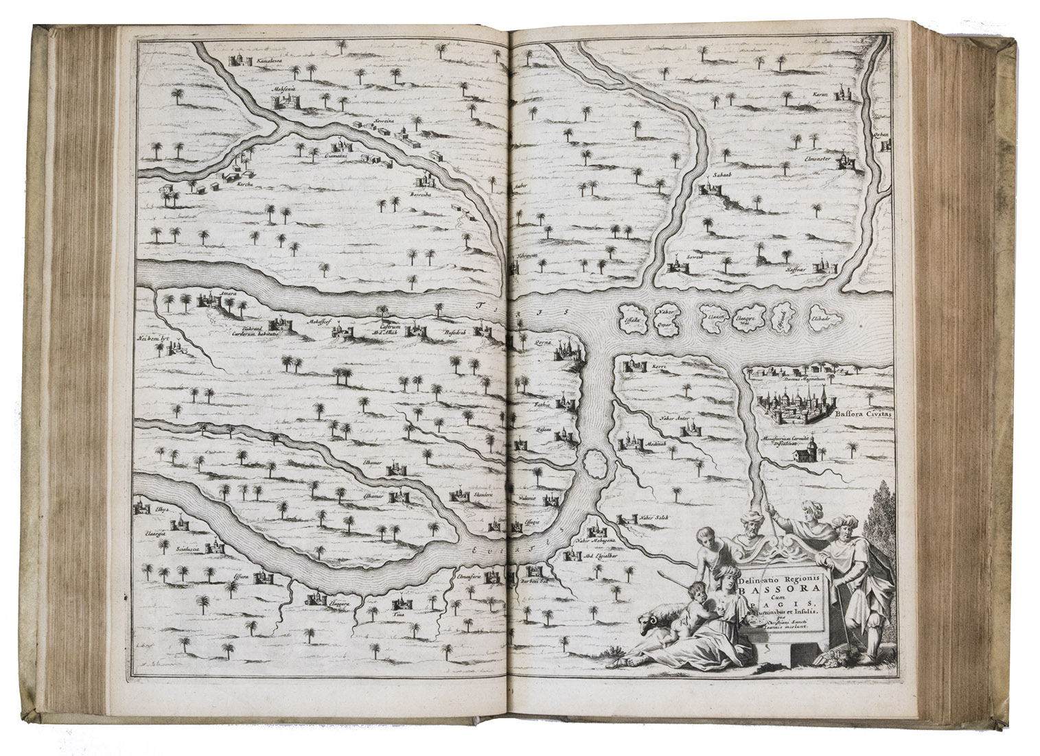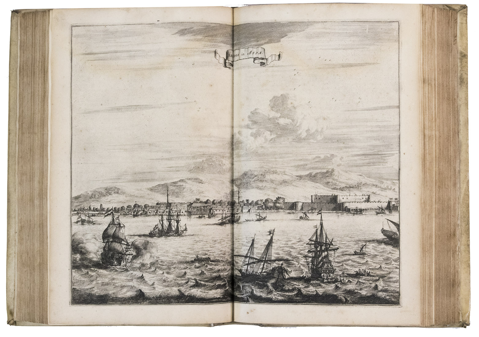 Amsterdam, Jacob Meurs, 1680. 2 parts in 1 volume. Folio. With engraved frontispiece, title-page printed in red and black, 16 engraved views and maps (2 folding, 14 double-page; 4 drawn by Charles Vasteau), and 22 engraved illustrations in the text (3 signed by Johannes Kip), further with 5 woodcut decorated initials (3 series) plus repeats and a woodcut headpiece and tailpiece. Contemporary blind-tooled vellum, gold-tooled title in red morocco to spine. [8], 357, [3], 324, [4] pp.