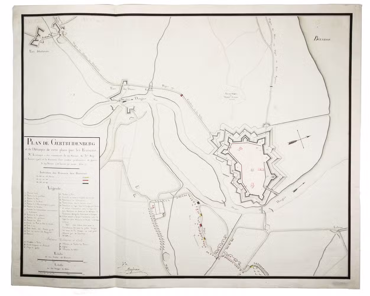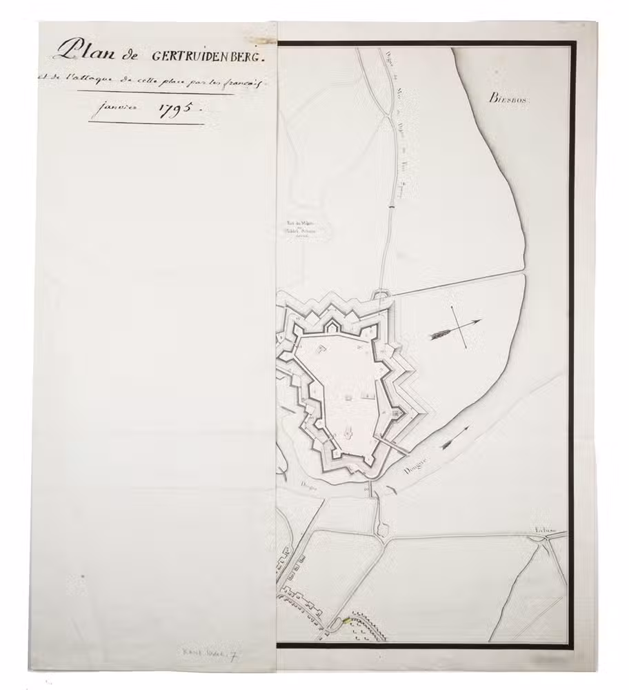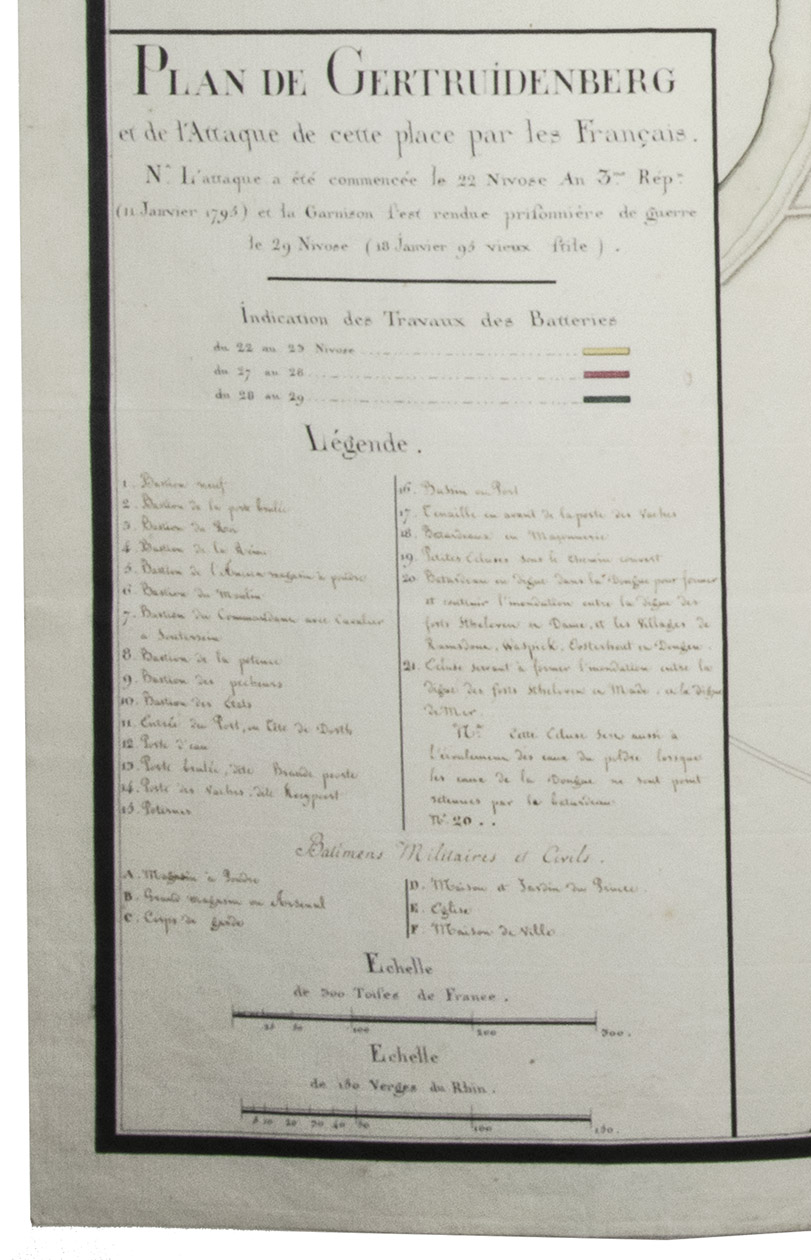 Interesting manuscript map of the fortifications of Geertruidenberg and the attack by the French Revolutionary Army between 11 and 18 January 1795. Signed for approval by Jean-François-Aimé Dejean (1749-1824), a French engineer and commander in the Army of the North, who in 1800 became Inspector-General of fortifications and in 1804 was appointed as Napoleon's Minister of Administration of War.